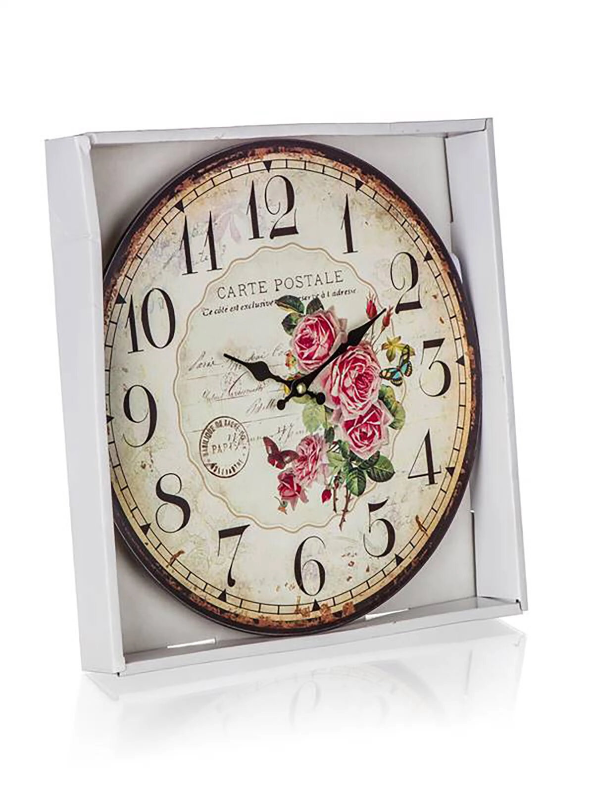 Stylowy zegar ścienny o średnicy 34 cm w designie CARTE POSTALE doda Twojemu wnętrzu uroku starych pocztówek. Cicha praca, czytelna tarcza i łatwy montaż sprawiają, że to praktyczny i dekoracyjny wybór do salonu, sypialni oraz stylowej kuchni.