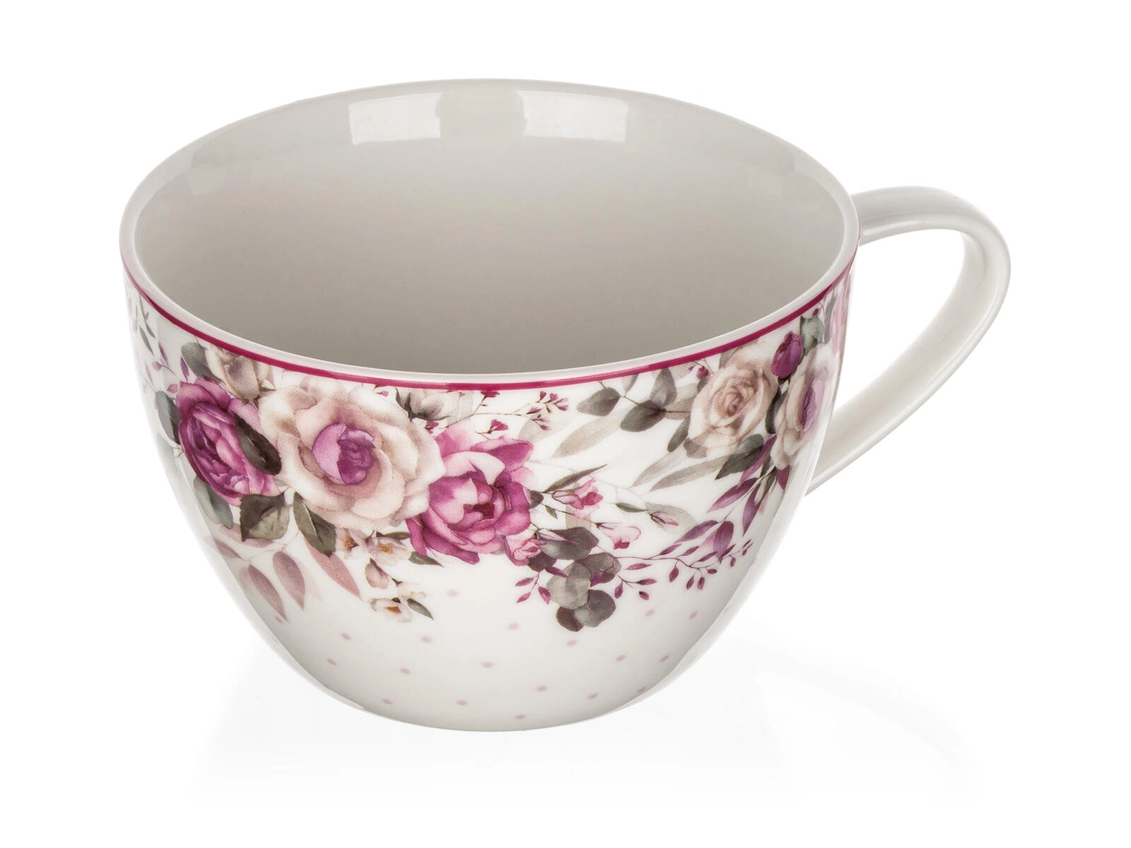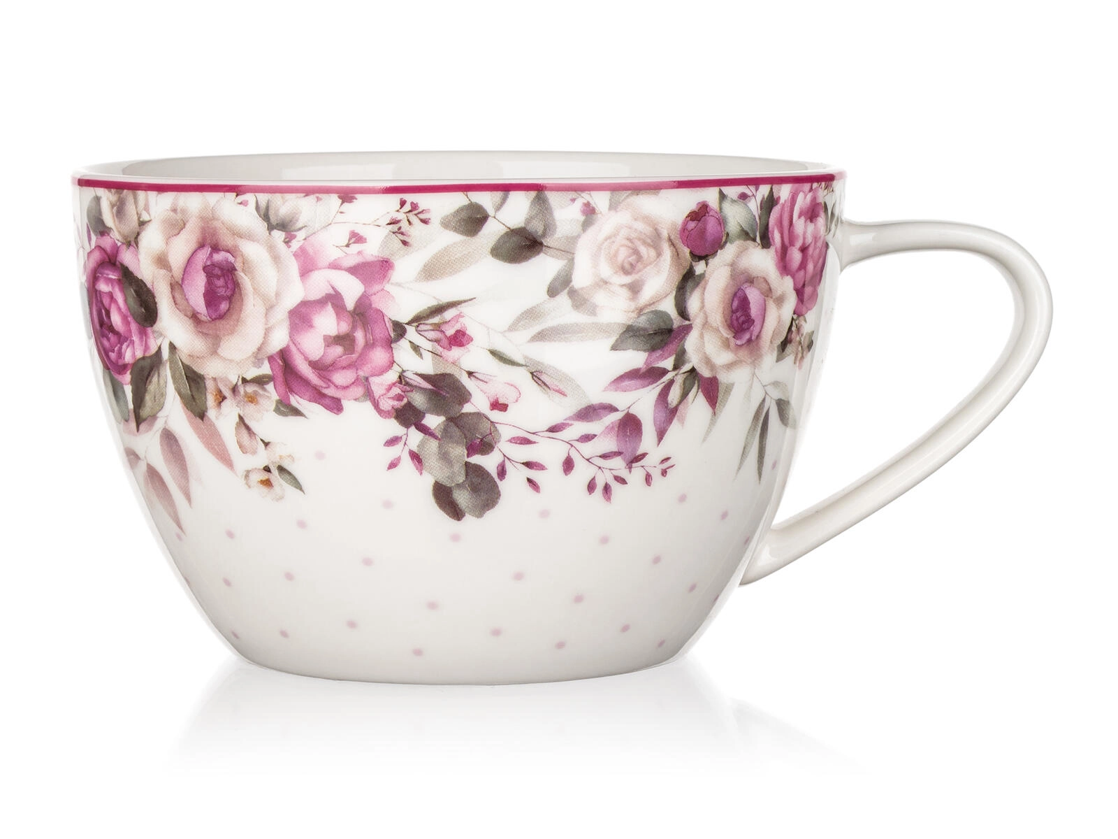 Delikatny motyw róż z różowym rantem dodaje kubkowi stylu i pozwala skomponować zastawę z innymi produktami w tym samym dekorze.