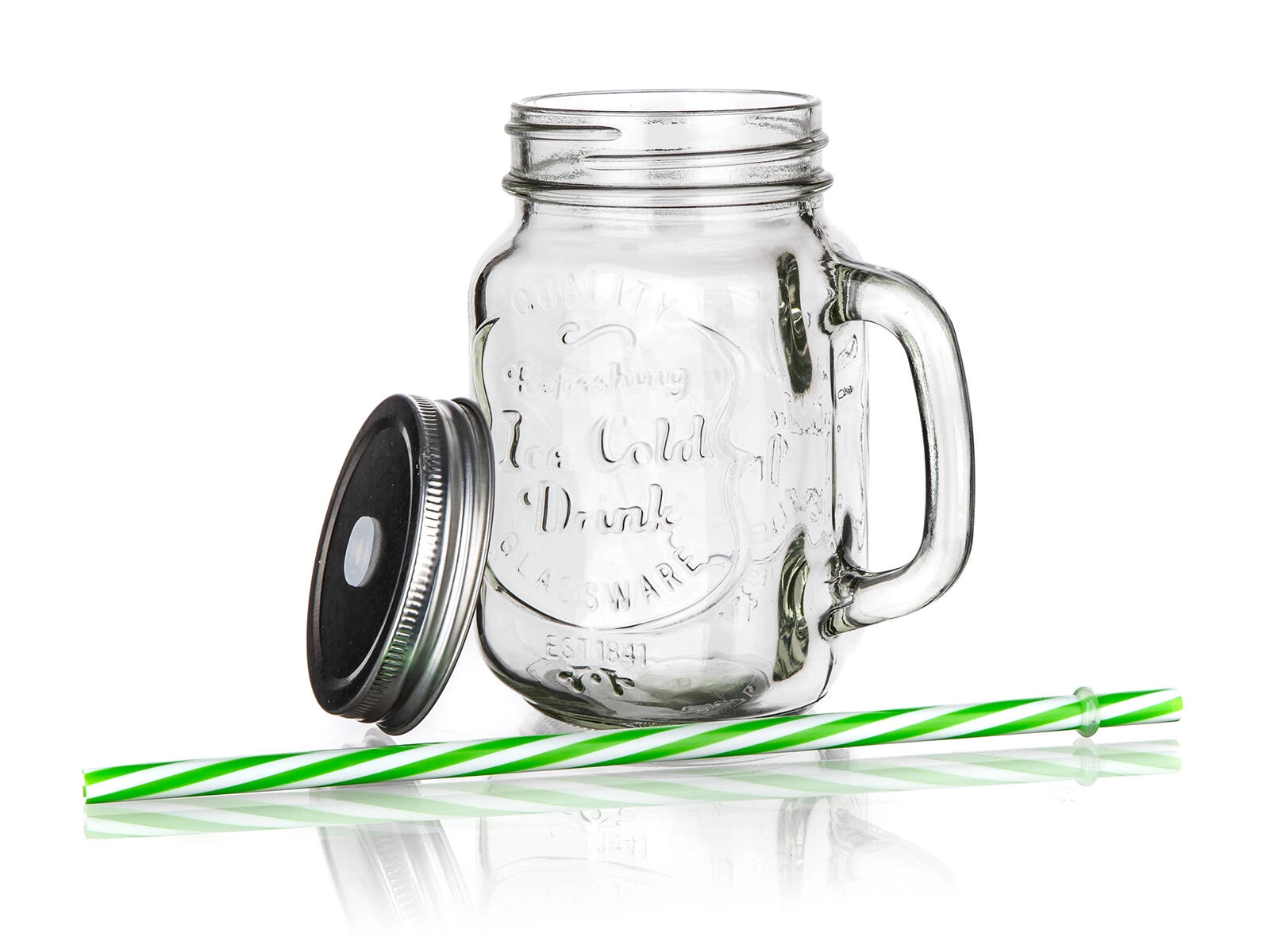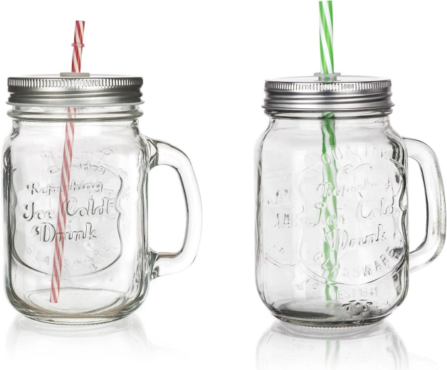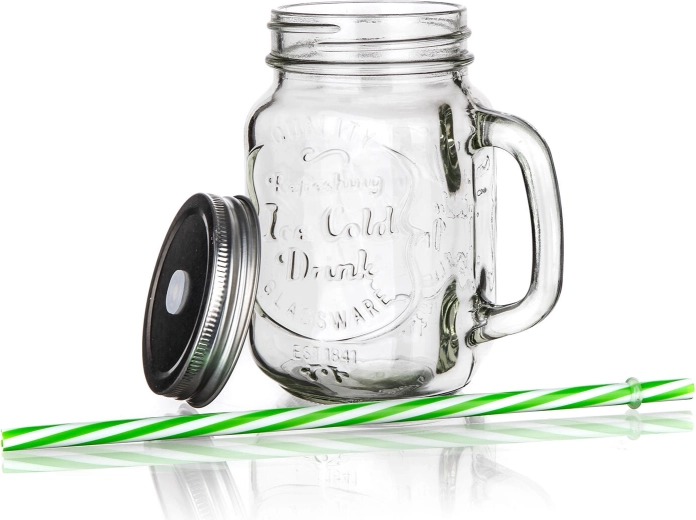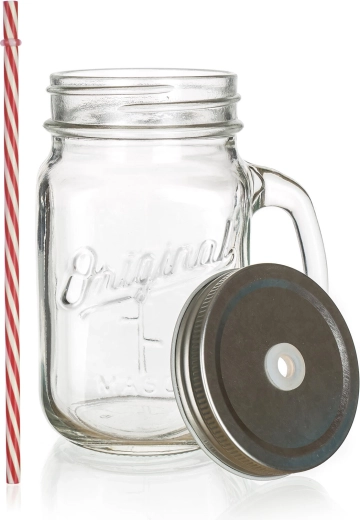 • Trwałe materiały: szkło, metalowa pokrywka i plastikowa słomka do wielokrotnego użytku.
