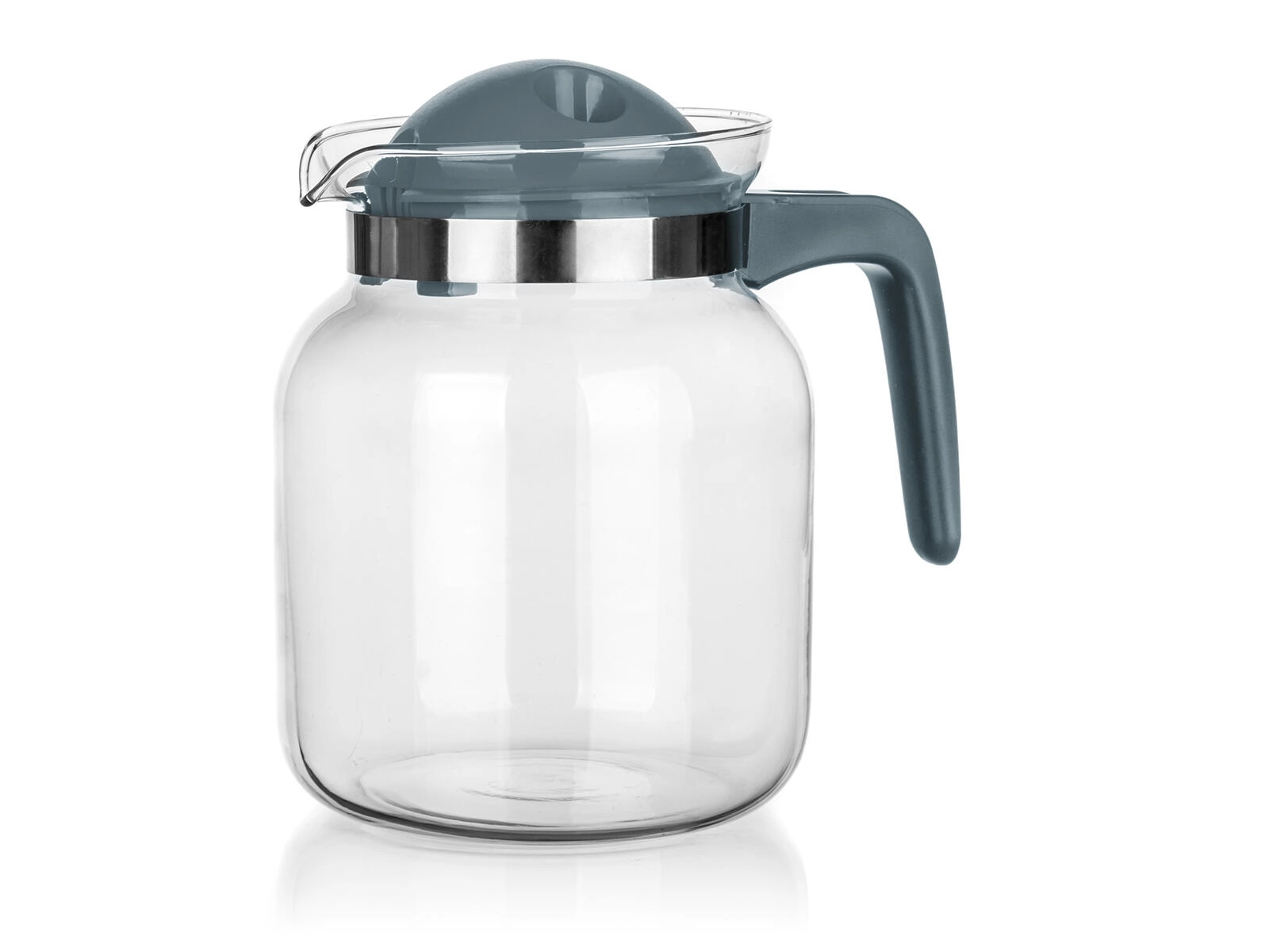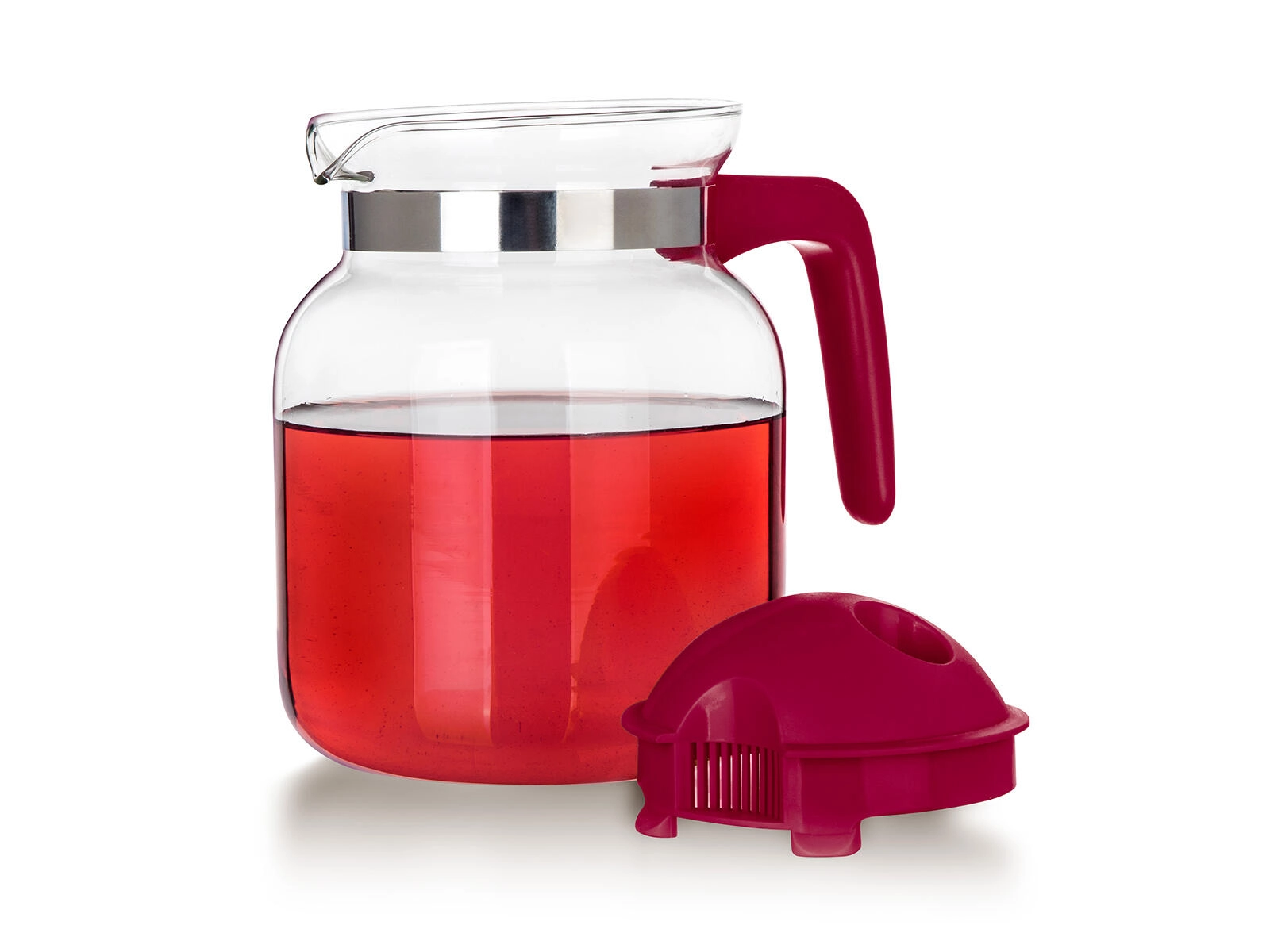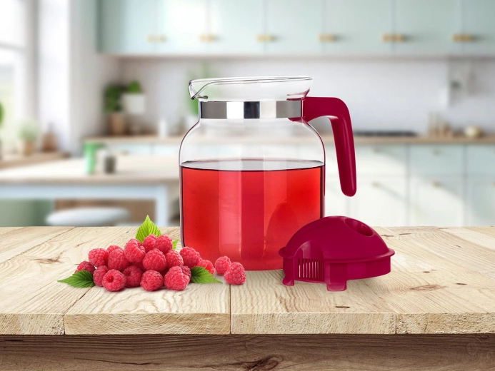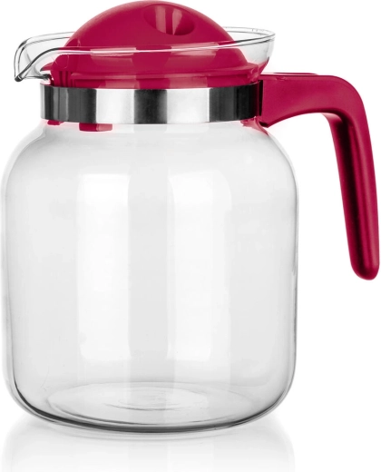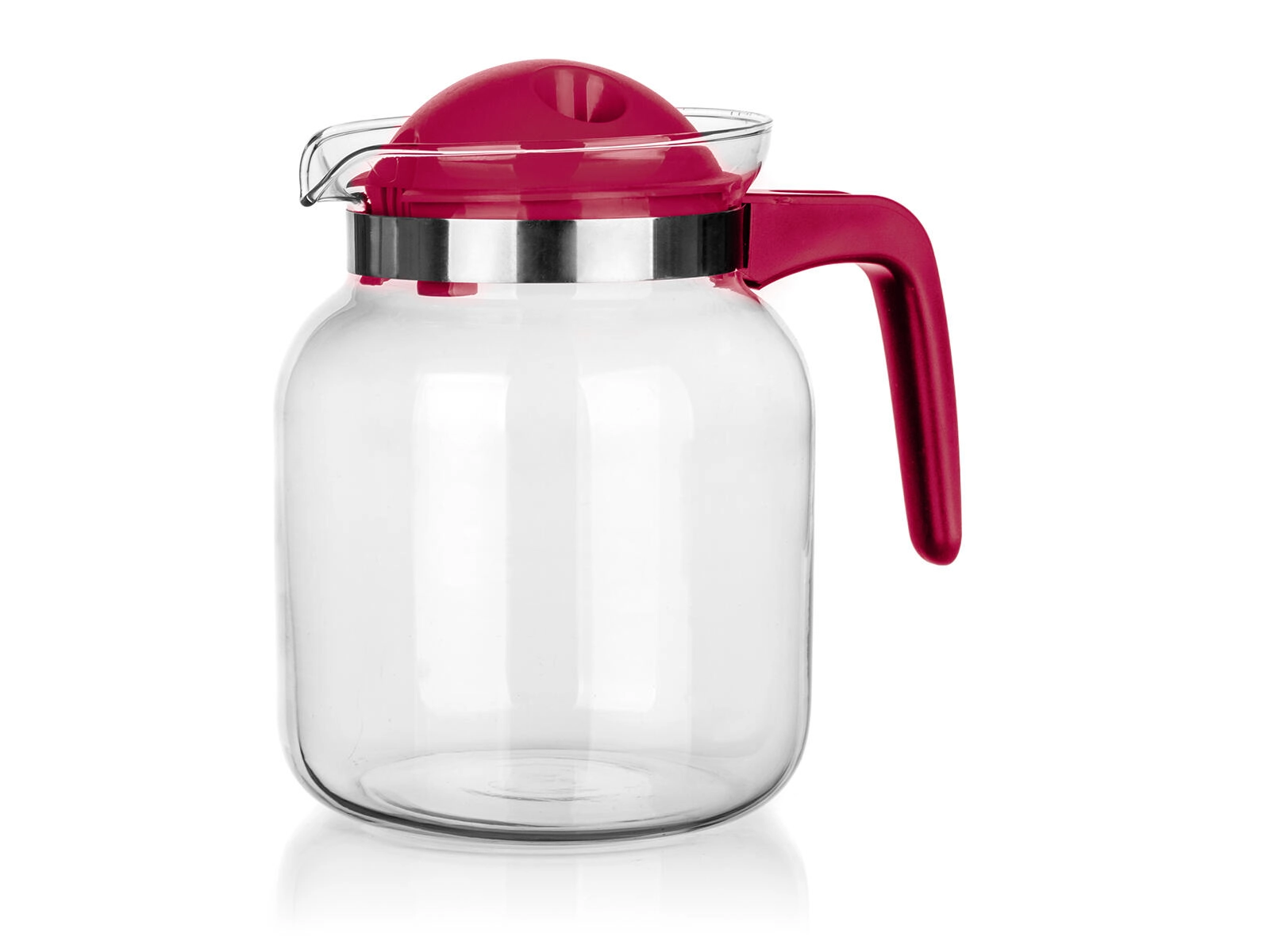 Praktyczny szklany dzbanek o pojemności 1,45 l z plastikową pokrywką i ergonomicznym uchwytem dla wygodnego nalewania. Odporne szkło do 100 °C jest idealne do serwowania herbaty, kawy, wody oraz domowych lemoniad. Dostępny w kolorze szarym i bordowym, z wyjmowaną pokrywką z separatorem/otworami filtrującymi dla czystego i płynnego nalewania.