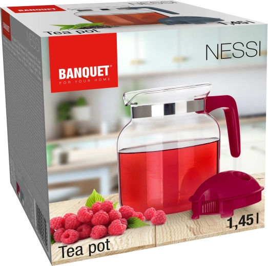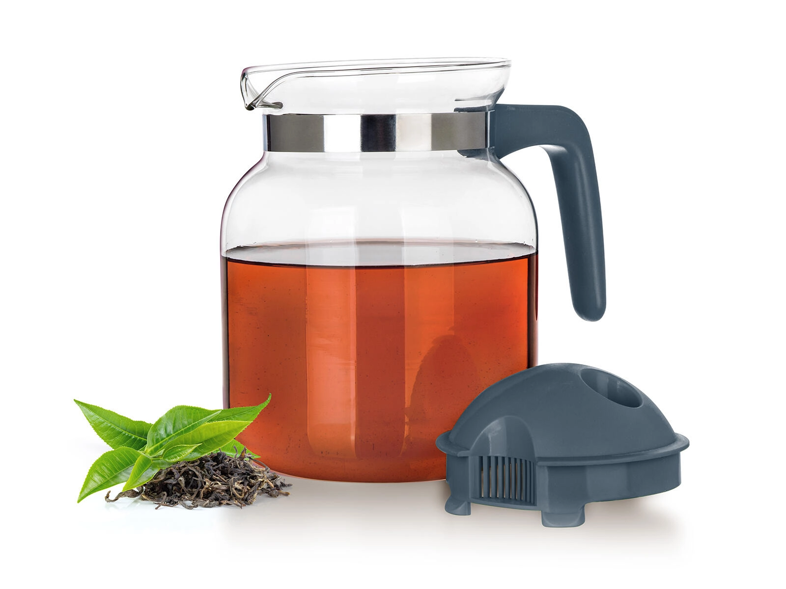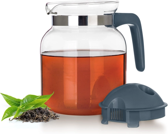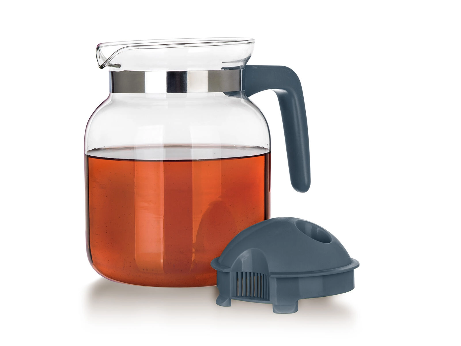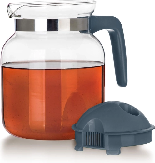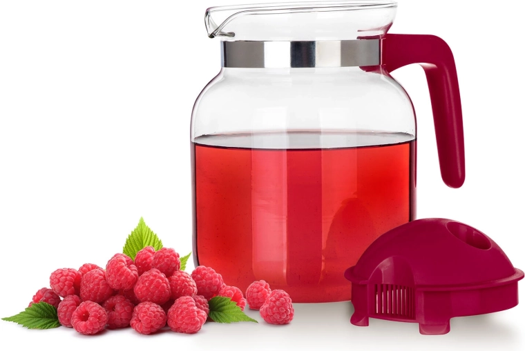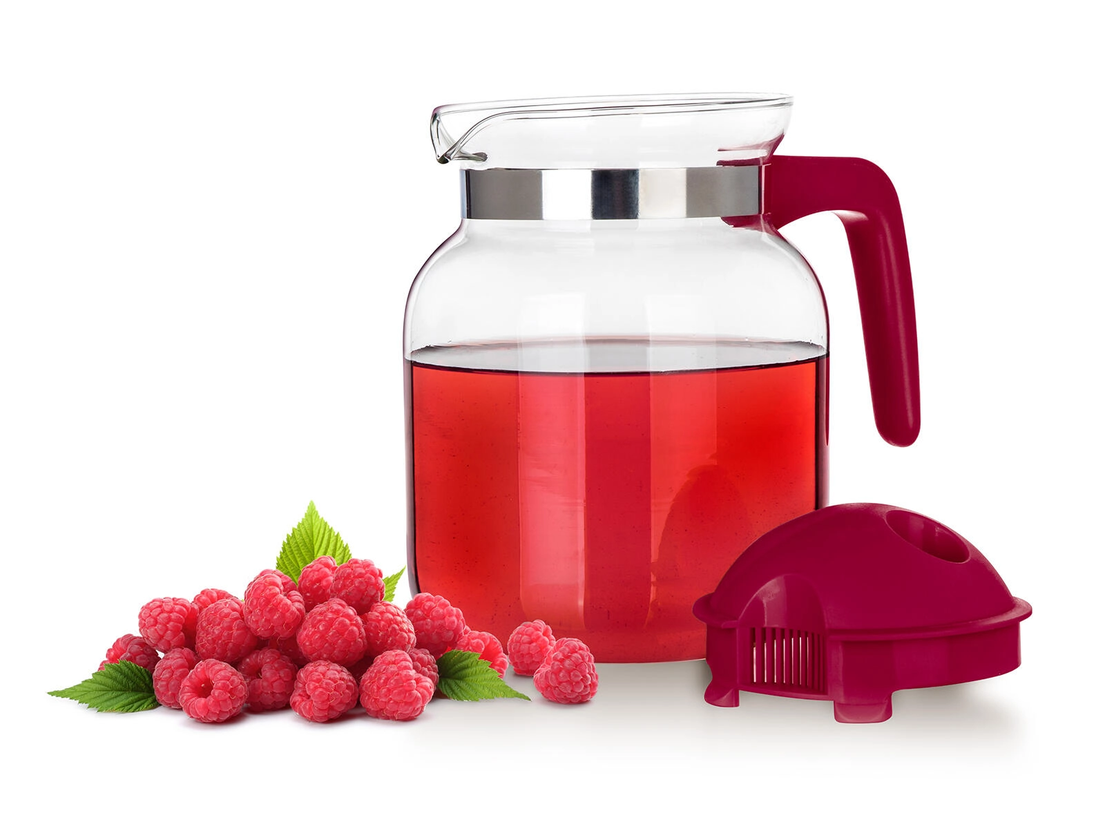 Praktyczny szklany dzbanek o pojemności 1,45 l z plastikową pokrywką i ergonomicznym uchwytem dla wygodnego nalewania. Odporne szkło do 100 °C jest idealne do serwowania herbaty, kawy, wody oraz domowych lemoniad. Dostępny w kolorze szarym i bordowym, z wyjmowaną pokrywką z separatorem/otworami filtrującymi dla czystego i płynnego nalewania.