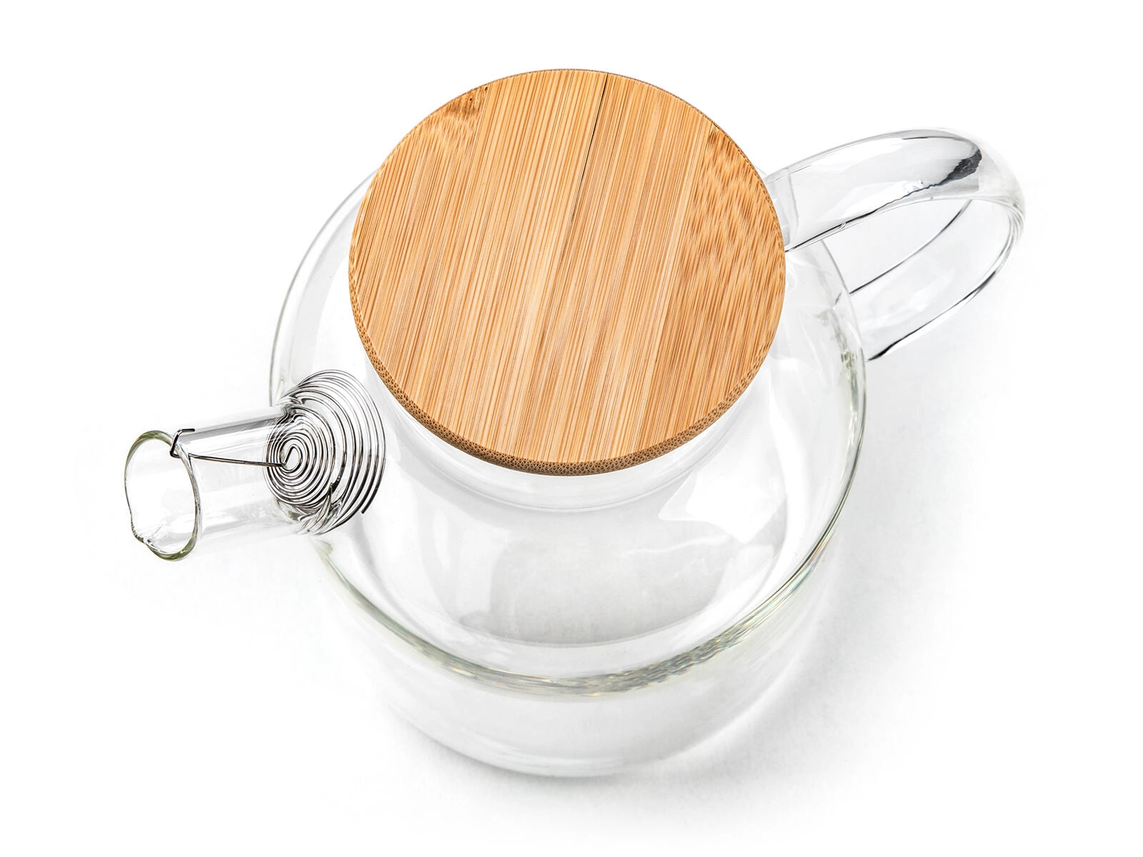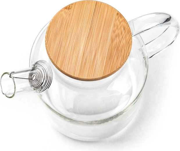 Praktyczne spiralne sitko w wylewce wyłapuje zioła, przyprawy i większe kawałki owoców. Bambusowa pokrywka ze stalową nakładką i silikonową uszczelką pomaga zachować świeży zapach napoju i zapobiega przenikaniu wilgoci oraz zapachów. Szklany pojemnik jest odpowiedni do zmywarki dla łatwej pielęgnacji.