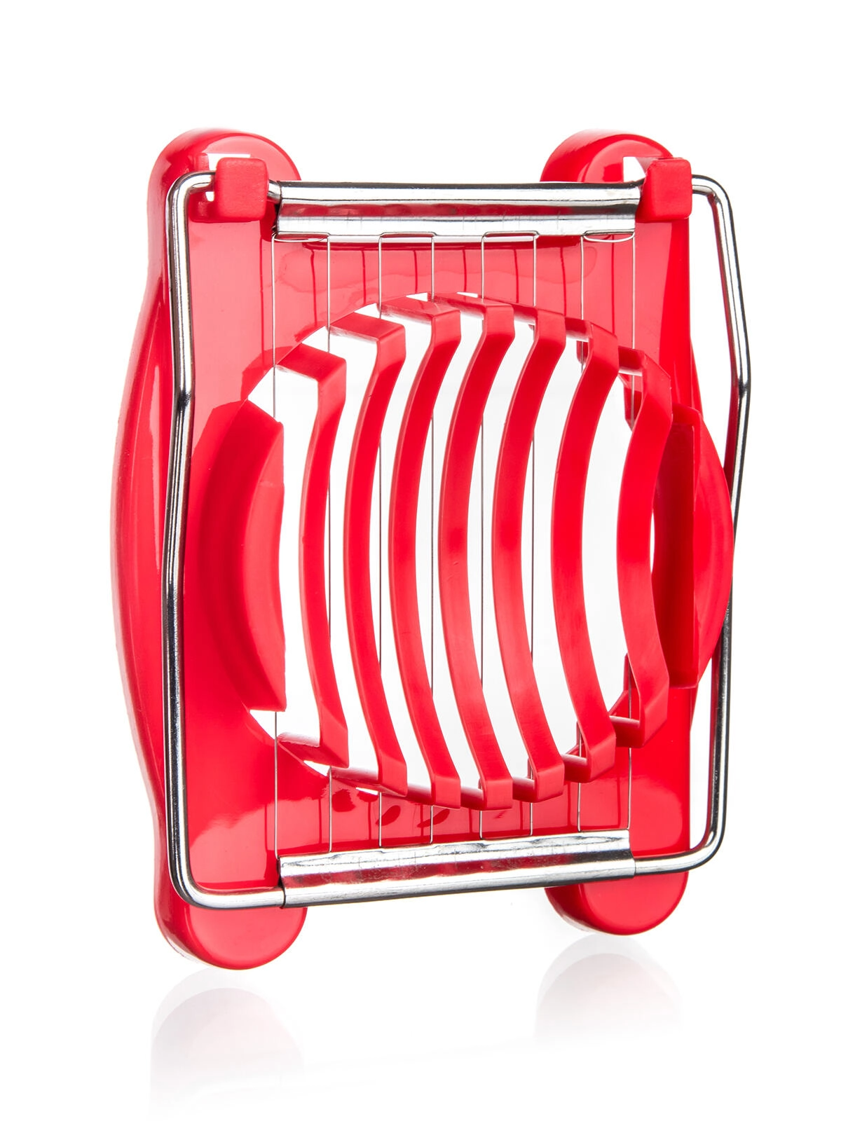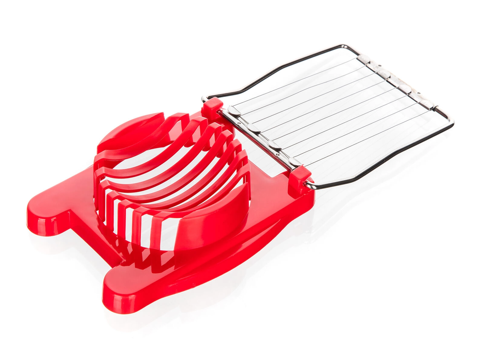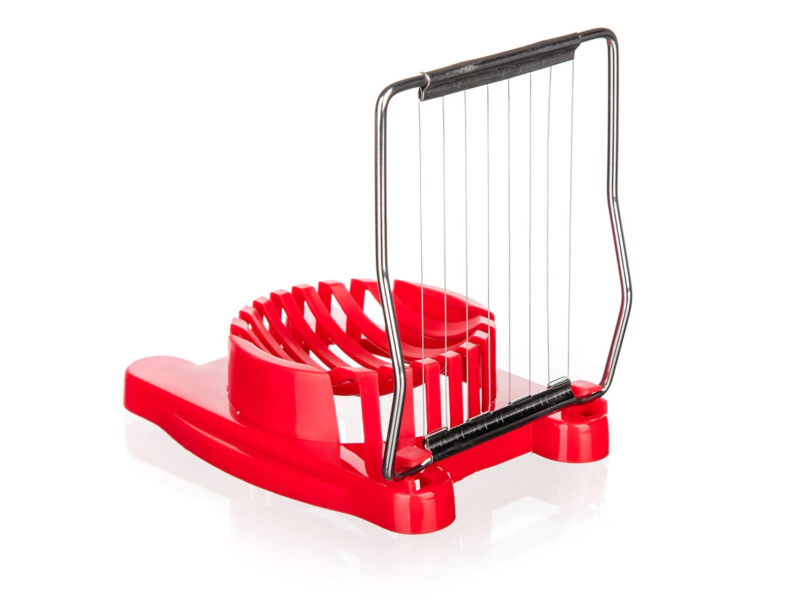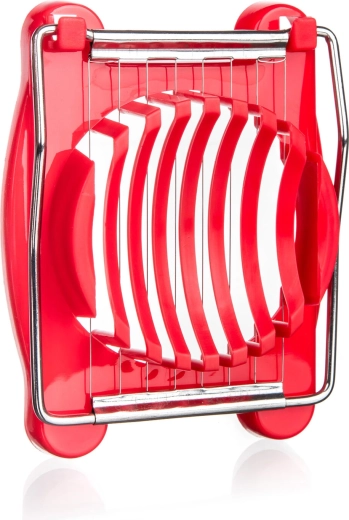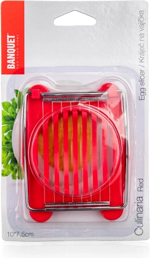 Kompaktowa krajalnica do jajek CULINARIA Red to poręczny pomocnik, który w mgnieniu oka przygotuje równomierne plastry do sałatek, półmisków i kanapek. Stabilna plastikowa kołyska bezpiecznie utrzymuje jajko, a mocne nierdzewne druty wykonują czyste, gładkie cięcia jednym ruchem.