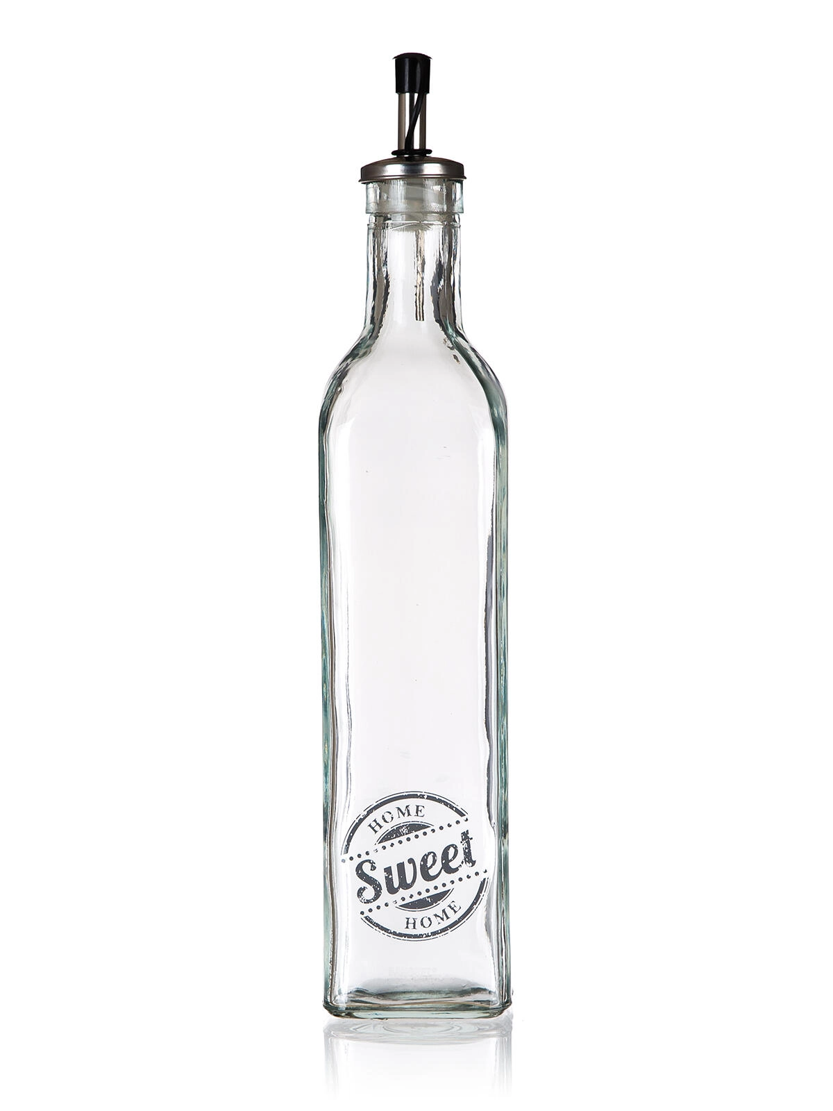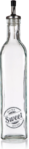 Stylowa szklana butelka na olej z dekorem SWEET HOME o pojemności 500 ml to praktyczny dodatek do każdej kuchni. Ma kwadratowy kształt dla stabilności i wygodnego chwytu, jest wyposażona w metalową nalewkę z plastikowym zamknięciem i uszczelką dla czystego i precyzyjnego dozowania bez kapania.