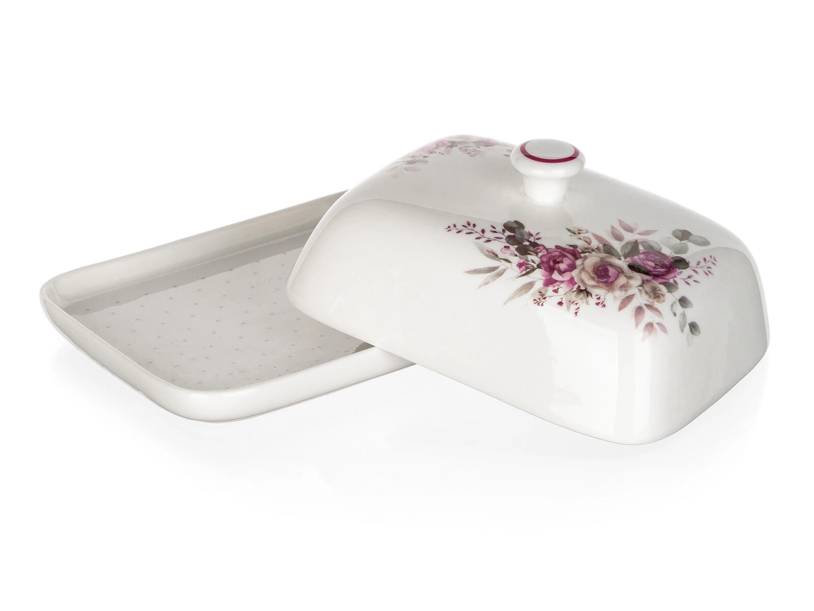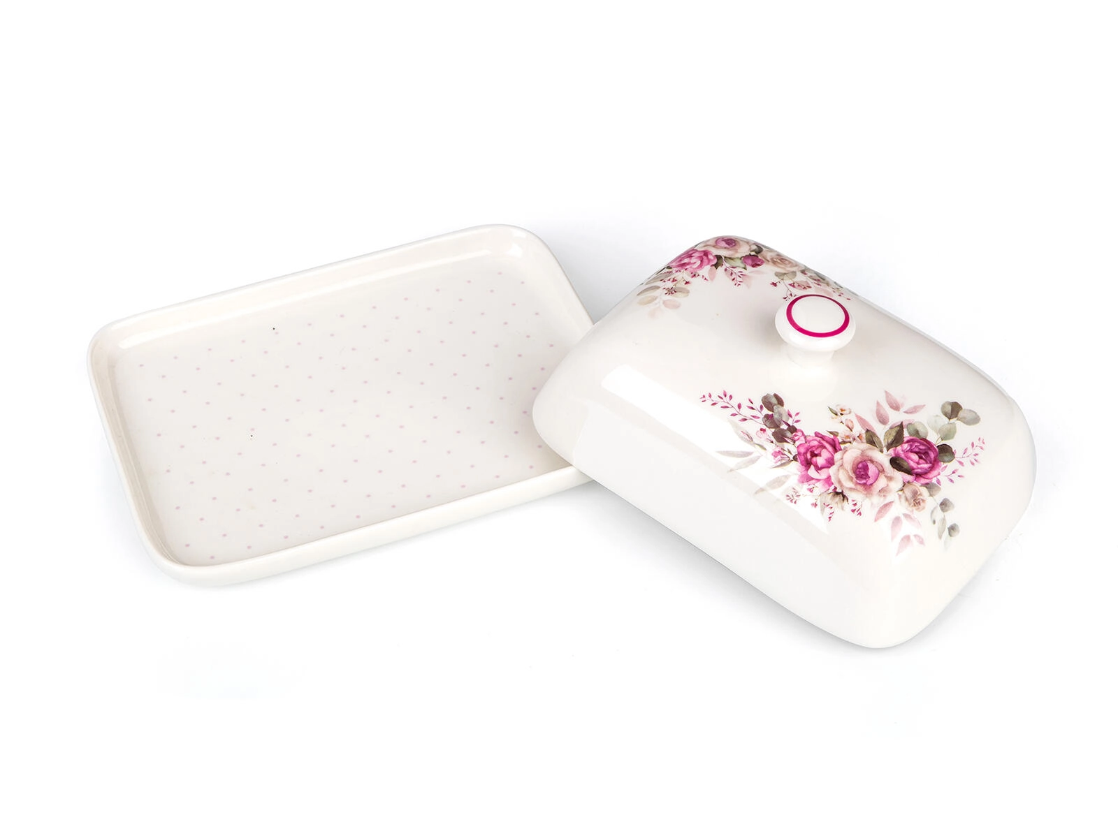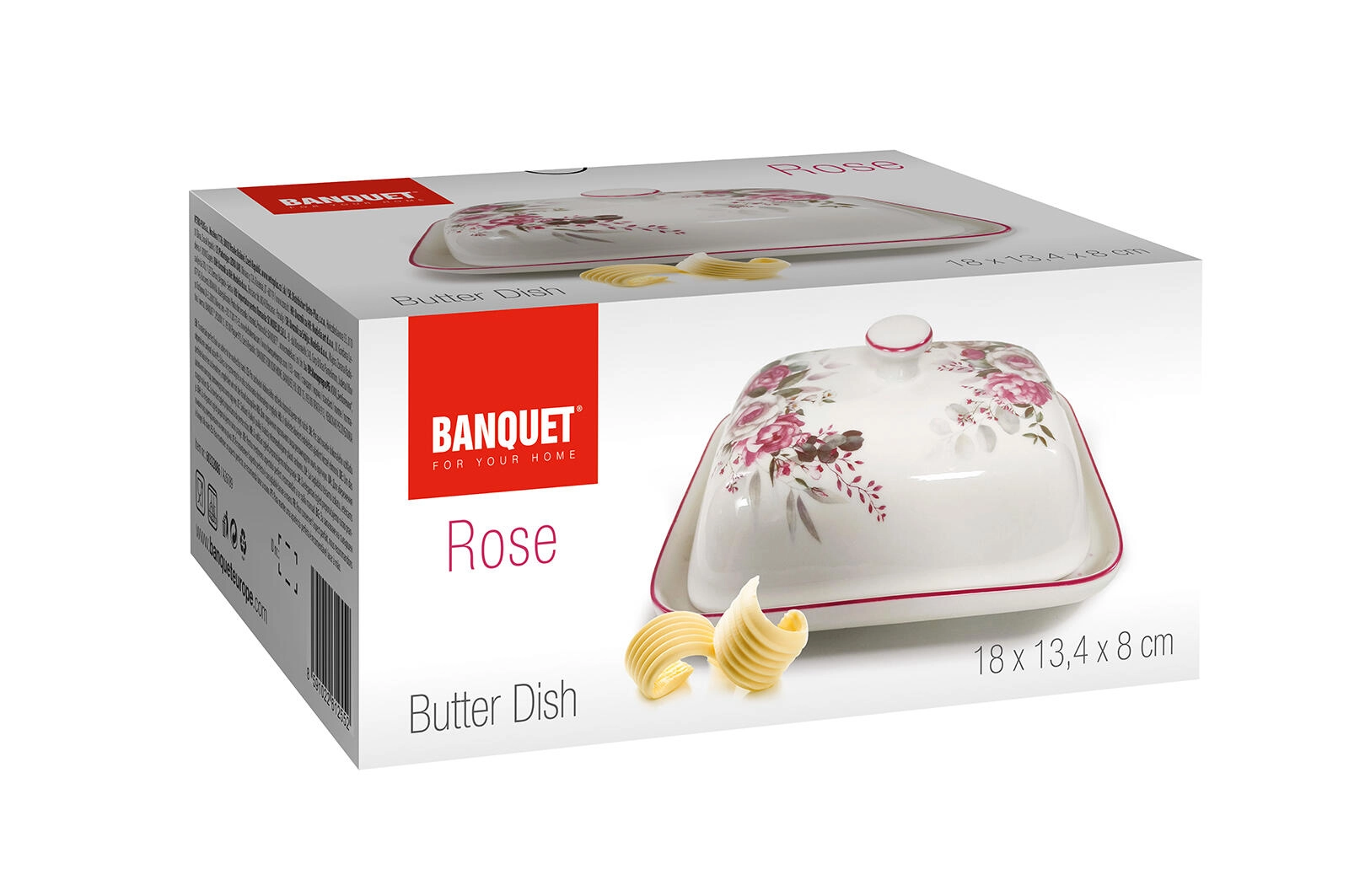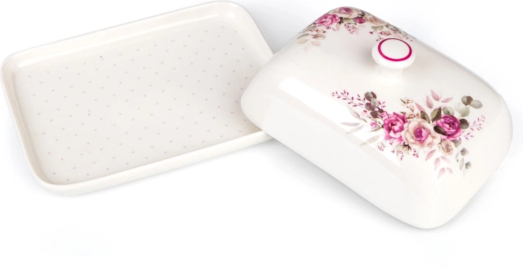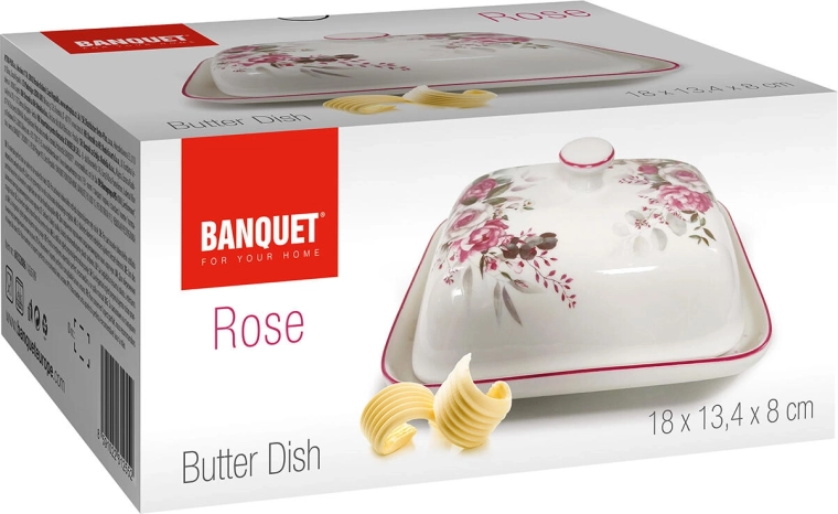 Wprowadź na swój stół ponadczasową elegancję z maselniczką ROSE z wysokiej jakości ceramiki. Dzięki szczelnej pokrywce masło pozostaje chronione przed zapachami i dłużej świeże, a gładka glazura ułatwia czyszczenie. Delikatny motyw róż w pastelowych tonach łatwo łączy się z inną zastawą i ozdobi każde serwowanie.