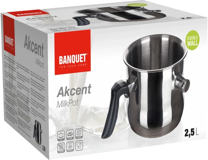 Nierdzewny podgrzewacz do mleka AKCENT o pojemności 2,5 l został zaprojektowany do delikatnego gotowania produktów, które łatwo się przypalają. Podwójna ścianka umożliwia gotowanie w kąpieli wodnej: do zewnętrznego naczynia przez otwór na gwizdek wlewa się wodę, która po osiągnięciu wrzenia uruchamia sygnalizację akustyczną. Gotowanie jest dzięki temu kontrolowane i równomierne.