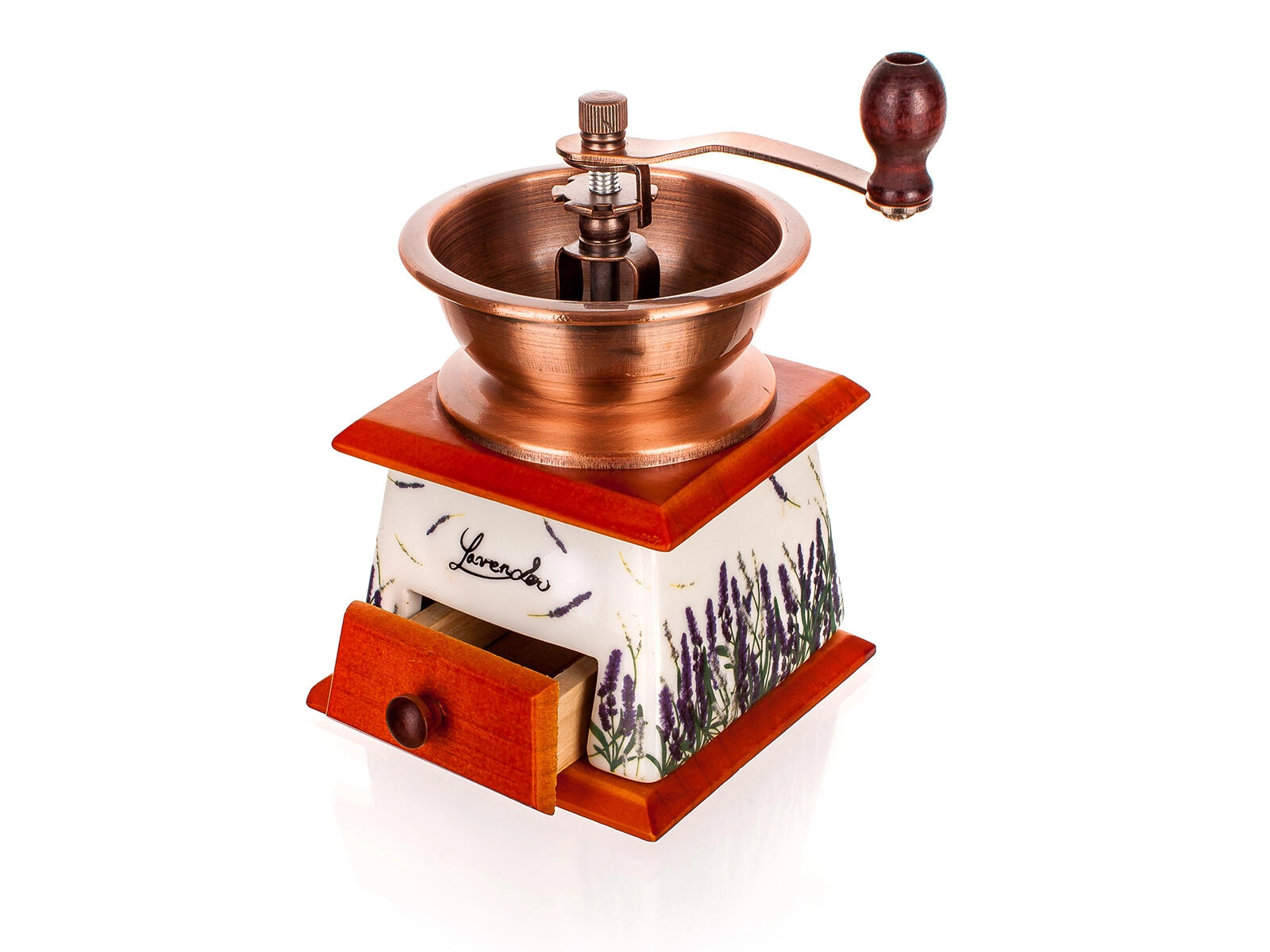 Ten elegancki ręczny młynek do kawy łączy funkcjonalność i design. Ceramiczna część z motywem lawendy doda uroku Twojej kuchni, drewniana podstawa z szufladką ułatwia zbieranie zmielonej kawy, a metalowy lejek z korbką zapewnia płynne mielenie. Dzięki regulowanemu ceramicznemu mechanizmowi łatwo dobierzesz drobność mielenia do espresso, kawy filtrowanej czy french pressu.