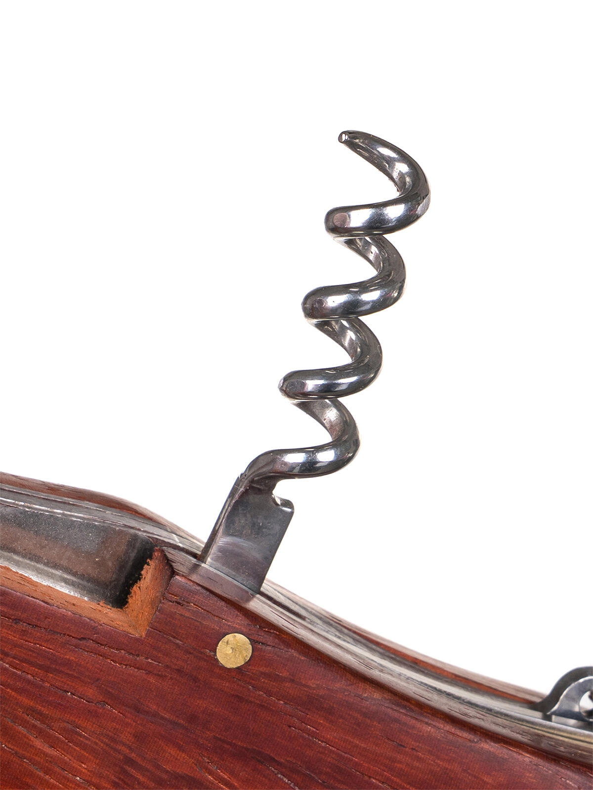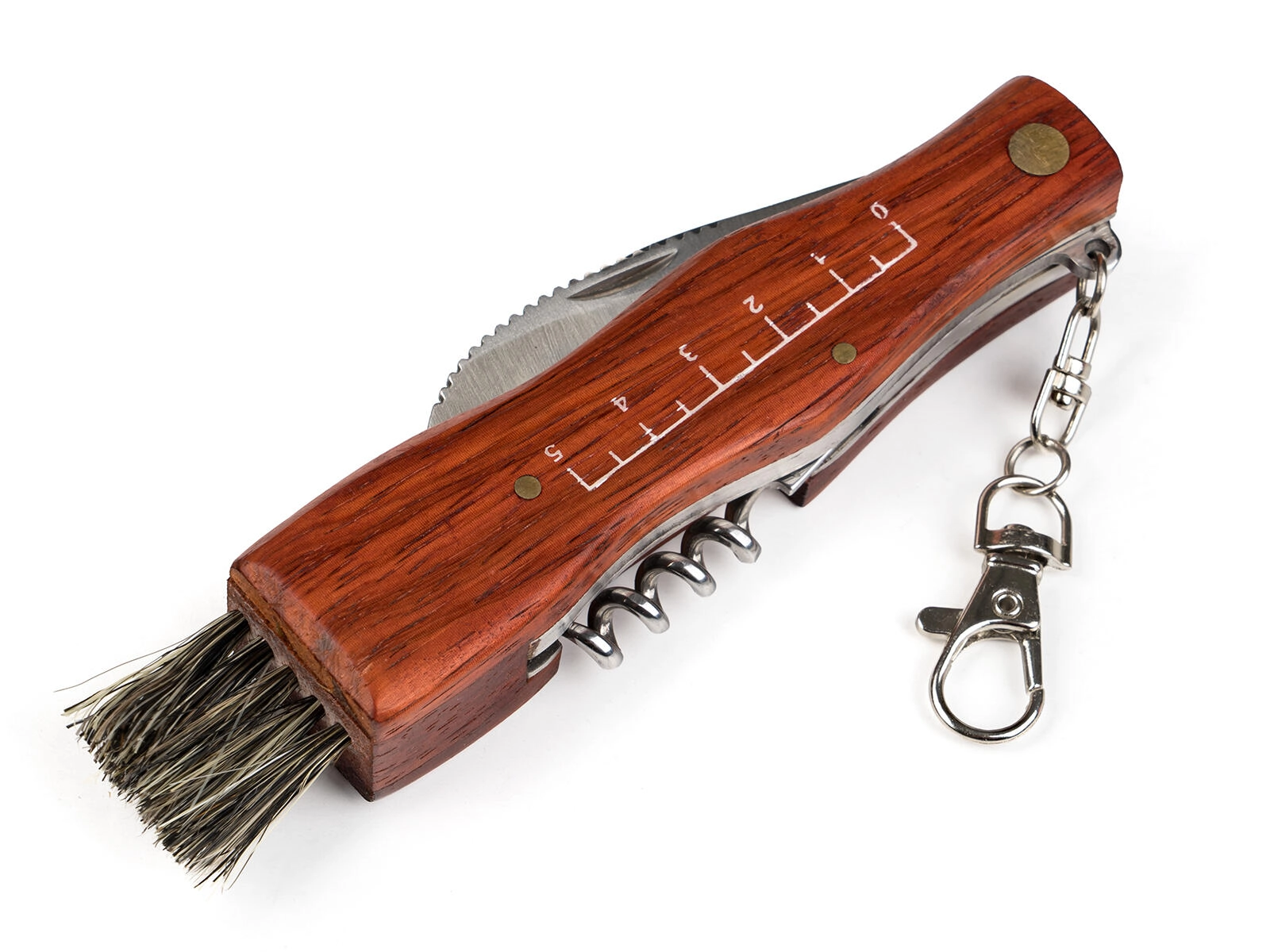 Drewniana rękojeść zapewnia wygodny chwyt i trwałość, a składane wykonanie gwarantuje bezpieczne i kompaktowe przenoszenie. Nie brakuje też korkociągu, który przyda się w podróży i na piknikach.