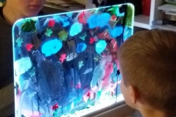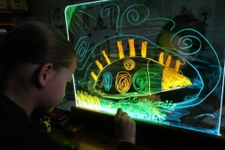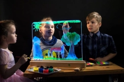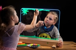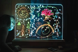 Rozświetl dziecięcą wyobraźnię. Świetlna tablica Jonely z wytrzymałą płytą z hartowanego szkła pozwala malować farbami wodnymi, palcami oraz zmywalnymi pisakami. Powierzchnia łatwo się czyści, a dzięki możliwości rysowania z obu stron zabawa będzie wspólna także dla rodzeństwa. Zintegrowane diody LED w dolnej ramie pięknie podświetlą każdy ruch i zamienią obrazki w lśniące dzieła.