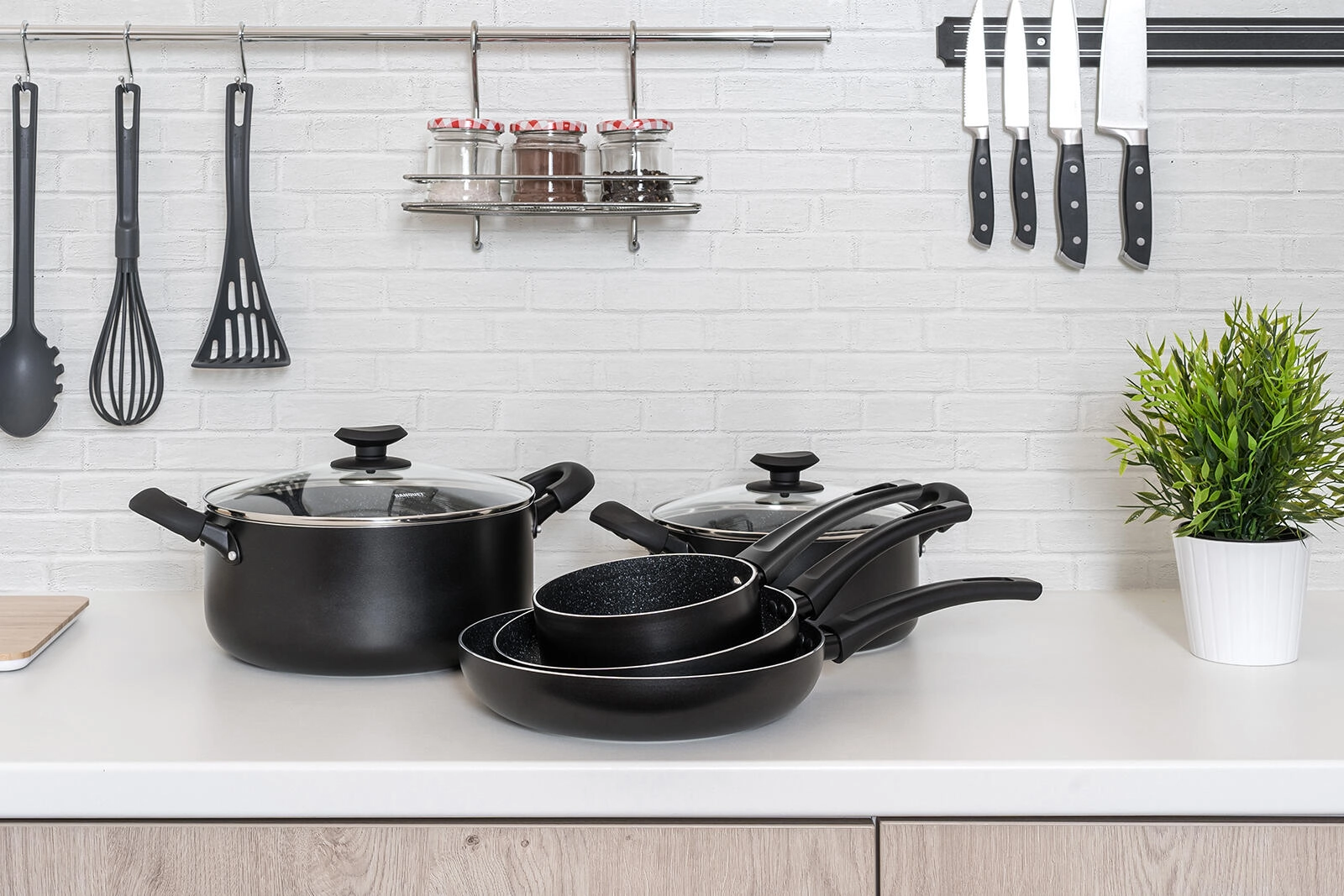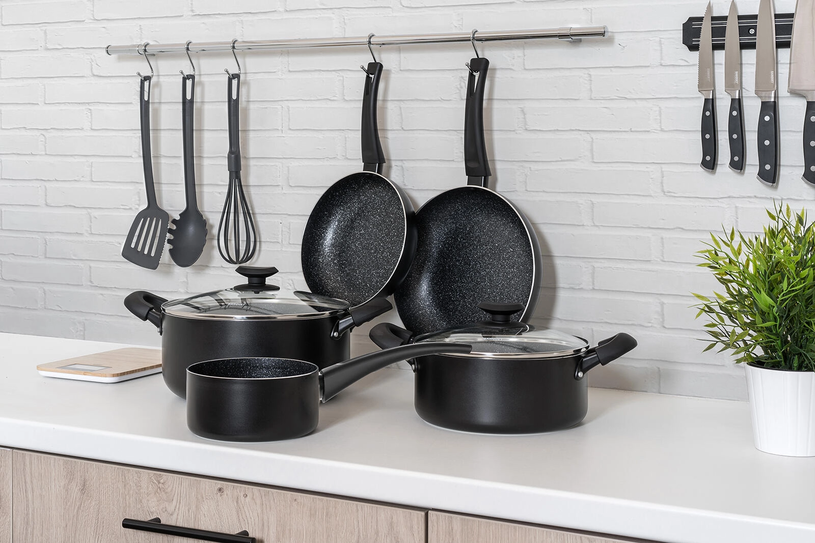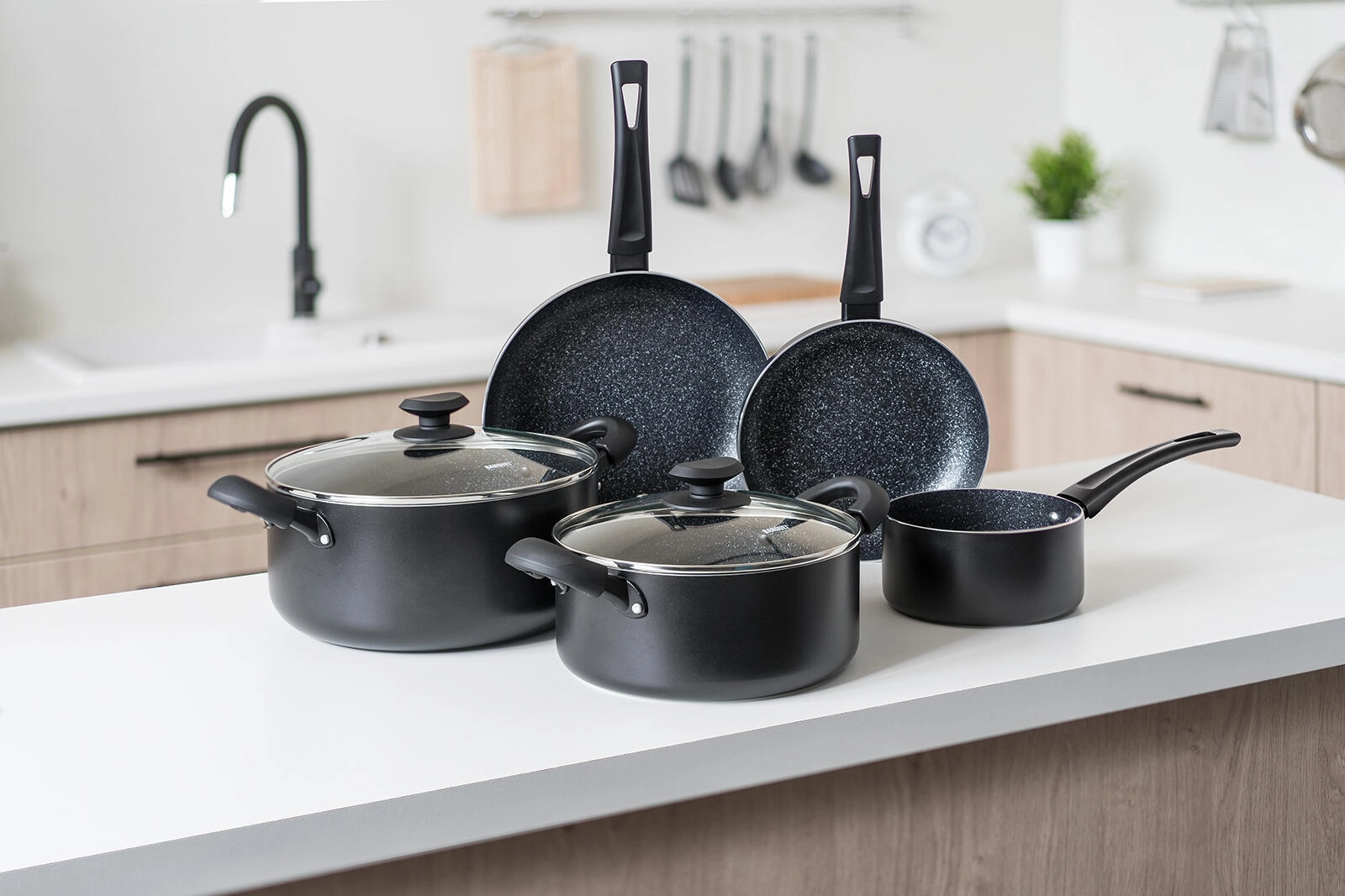 Zestaw naczyń BLACK STONE w eleganckiej czerni obejmuje codzienne gotowanie od szybkiego podsmażania po powolne duszenie. Odlewane aluminium o wysokiej przewodności cieplnej szybko się nagrzewa i długo utrzymuje temperaturę, dzięki czemu gotujesz szybciej i oszczędniej. Wyjątkowo trwała, nieprzywierająca powłoka zapewnia łatwe uwalnianie potraw i łatwe czyszczenie.