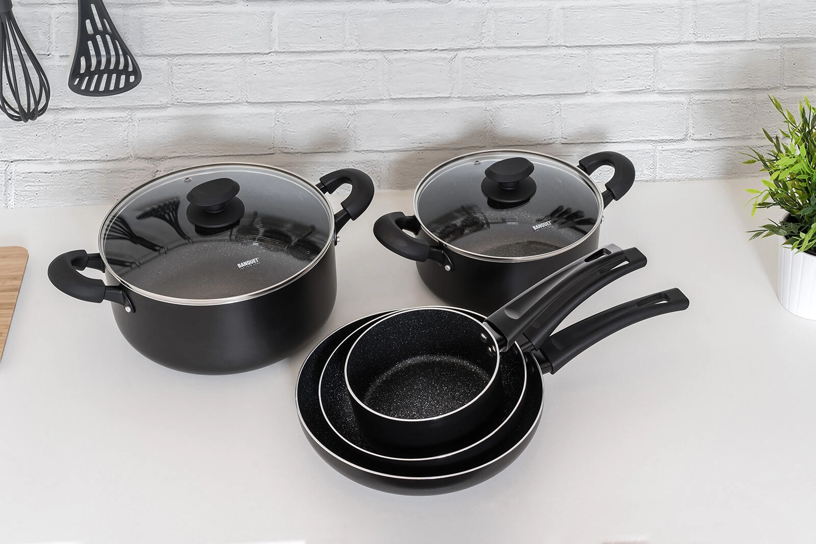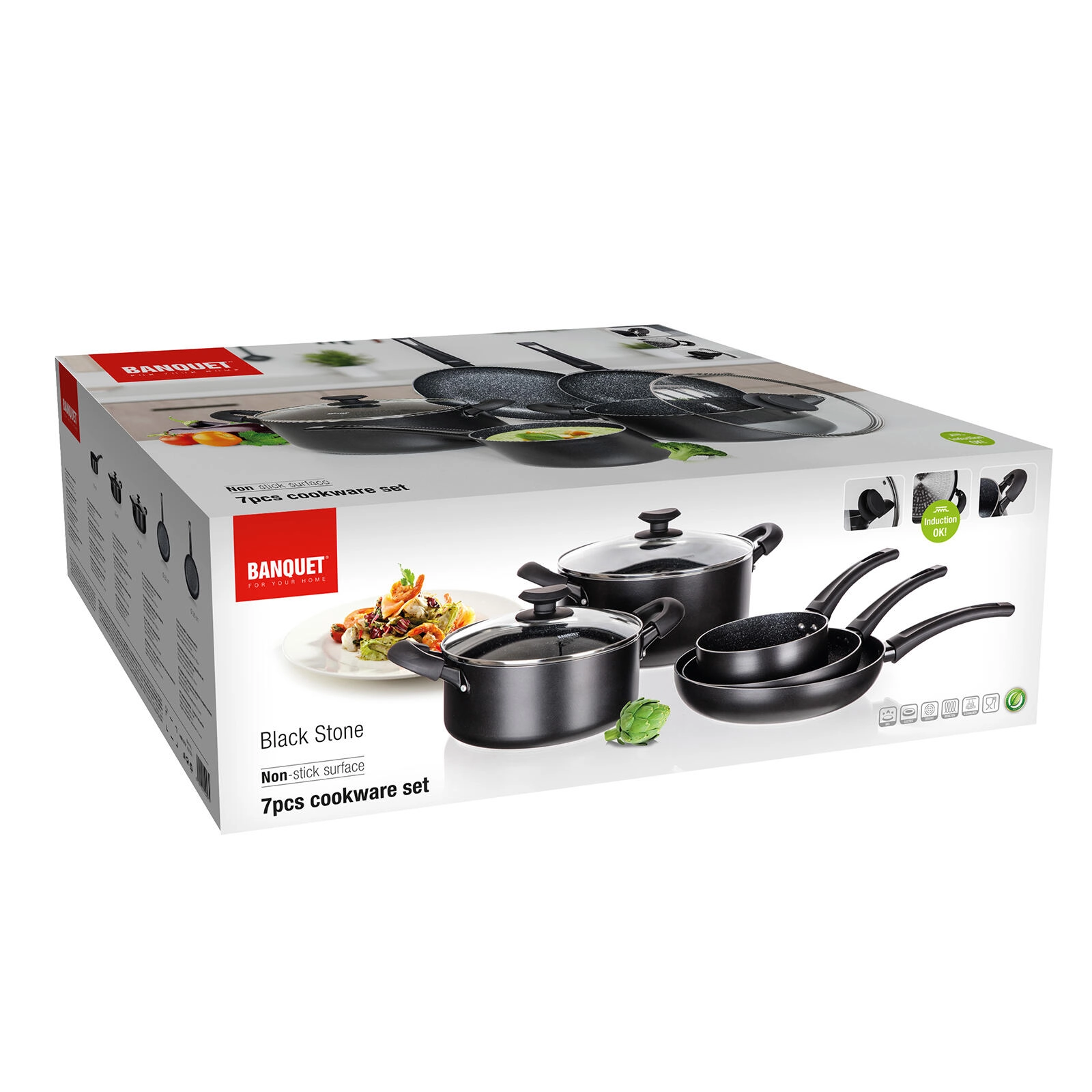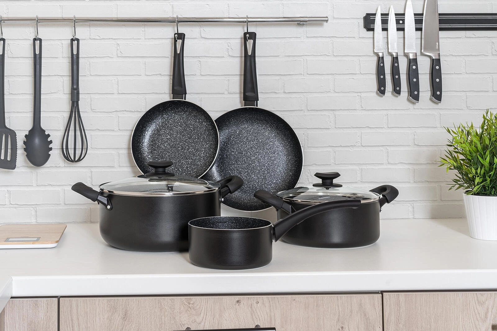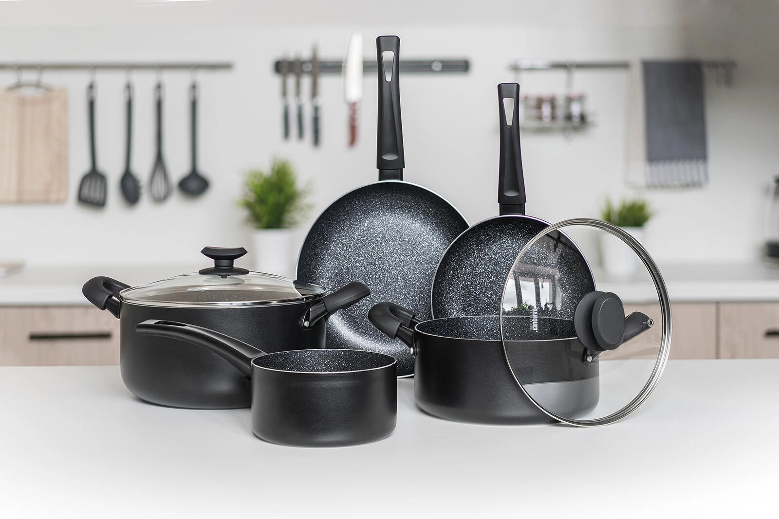 Zestaw naczyń BLACK STONE w eleganckiej czerni obejmuje codzienne gotowanie od szybkiego podsmażania po powolne duszenie. Odlewane aluminium o wysokiej przewodności cieplnej szybko się nagrzewa i długo utrzymuje temperaturę, dzięki czemu gotujesz szybciej i oszczędniej. Wyjątkowo trwała, nieprzywierająca powłoka zapewnia łatwe uwalnianie potraw i łatwe czyszczenie.