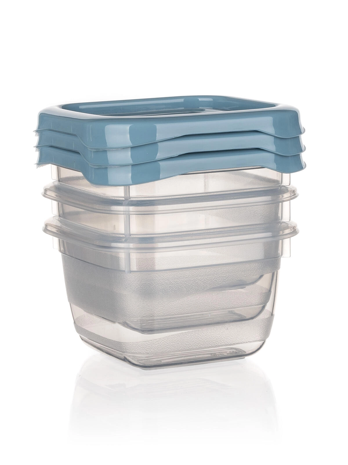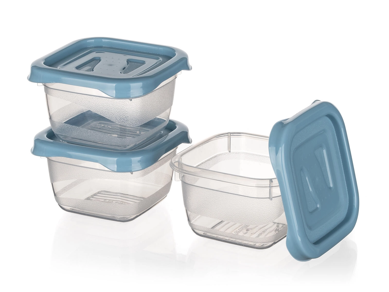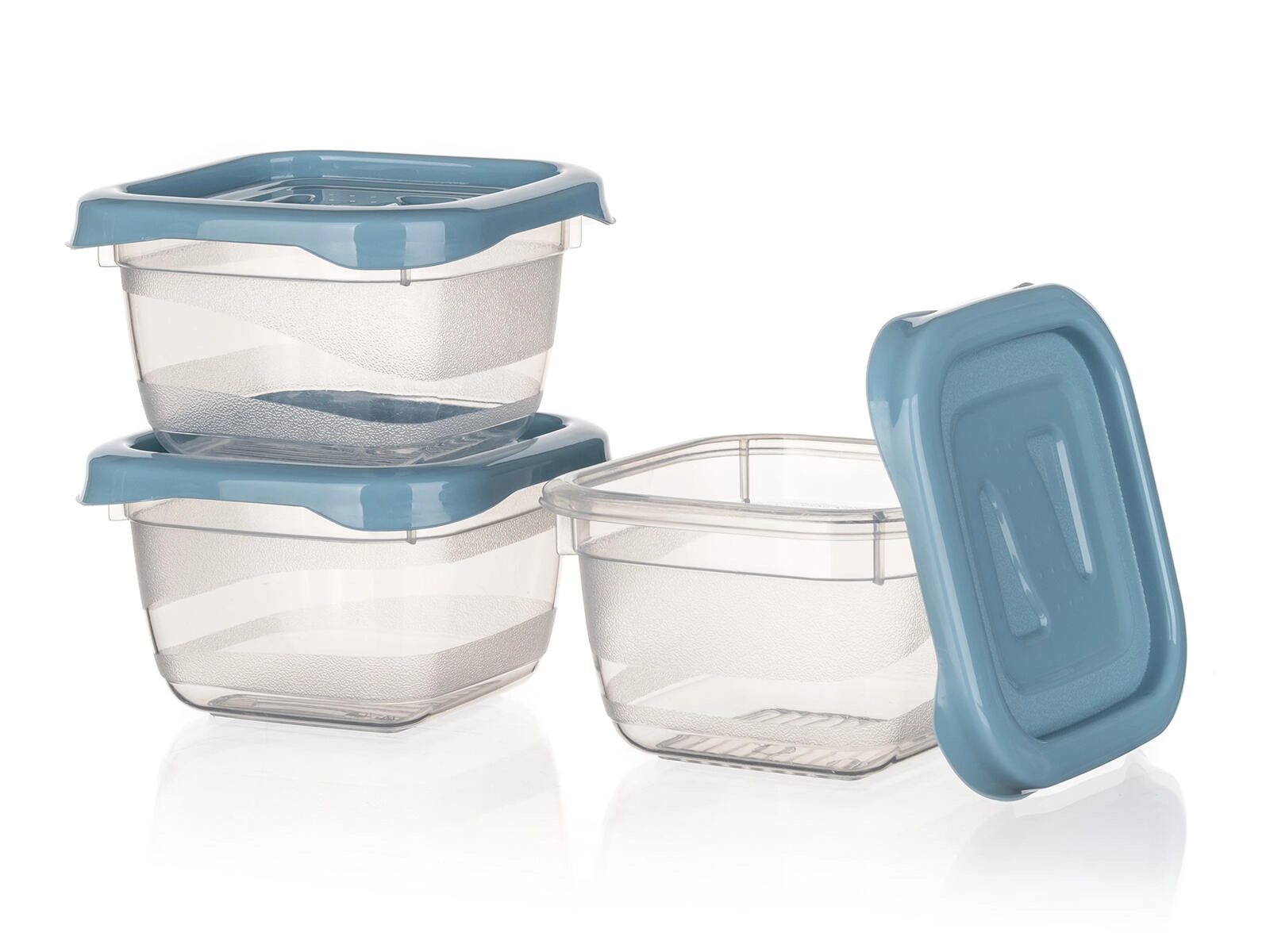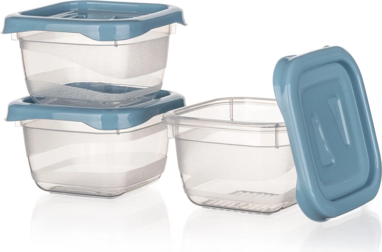 Solidne wieczka w kolorze nordic blue dobrze przylegają i pomagają utrzymać świeżość oraz zapobiec wylaniu zawartości.