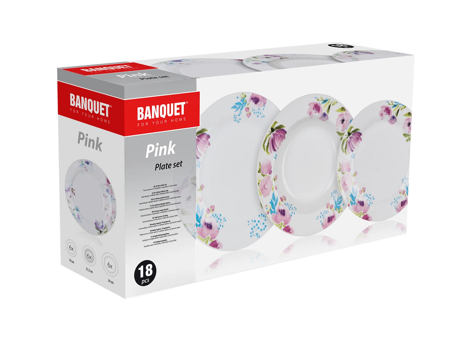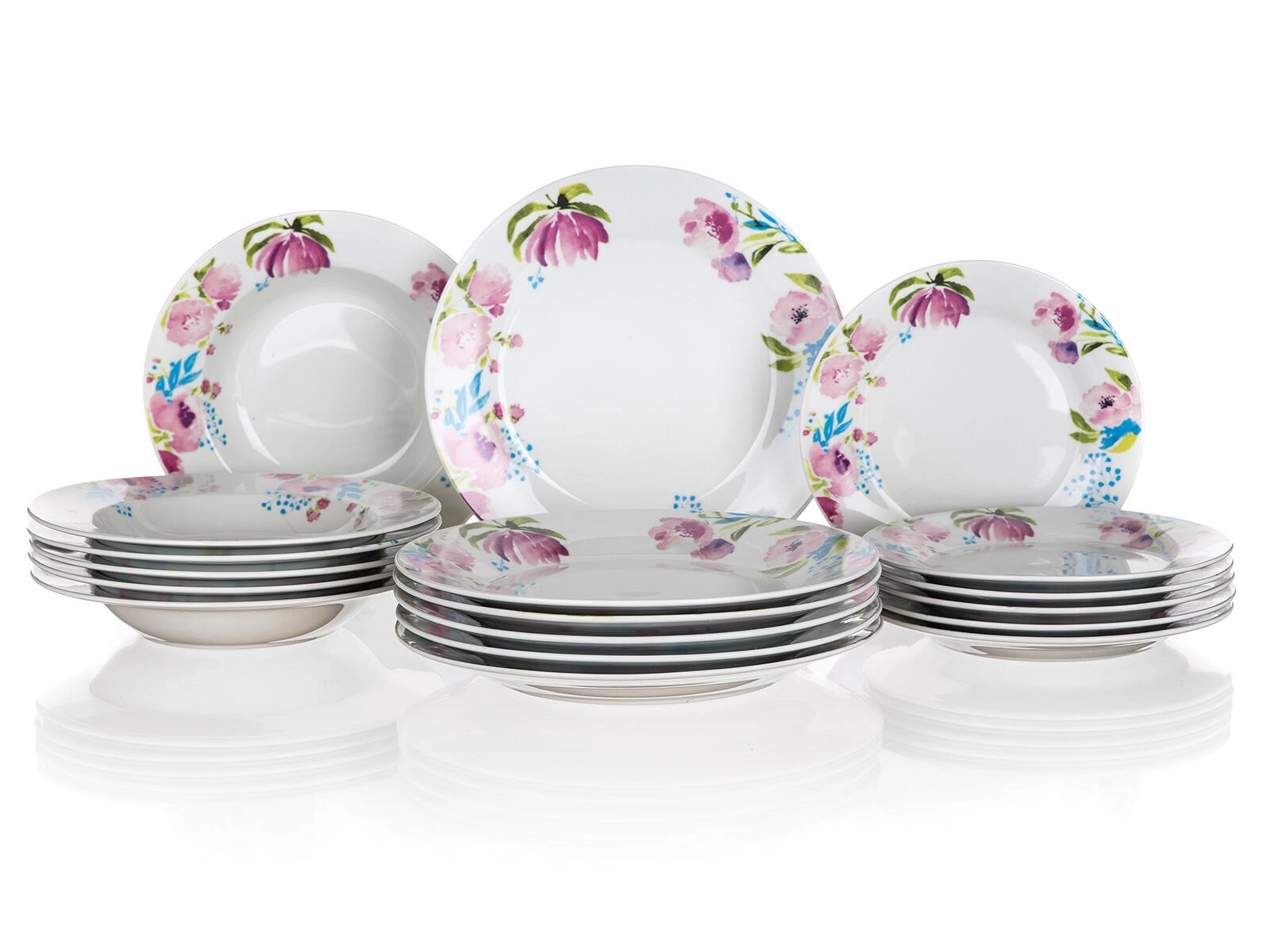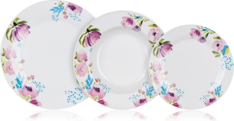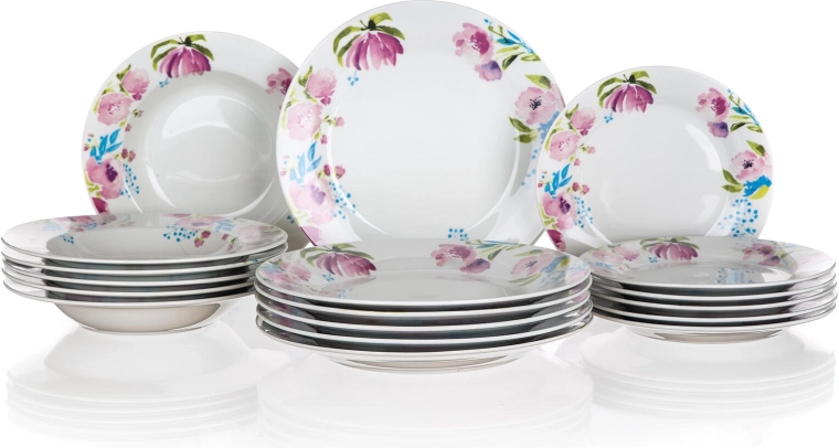 Zestaw zawiera 18 sztuk: 6× talerz deserowy 19 cm, 6× talerz głęboki 21,5 cm oraz 6× talerz płytki 24 cm. Wszystko, czego potrzeba do codziennego i odświętnego nakrycia stołu.