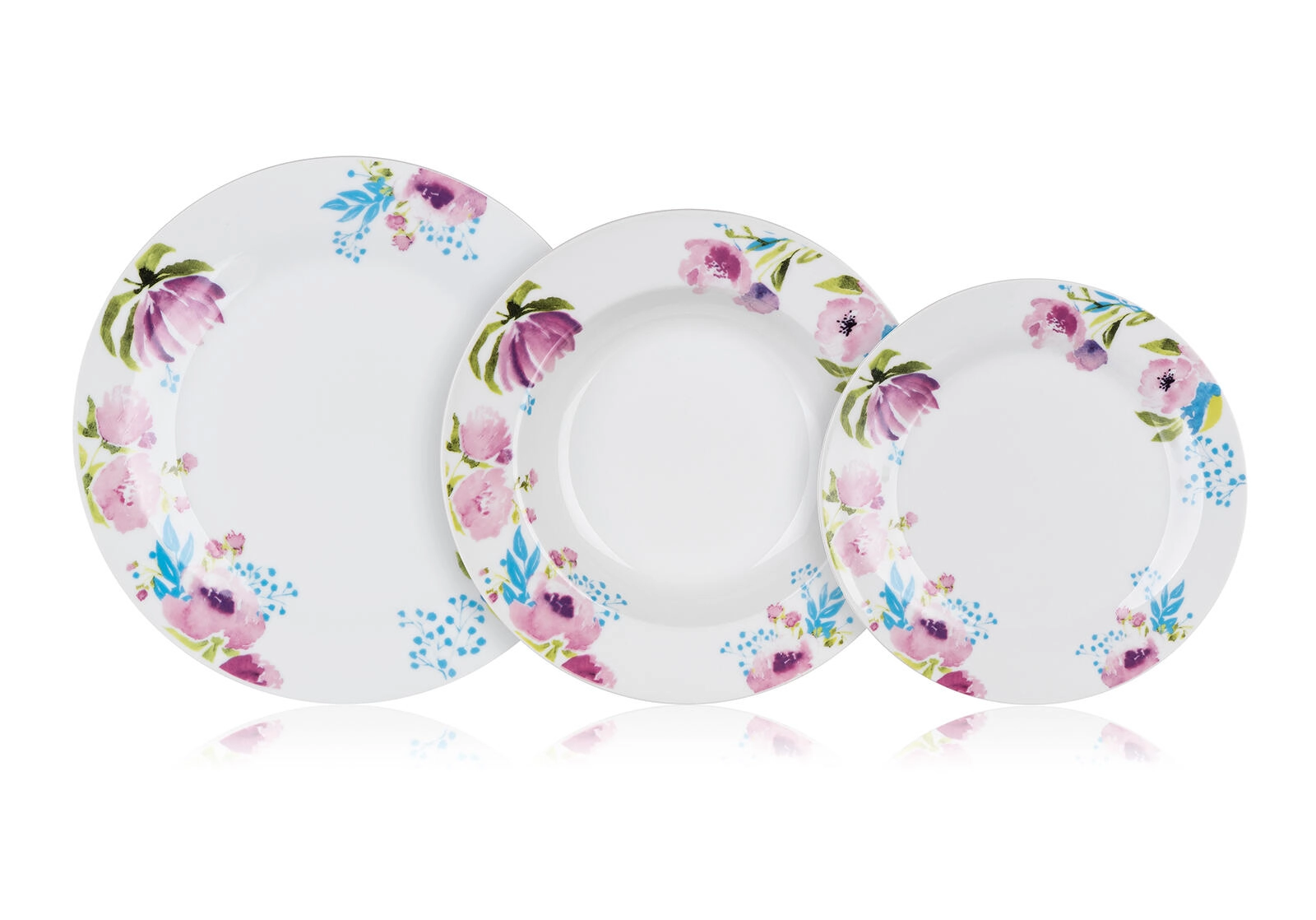 Delikatne różowe, fioletowe i niebieskie kwiaty na obrzeżu nadają białej porcelanie świeży wygląd i łatwo łączą się z inną zastawą oraz tekstyliami.