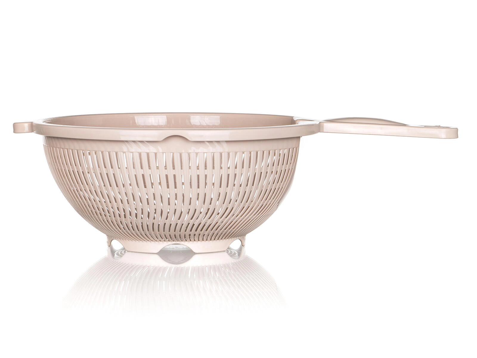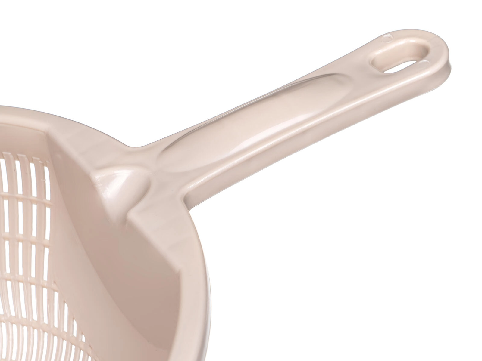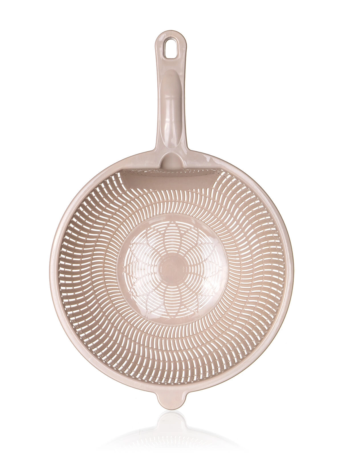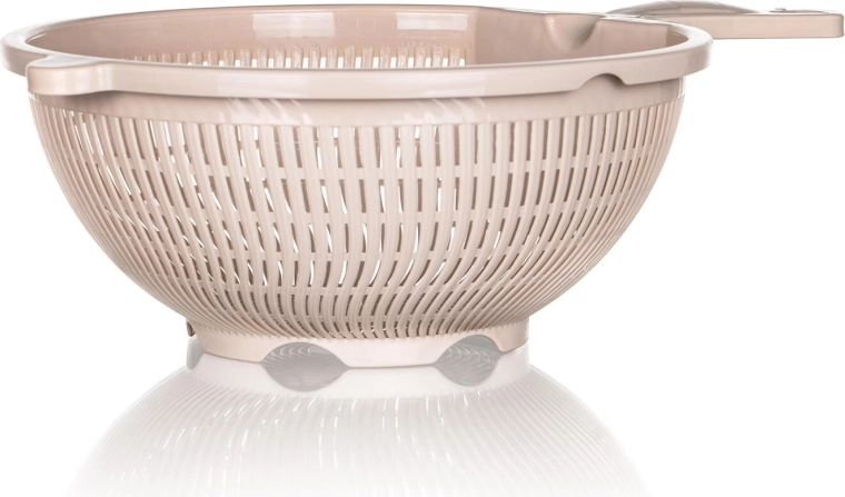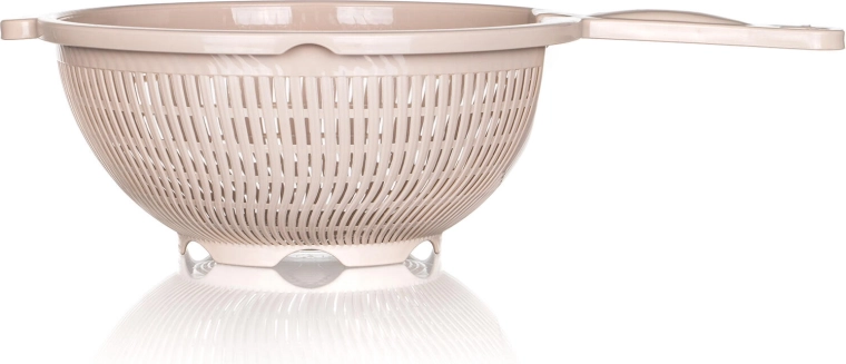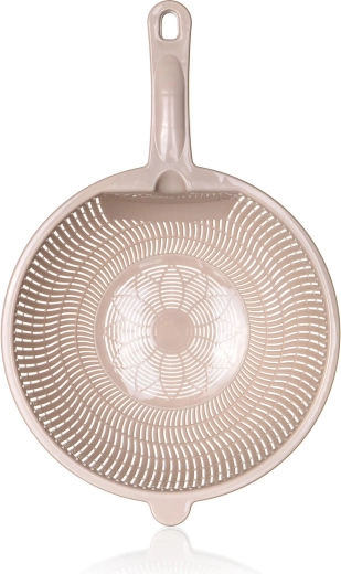 Praktyczne plastikowe sitko CULINARIA w eleganckim kolorze latte ułatwi odcedzanie makaronu, warzyw i owoców. Dzięki średnicy 23 cm i wygodnemu uchwytowi zapewnia szybkie i równomierne odprowadzanie wody dzięki drobnym podłużnym perforacjom oraz stabilne oparcie przy odkładaniu na zlew lub miskę.