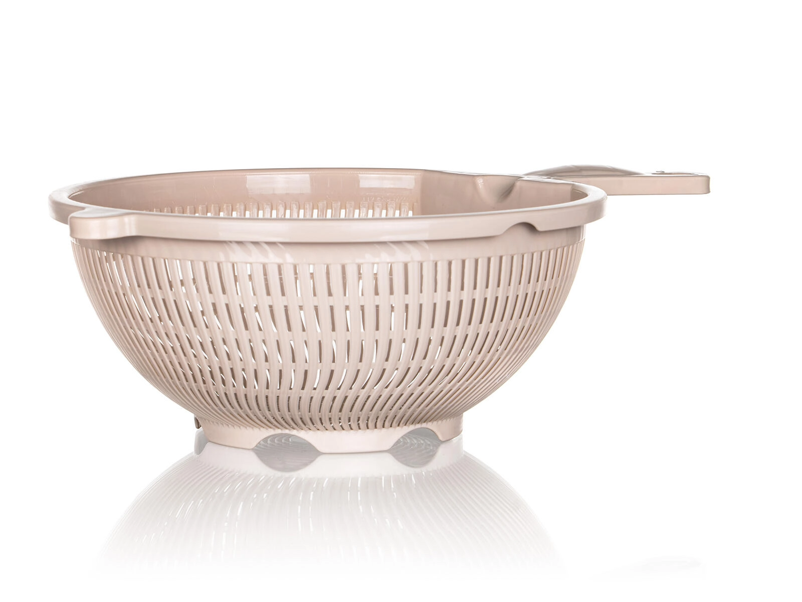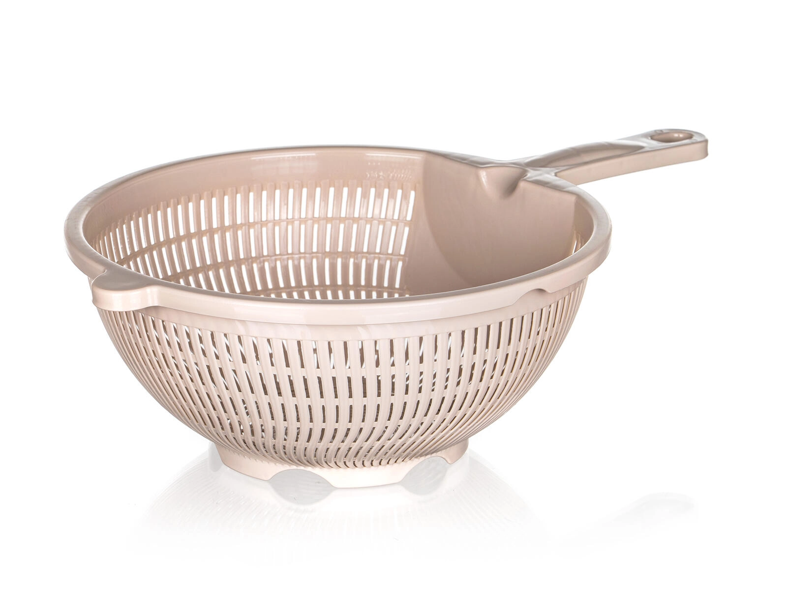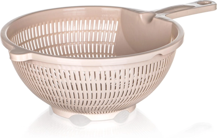 Nóżka stabilizująca i podwyższone dno umożliwiają wygodne odkładanie na zlew lub blat roboczy, dzięki czemu produkty pozostają ponad poziomem wody. Wytrzymały plastik łatwo się czyści i jest odpowiedni do codziennego użytku przy myciu owoców i warzyw, odcedzaniu makaronu czy płukaniu roślin strączkowych.