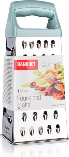Praktyczna czterostronna tarka w kształcie litery A do wszechstronnego tarcia. Dzięki stali nierdzewnej, stabilnej konstrukcji i wygodnemu plastikowemu uchwytowi w oliwkowym kolorze idealnie sprawdzi się do codziennego użytku w kuchni.