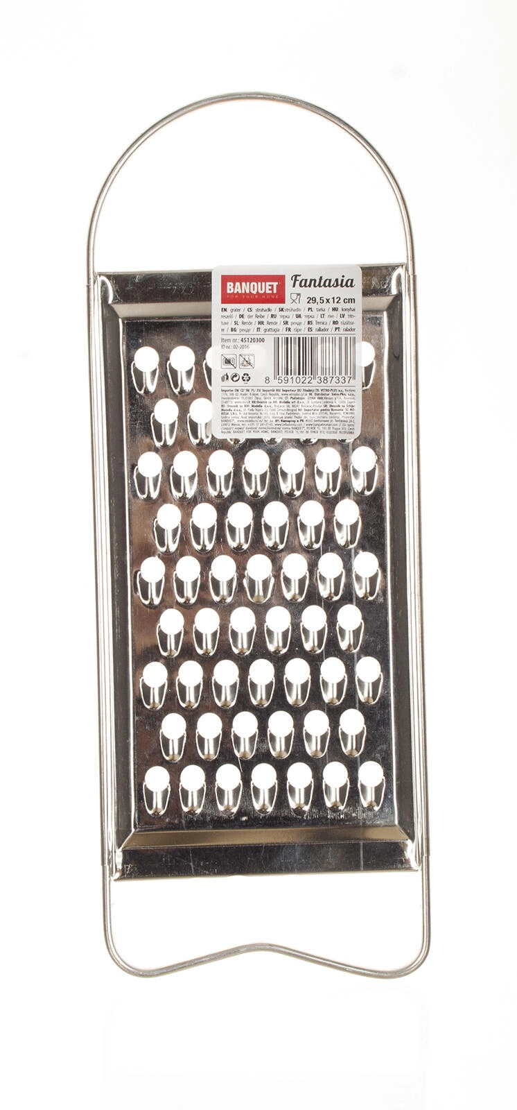 Odkryj niezawodne płaskie tarko do warzyw Fantasia o wymiarach 29,5 × 12 cm, idealne do codziennego przygotowywania sałatek, dodatków i dań domowych. Dzięki cynowanej powłoce jest odporne na korozję i łatwe w czyszczeniu, a solidna blaszana konstrukcja zapewnia stabilność podczas tarcia.