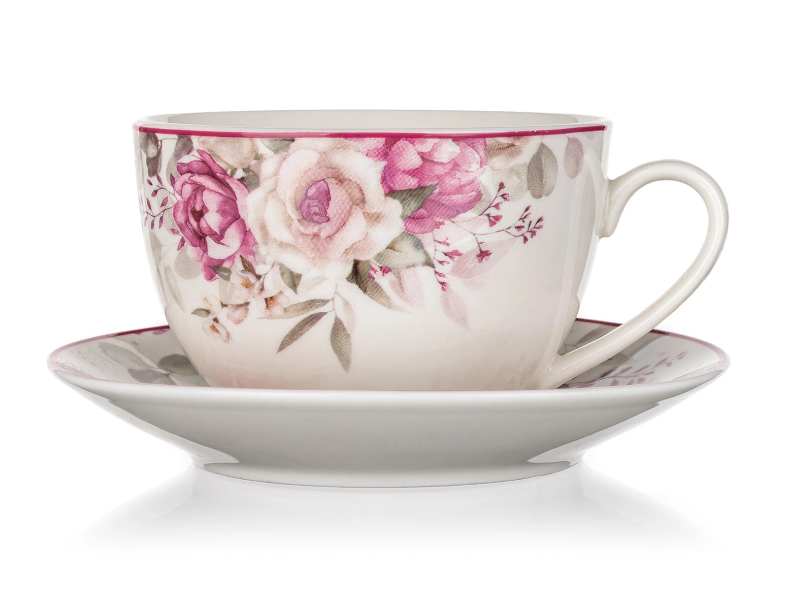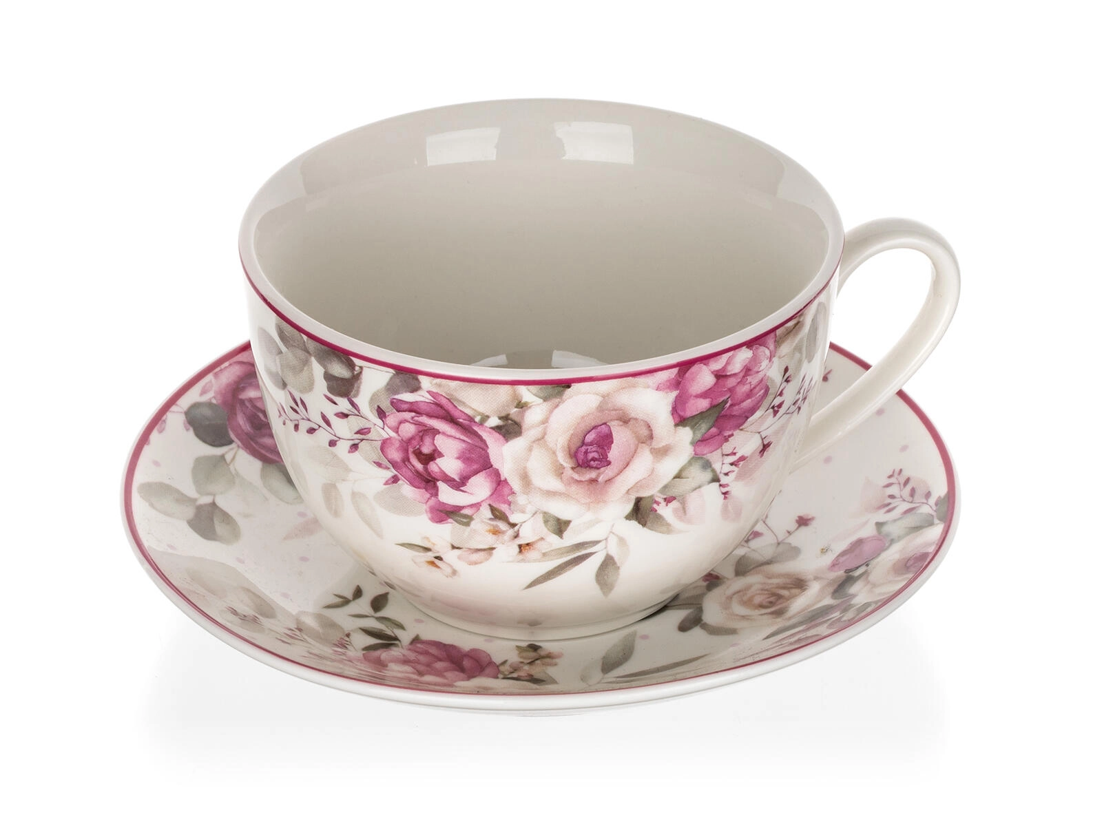Filiżanka ze spodkiem ROSE wyróżnia się delikatnym kwiatowym dekorem w różowych tonach, który upiększy każdy nakryty stół. Pojemność 240 ml jest idealna do cappuccino, czarnej i ziołowej herbaty lub gorącej czekolady. Wysokiej jakości ceramika utrzymuje temperaturę napoju i dobrze leży w dłoni.