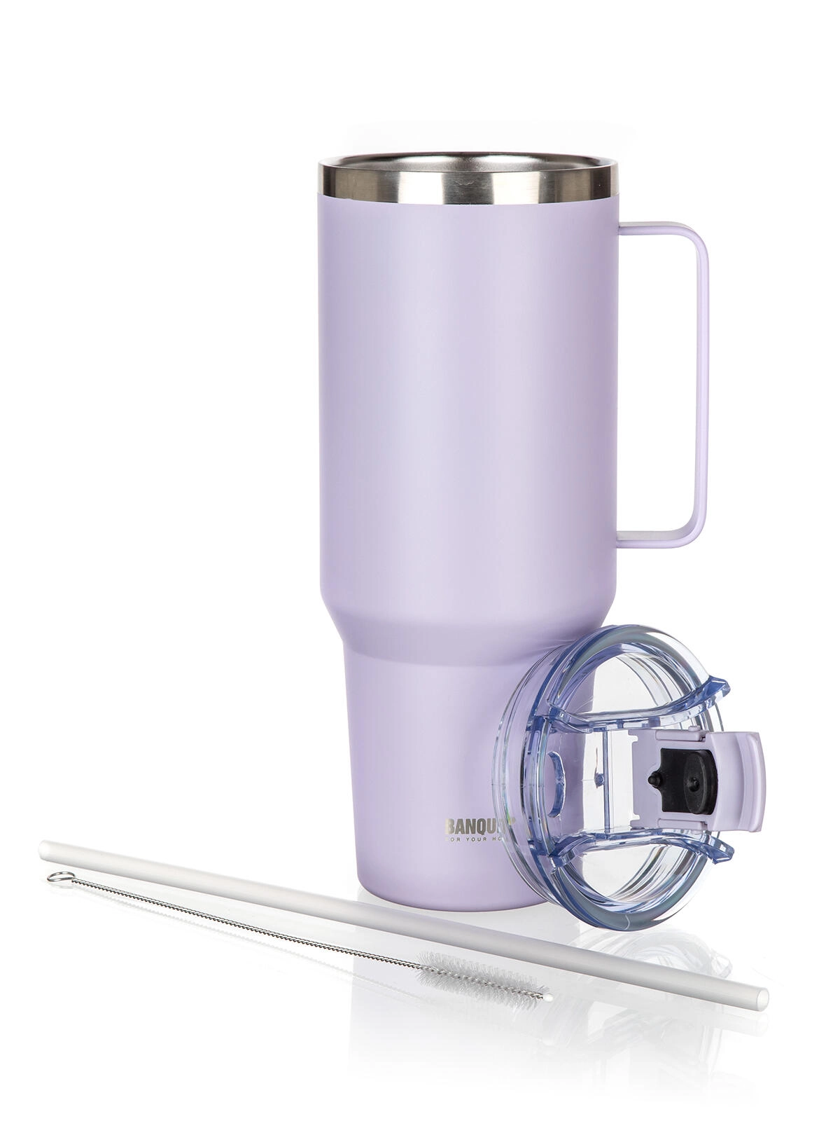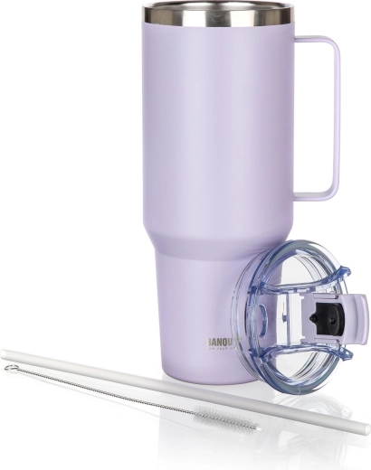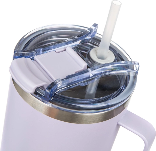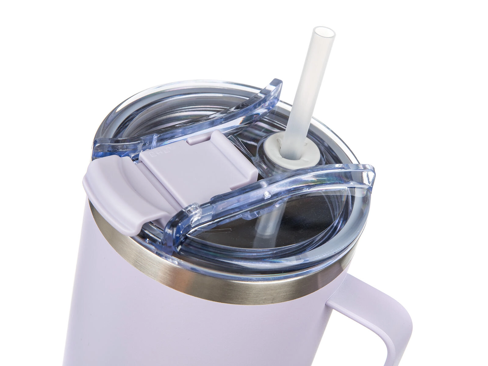 Przezroczysta pokrywka z wytrzymałego plastiku oferuje dwa sposoby picia – przez słomkę lub bezpośrednio z ustnika. W zestawie znajduje się słomka PP oraz szczoteczka czyszcząca dla łatwej pielęgnacji. Solidne ucho zapewnia wygodne noszenie w domu, biurze i w podróży. Przed przypadkowym rozlaniem chroni zamykany otwór, jednak pokrywka nie jest w 100% szczelna – zalecamy transport w pozycji pionowej.