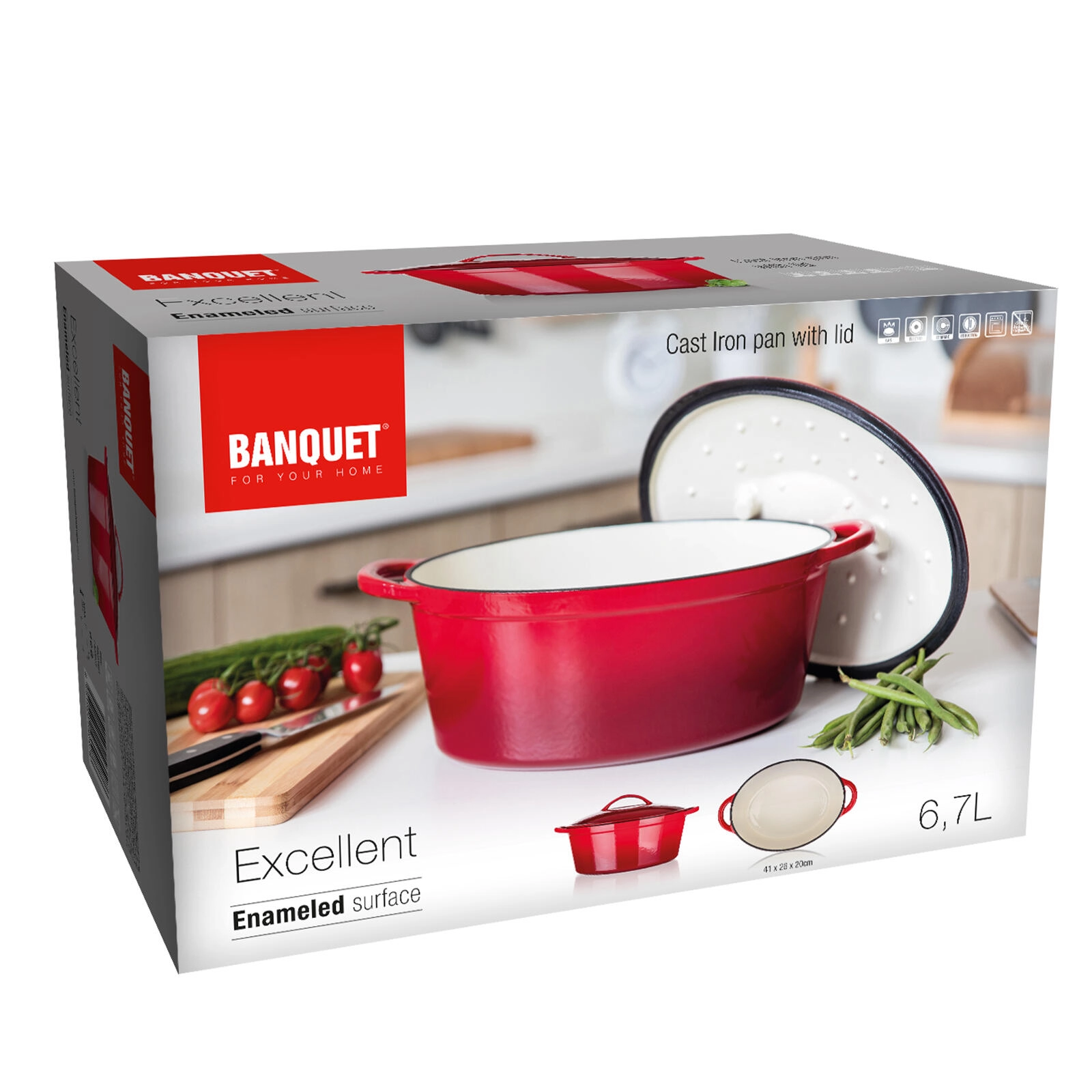 Solidna żeliwna brytfanna EXCELLENT o pojemności 6,7 l z emaliowaną powłoką jest idealna do pieczenia, duszenia i zapiekania. Równomierne rozprowadzanie ciepła, samopolewająca pokrywa oraz łatwa pielęgnacja dzięki nieprzywierającej emalii zapewniają soczyste rezultaty w domu i na odświętnym stole.