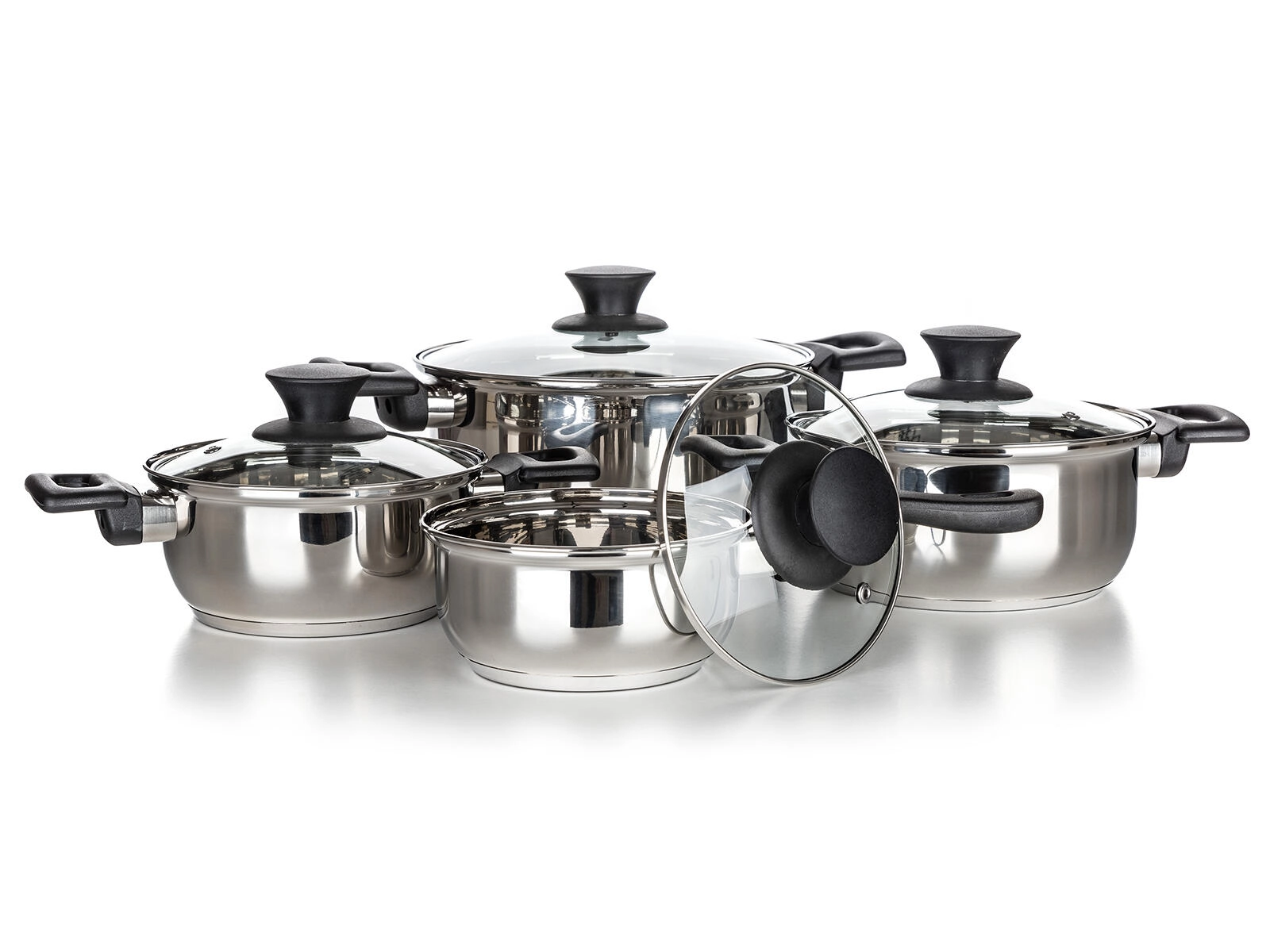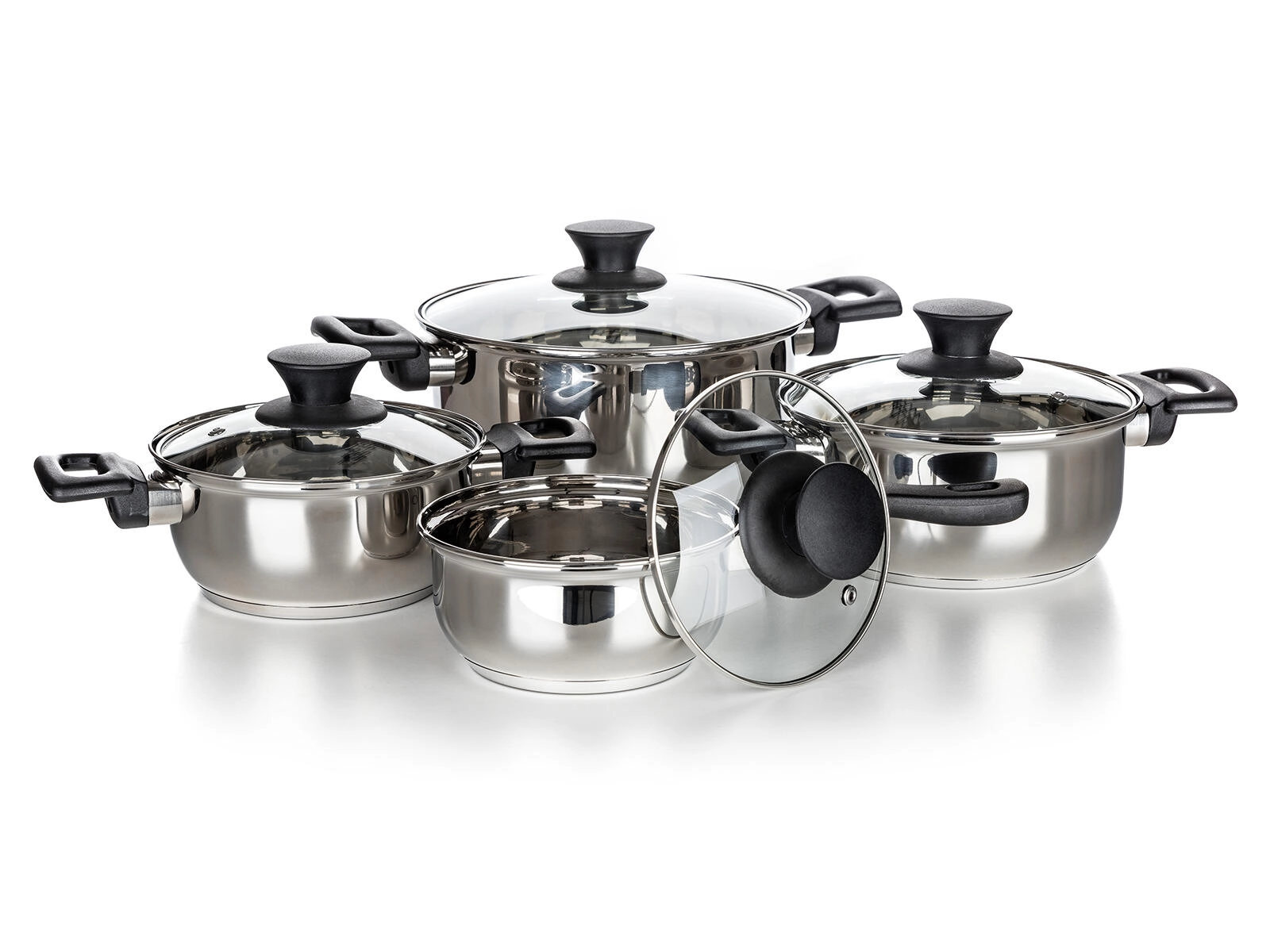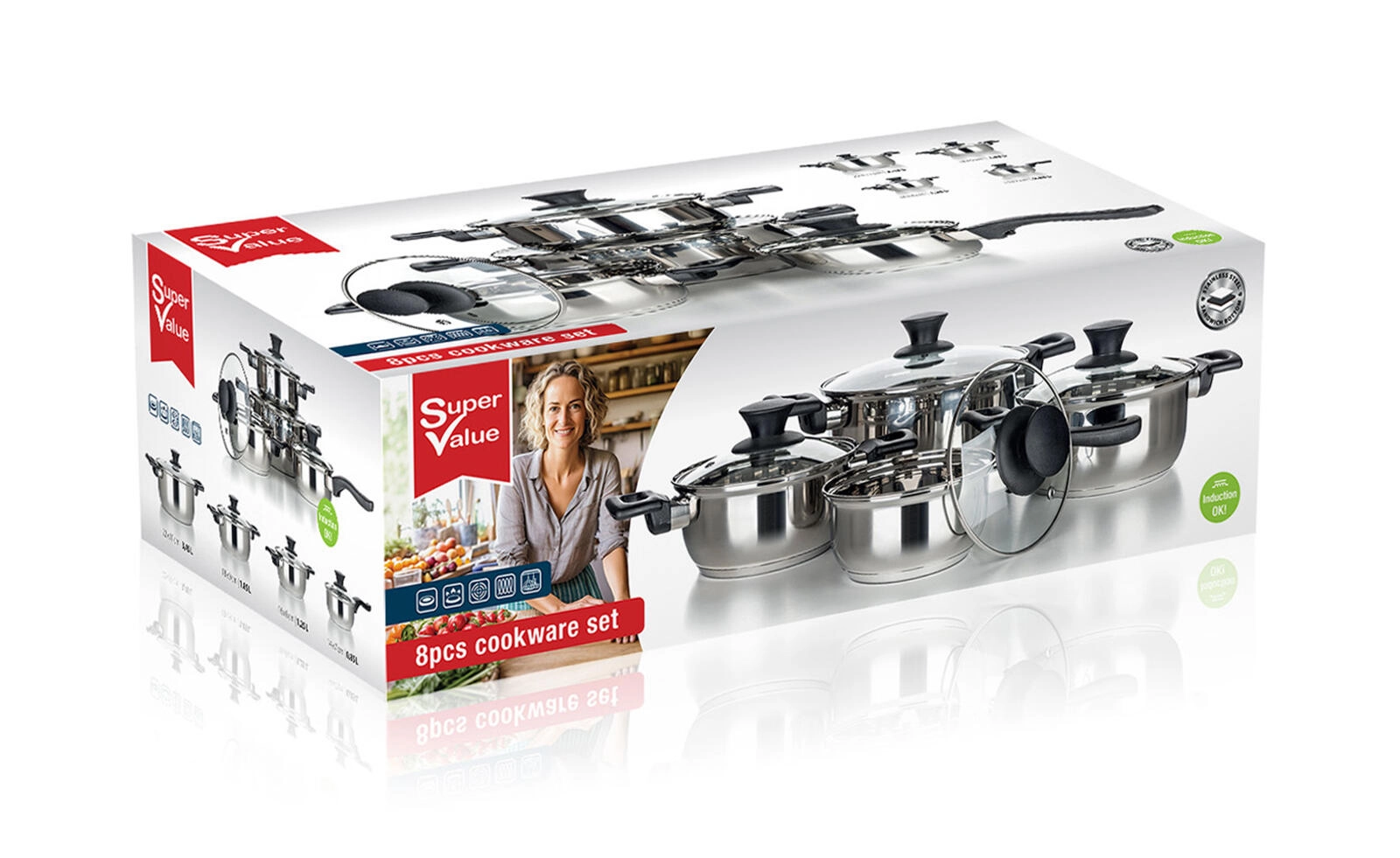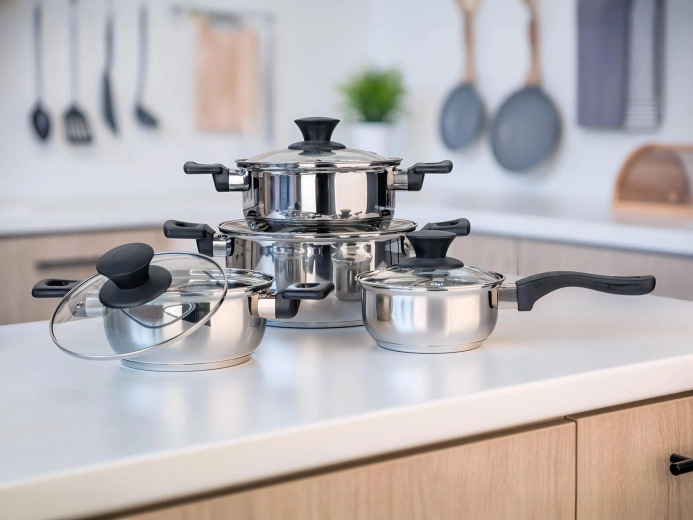 Kompletny 8‑częściowy zestaw garnków ze stali nierdzewnej Super Value do codziennego gotowania. Trwała stal nierdzewna o wysokim połysku, hartowane szklane pokrywki z zaworem pary oraz kompatybilność ze wszystkimi typami kuchenek, w tym indukcją. Łatwa pielęgnacja i możliwość mycia w zmywarce.