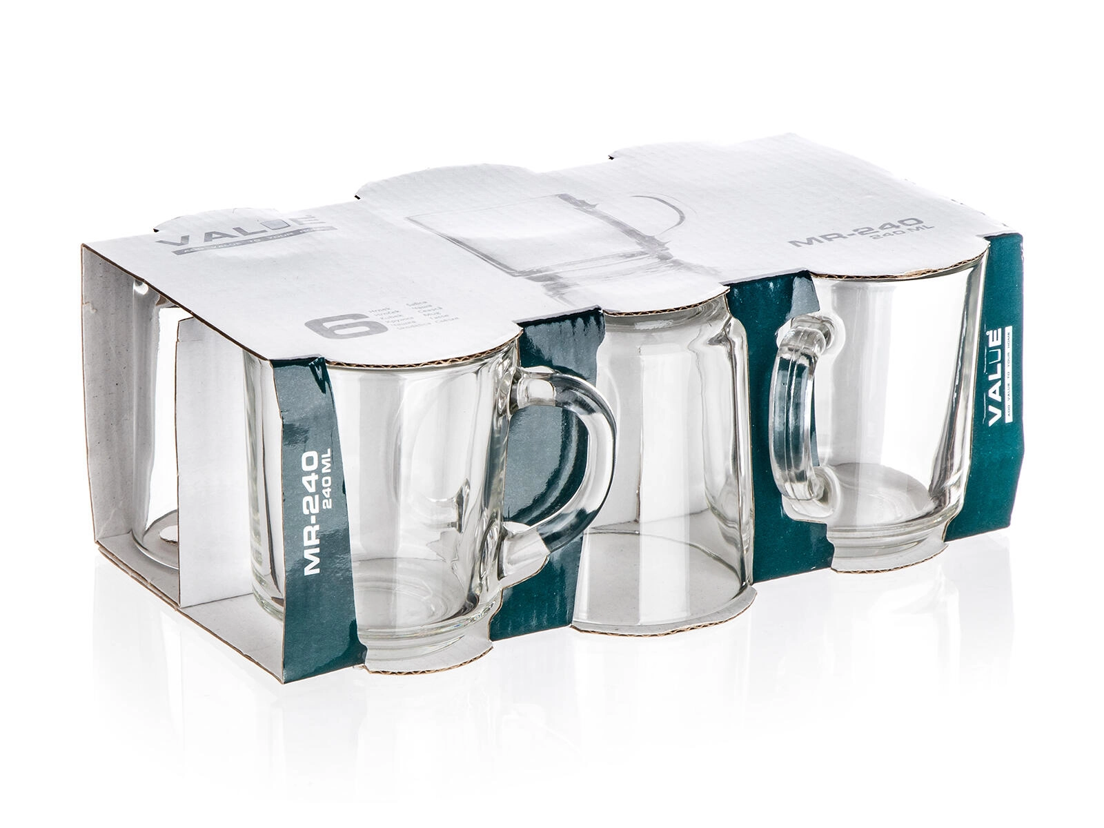 Praktyczny zestaw sześciu szklanych kubków o pojemności 240 ml jest idealny do codziennego użytku. Dzięki wytrzymałemu szkłu, wygodnemu uchu i stabilnej, grubszej podstawie kubki nadają się do gorących i zimnych napojów. Prosty, ponadczasowy design VALUE pasuje do każdej kuchni i biura.