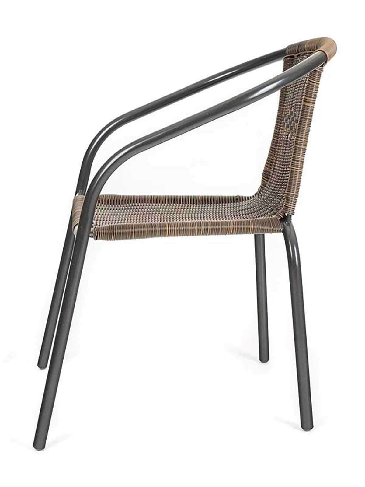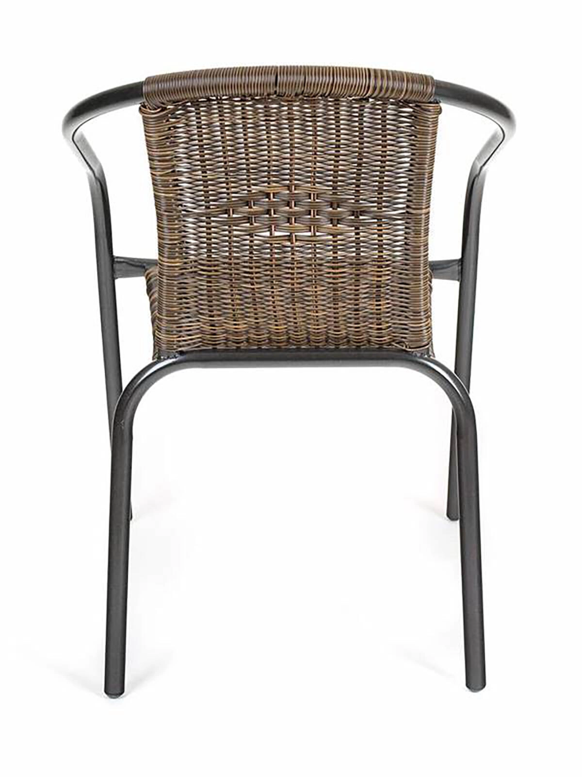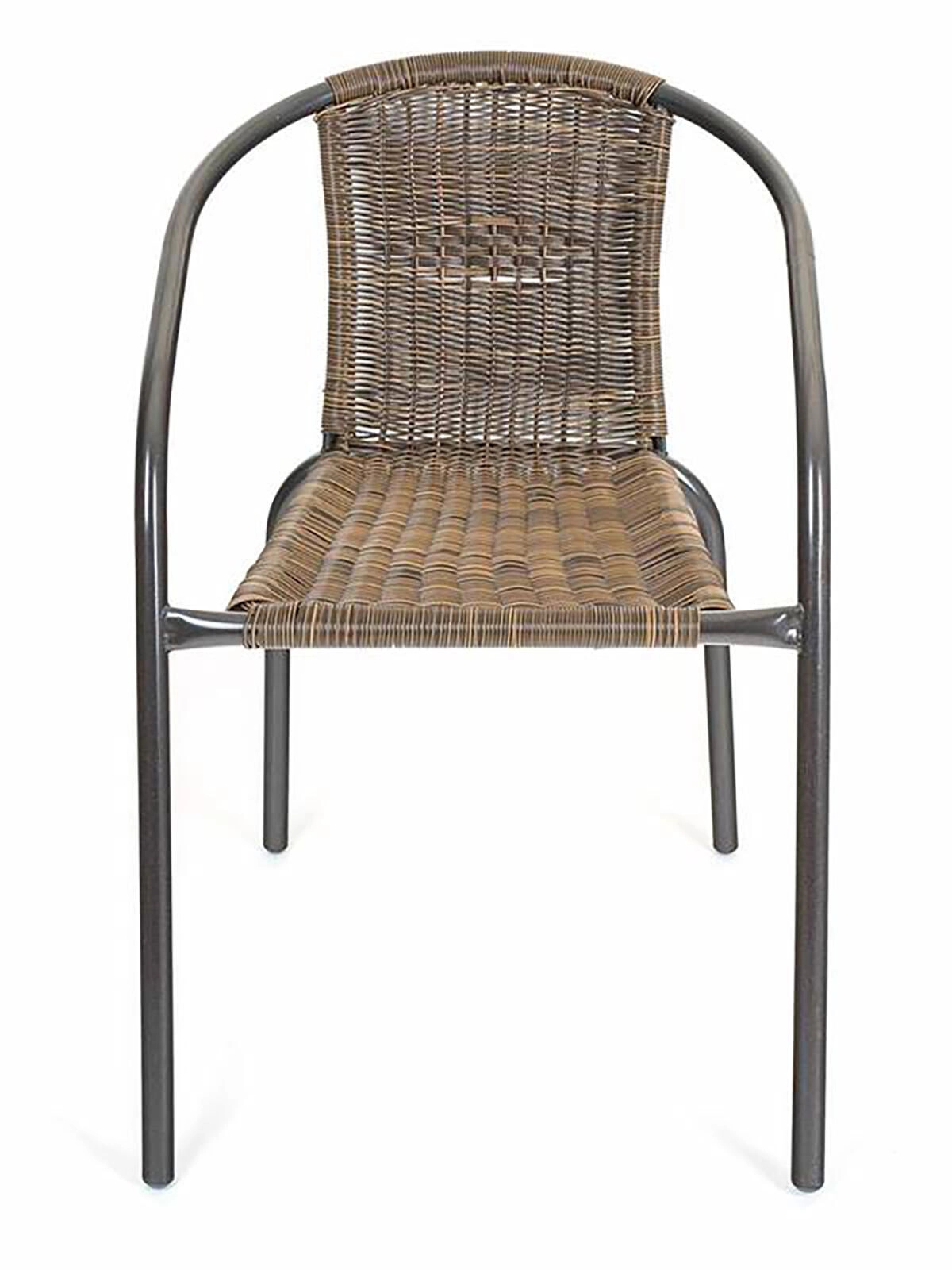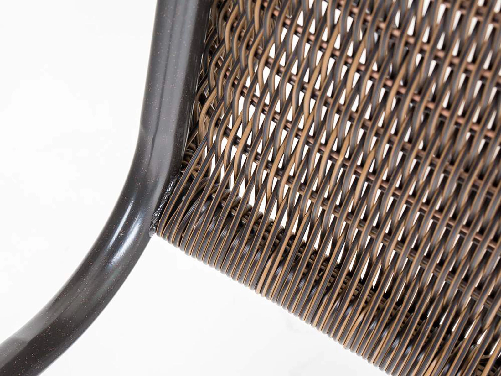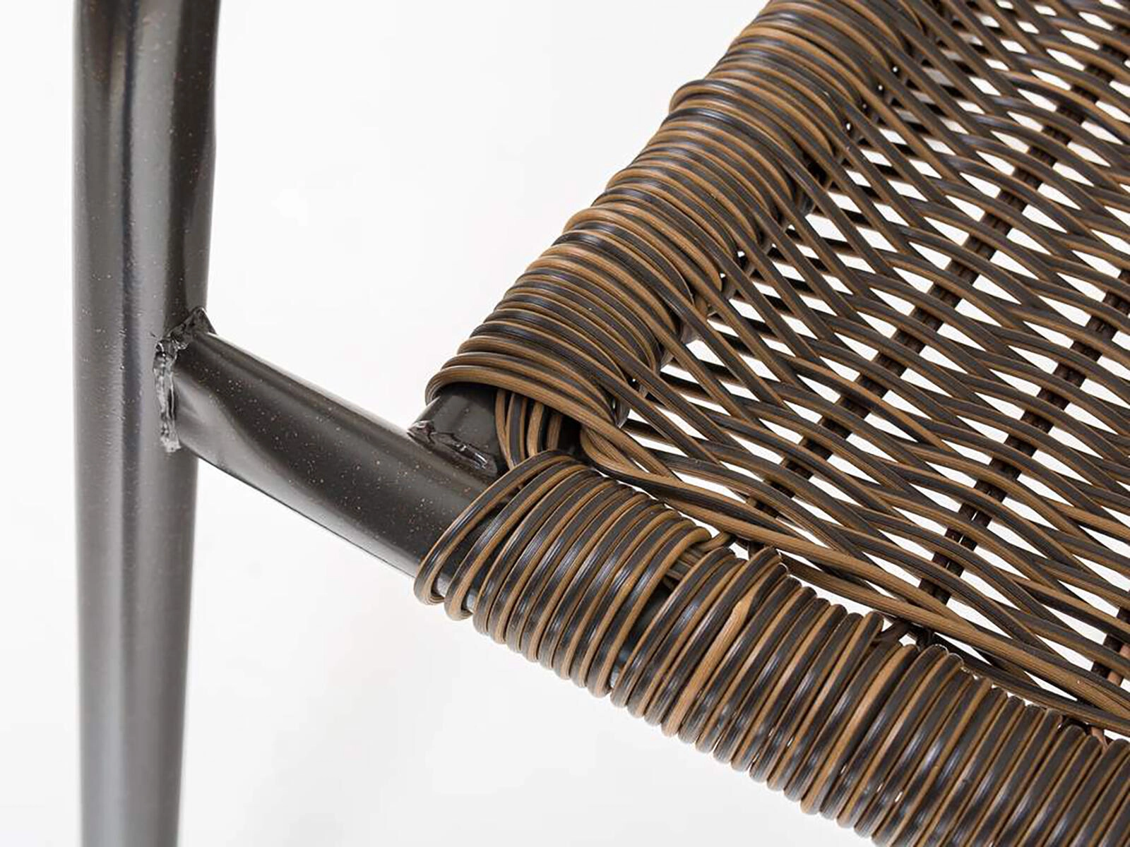 To uniwersalne krzesło zewnętrzne łączy lekki, ażurowy wygląd splotu z solidnością stalowej konstrukcji. Wyprofilowane podłokietniki i ergonomiczne oparcie zapewniają wygodę, a syntetyczny rattan w brązowym tonie wygląda naturalnie i jest łatwy w pielęgnacji.