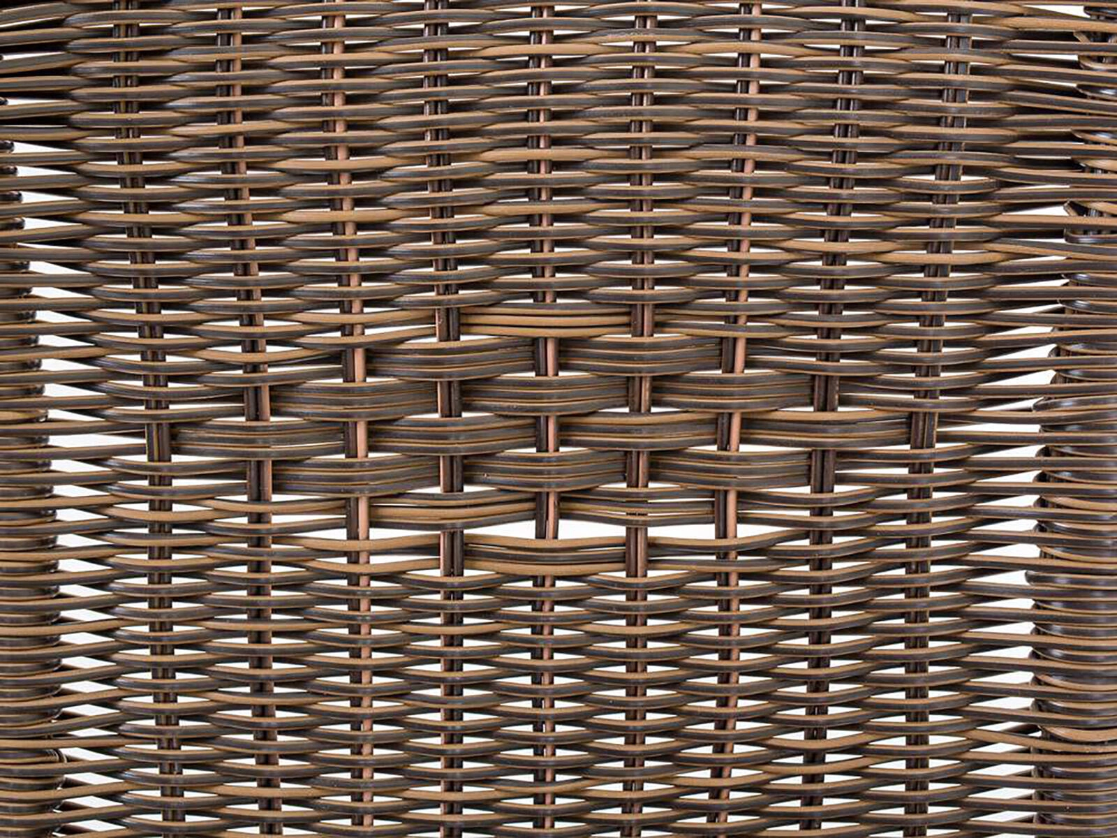 Syntetyczny rattan w brązowym odcieniu jest odporny na wilgoć i łatwy w czyszczeniu, dzięki czemu idealnie nadaje się do użytku na zewnątrz przez cały rok.