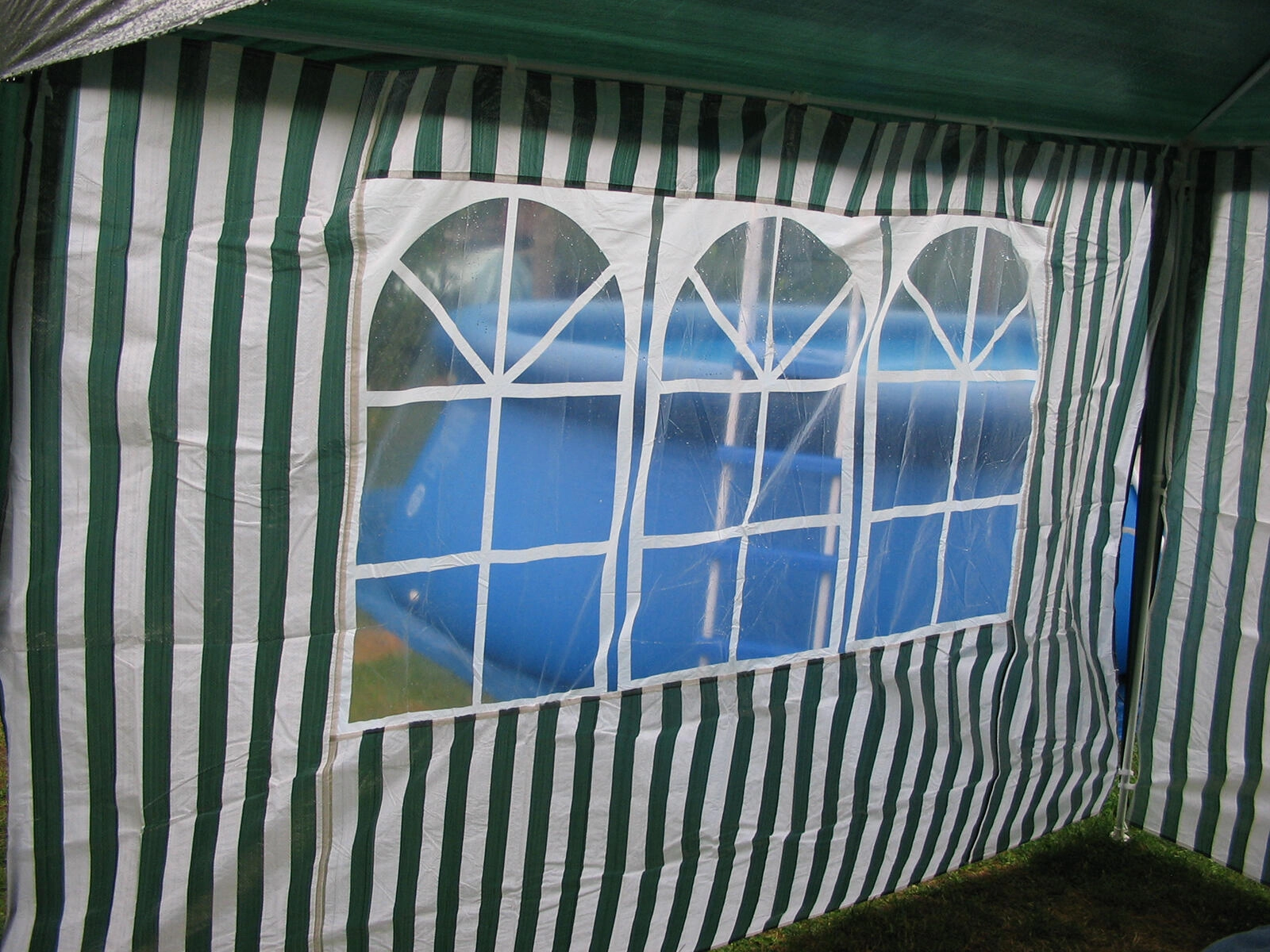 Praktyczna ściana boczna do ogrodowych altan i namiotów imprezowych o wymiarach 295 × 190 cm z trzema oknami z przezroczystego PVC. Wytrzymały materiał PE 100 g/m² chroni przed wiatrem i lekkim deszczem, a okna przepuszczają dużo światła dziennego. Idealny dodatek do altan 3 × 3 m w eleganckim wydaniu białozielone pasy.