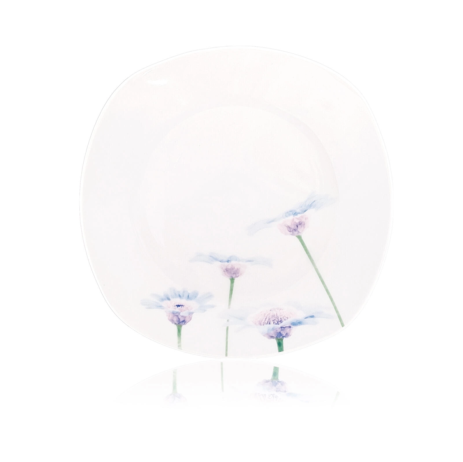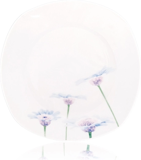 Stwórz pięknie zgrane nakrycie stołu z zestawem Blue Daisy. Biała porcelana z subtelnym, niebiesko‑fioletowym motywem kwiatowym wygląda czysto i ponadczasowo, a zaokrąglony, kwadratowy kształt dodaje nowoczesnego charakteru. Zestaw to doskonały wybór na rodzinne kolacje i odświętne okazje.