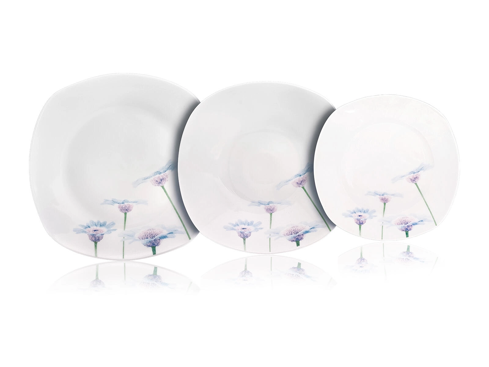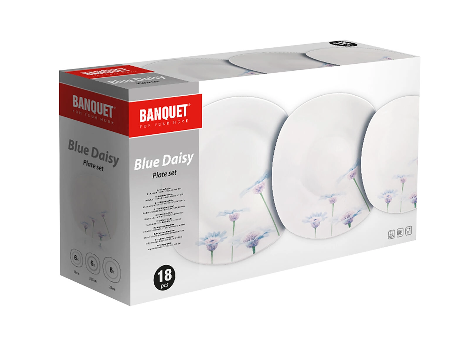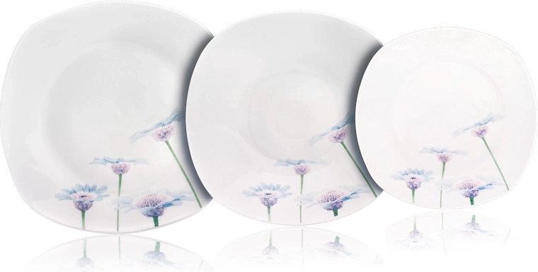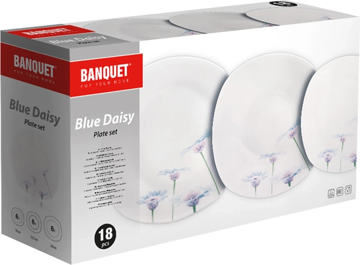 Elegancki, 18‑częściowy porcelanowy zestaw obiadowy z delikatnym, kwiatowym dekorem Blue Daisy rozświetli każdy stół. Dzięki uniwersalnym rozmiarom talerzy i trwałej glazurze jest idealny do codziennego użytku i odświętnego stołowania. Talerze mają nowoczesny zaokrąglony, kwadratowy kształt, są odpowiednie do kuchenki mikrofalowej i można je myć w zmywarce.