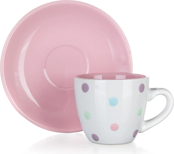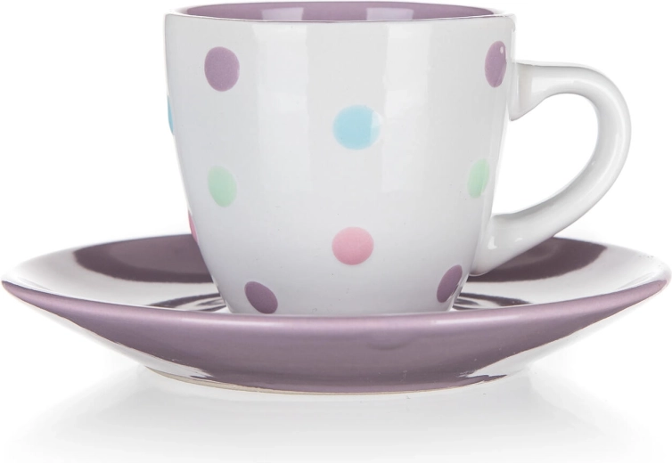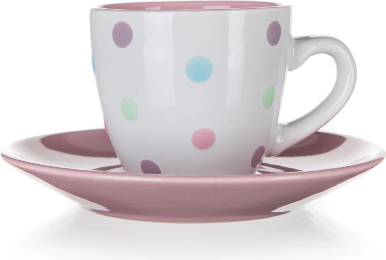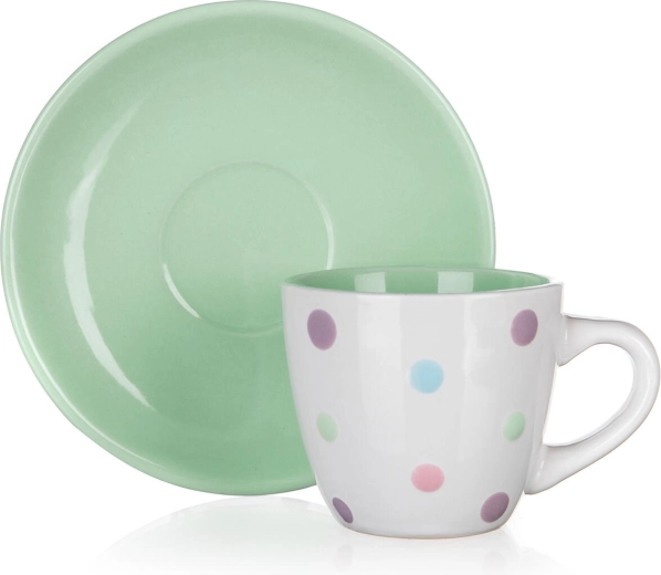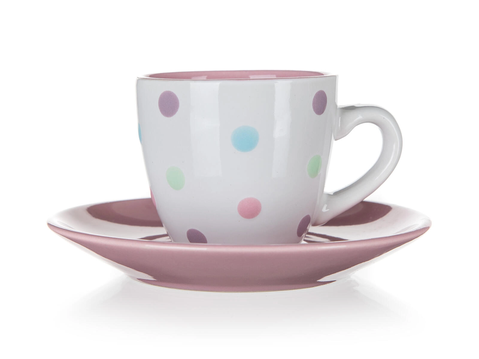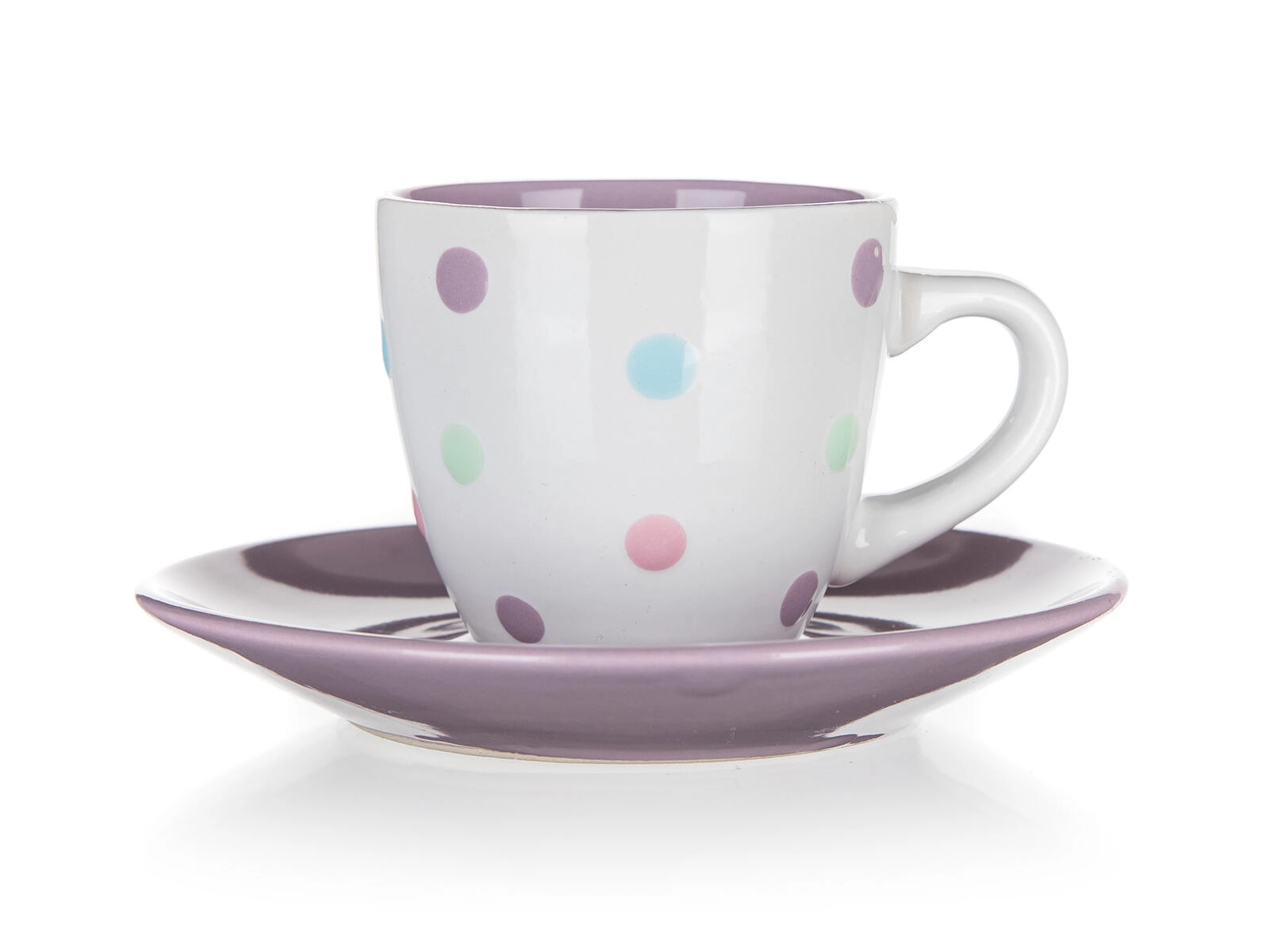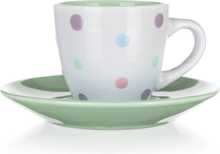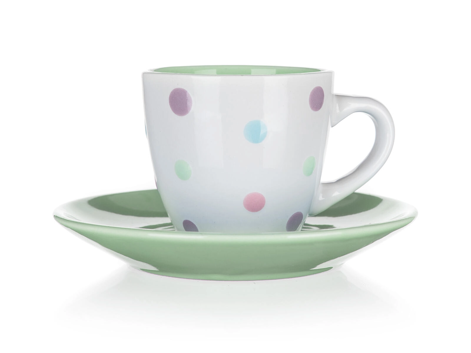 Połączenie białej filiżanki z wielobarwnymi kropkami i dopasowanego spodeczka rozświetli każdy kawowy rytuał i świetnie wpasuje się zarówno w nowoczesną, jak i vintage kuchnię.
