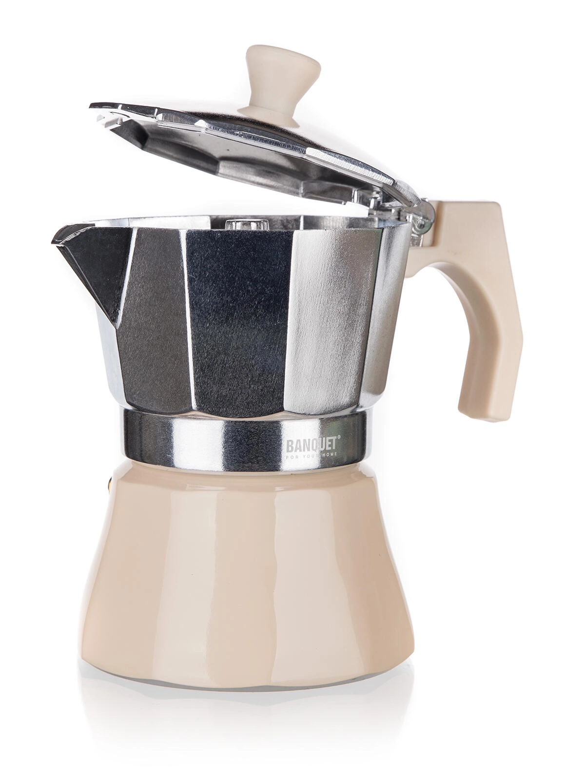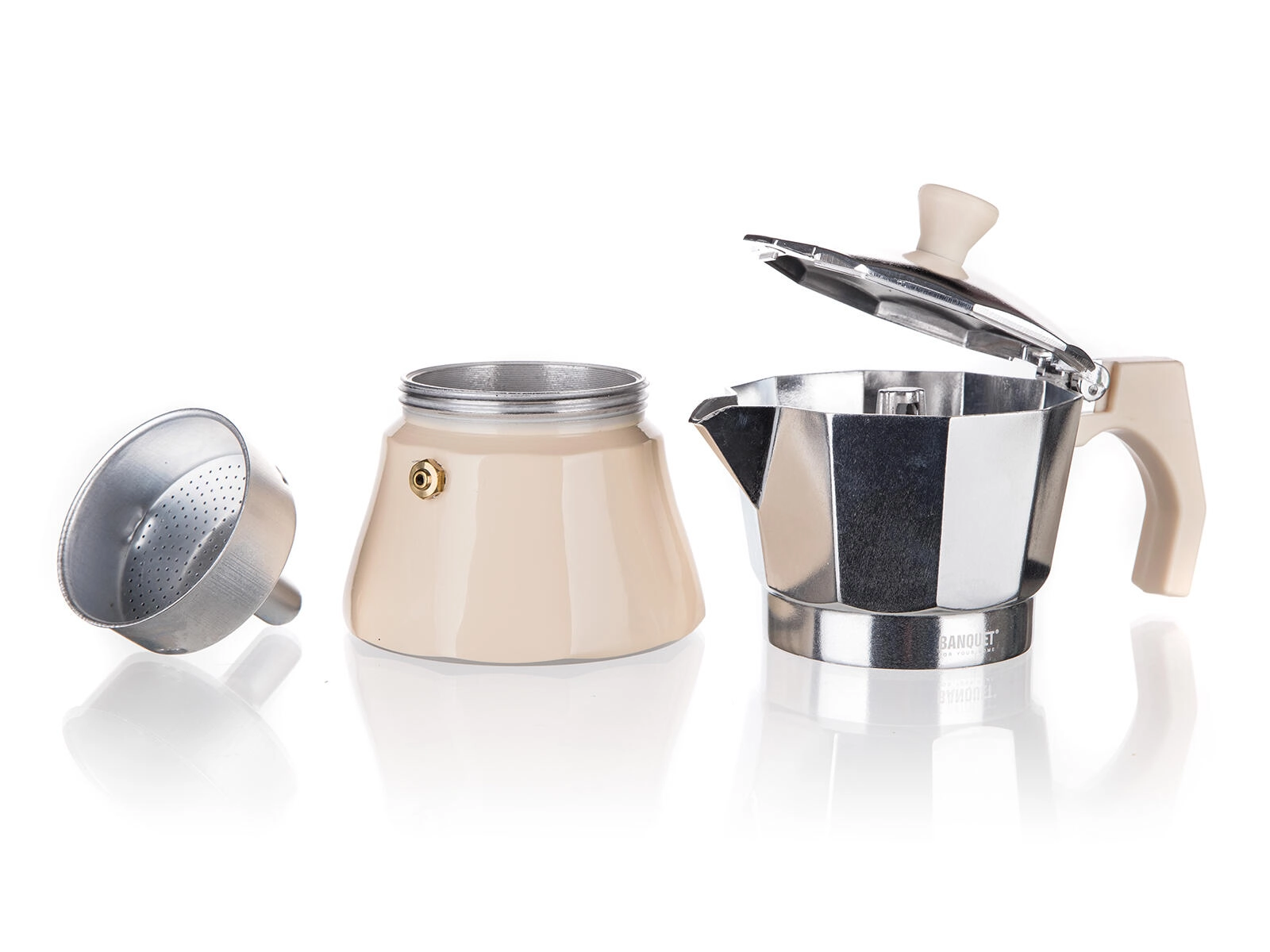 Tradycyjna kawiarka CAMPI na 6 filiżanek parzy mocną, aromatyczną kawę bezpośrednio na kuchence. Trwałe aluminiowe korpus z zaworem bezpieczeństwa, wygodne serwowanie i ponadczasowy design w kolorze kości słoniowej. Odpowiednia do kuchenek gazowych, elektrycznych i ceramicznych.
