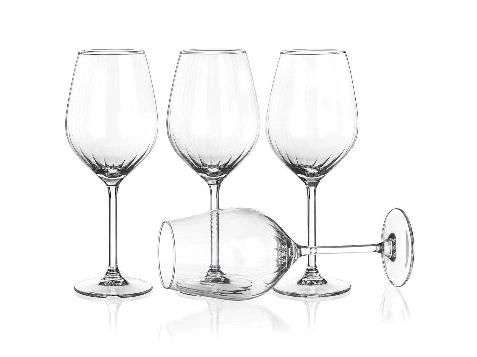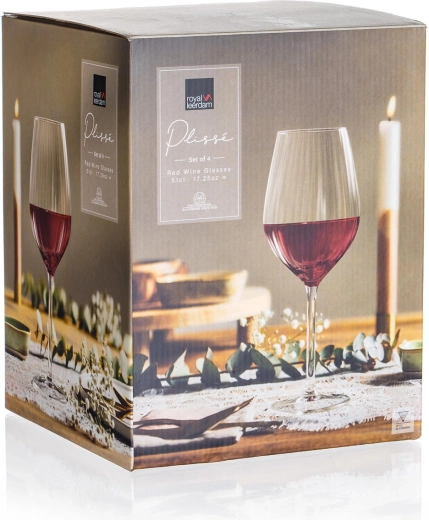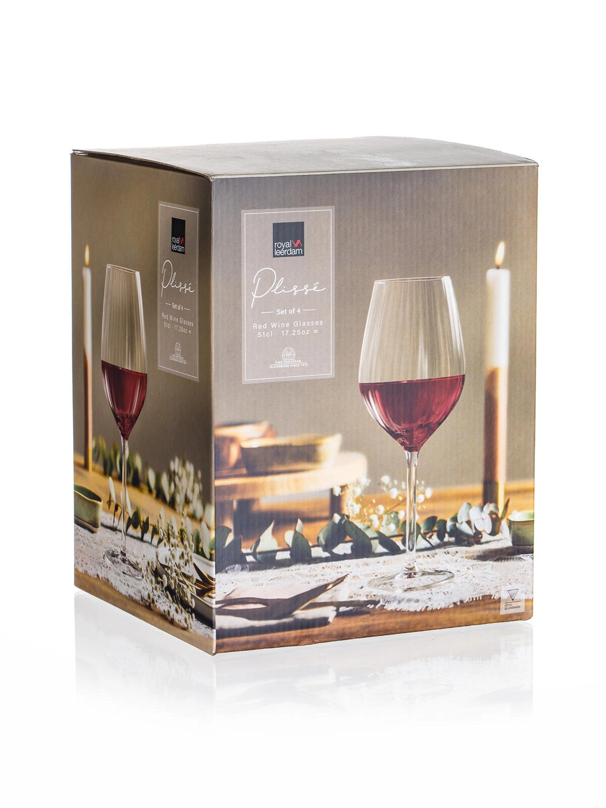 Elegancki zestaw czterech kieliszków do wina z kolekcji Plissè marki ROYAL LEERDAM oferuje idealną pojemność 510 ml, smukłą i wytrzymałą konstrukcję z hartowaną krawędzią oraz perfekcyjny kształt do aeracji czerwonego wina.