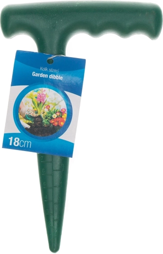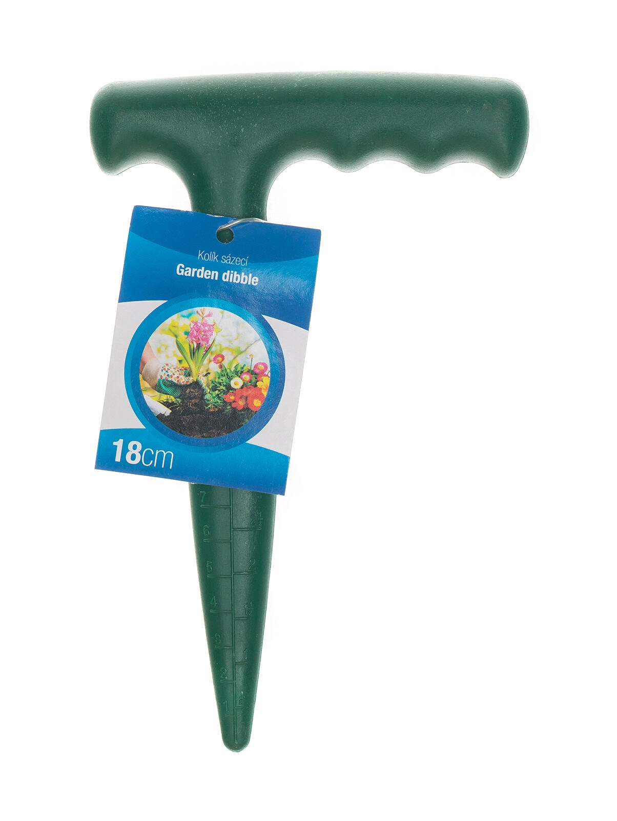 Praktyczny kołek do sadzenia do precyzyjnego i szybkiego sadzenia drobnych roślin w ogrodzie. Oferuje długość 18 cm z ostrzem 13 cm oraz podziałką w cm i calach dla łatwego mierzenia głębokości sadzenia.
