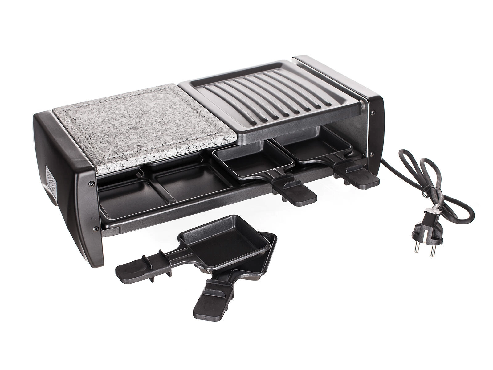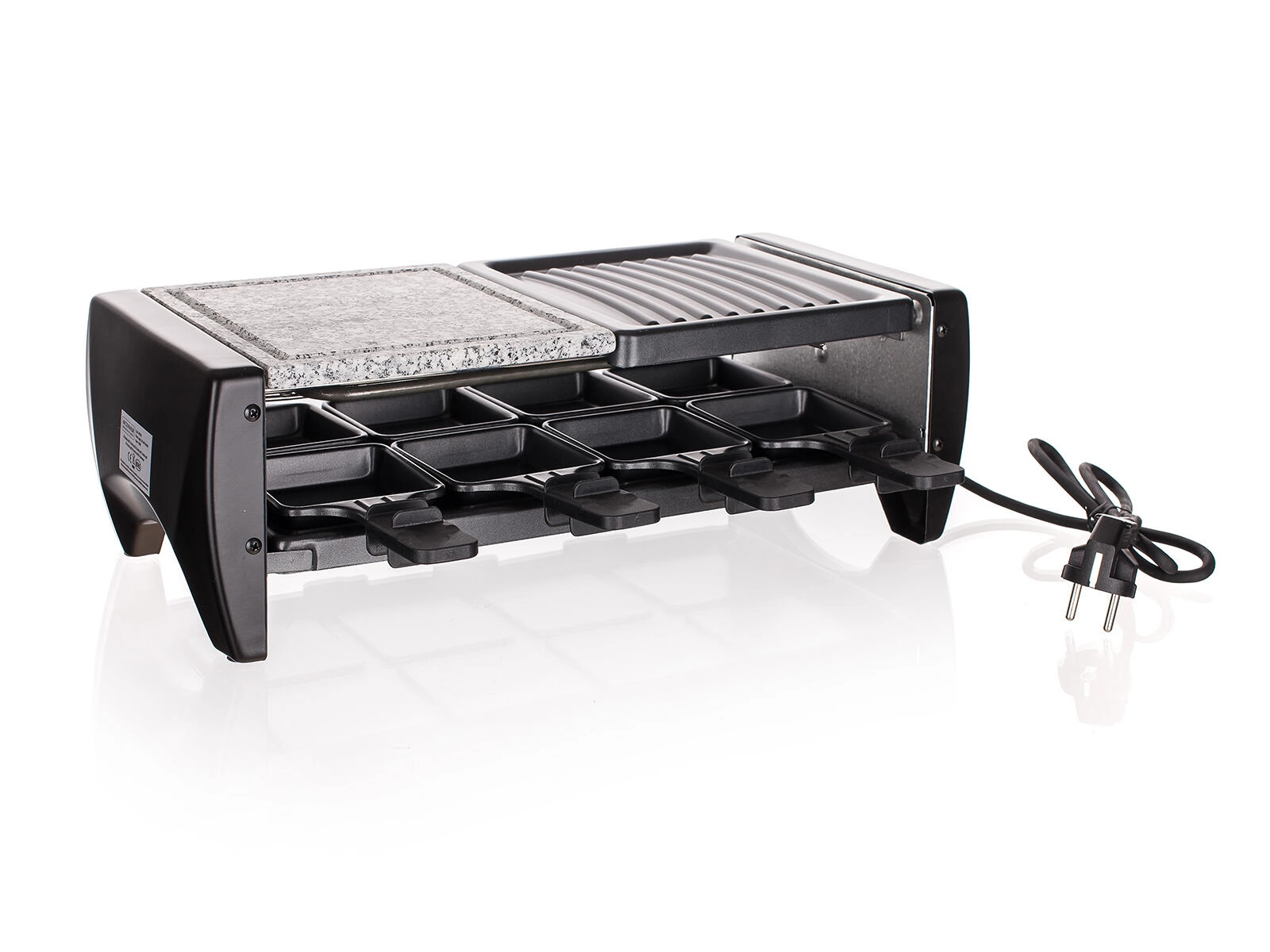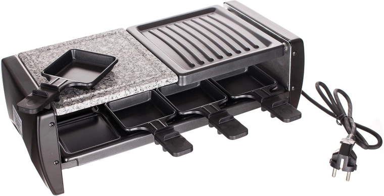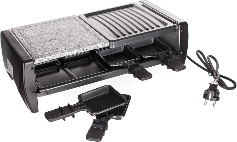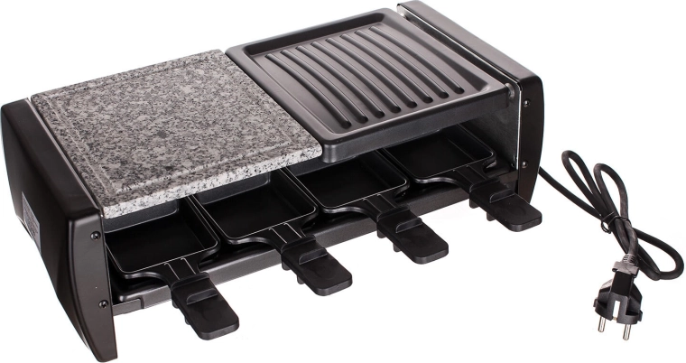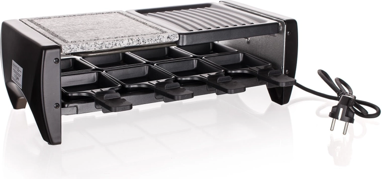 Grill raclette zamieni każde spotkanie w wyjątkowe przeżycie: połączenie płyty kamiennej do delikatnego pieczenia oraz ryflowanej płyty dla charakterystycznych pasków grillowych jest idealne do mięsa, ryb, warzyw i serów. Dzięki płynnie regulowanemu termostatowi z łatwością ustawisz optymalną temperaturę dla każdego rodzaju składników.