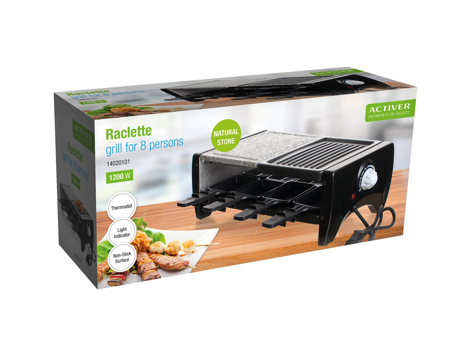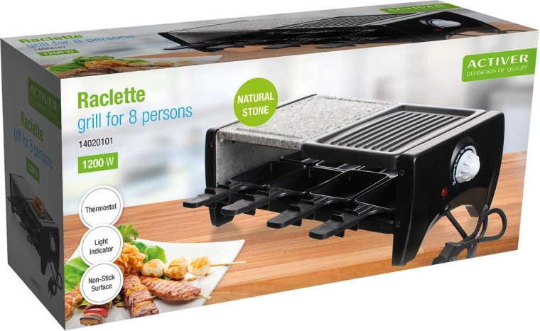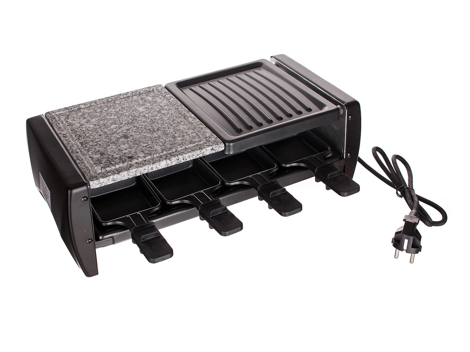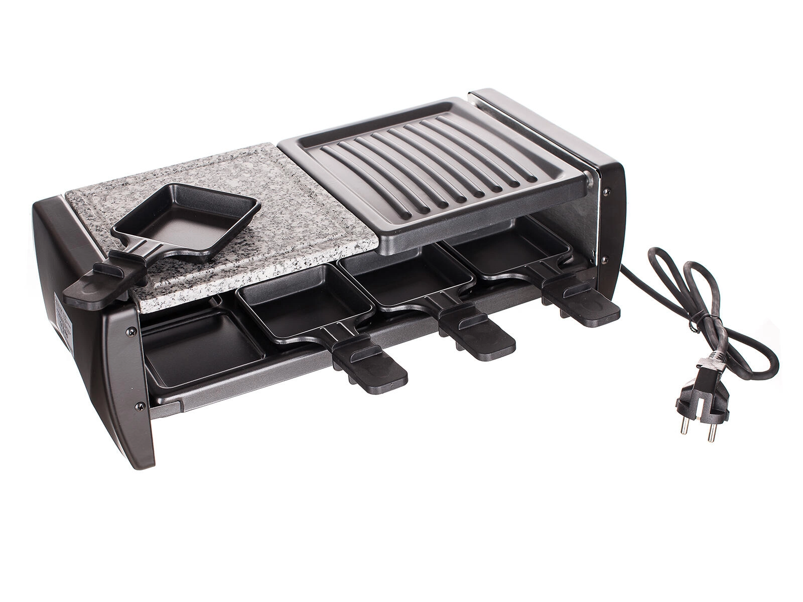 Grill raclette zamieni każde spotkanie w wyjątkowe przeżycie: połączenie płyty kamiennej do delikatnego pieczenia oraz ryflowanej płyty dla charakterystycznych pasków grillowych jest idealne do mięsa, ryb, warzyw i serów. Dzięki płynnie regulowanemu termostatowi z łatwością ustawisz optymalną temperaturę dla każdego rodzaju składników.