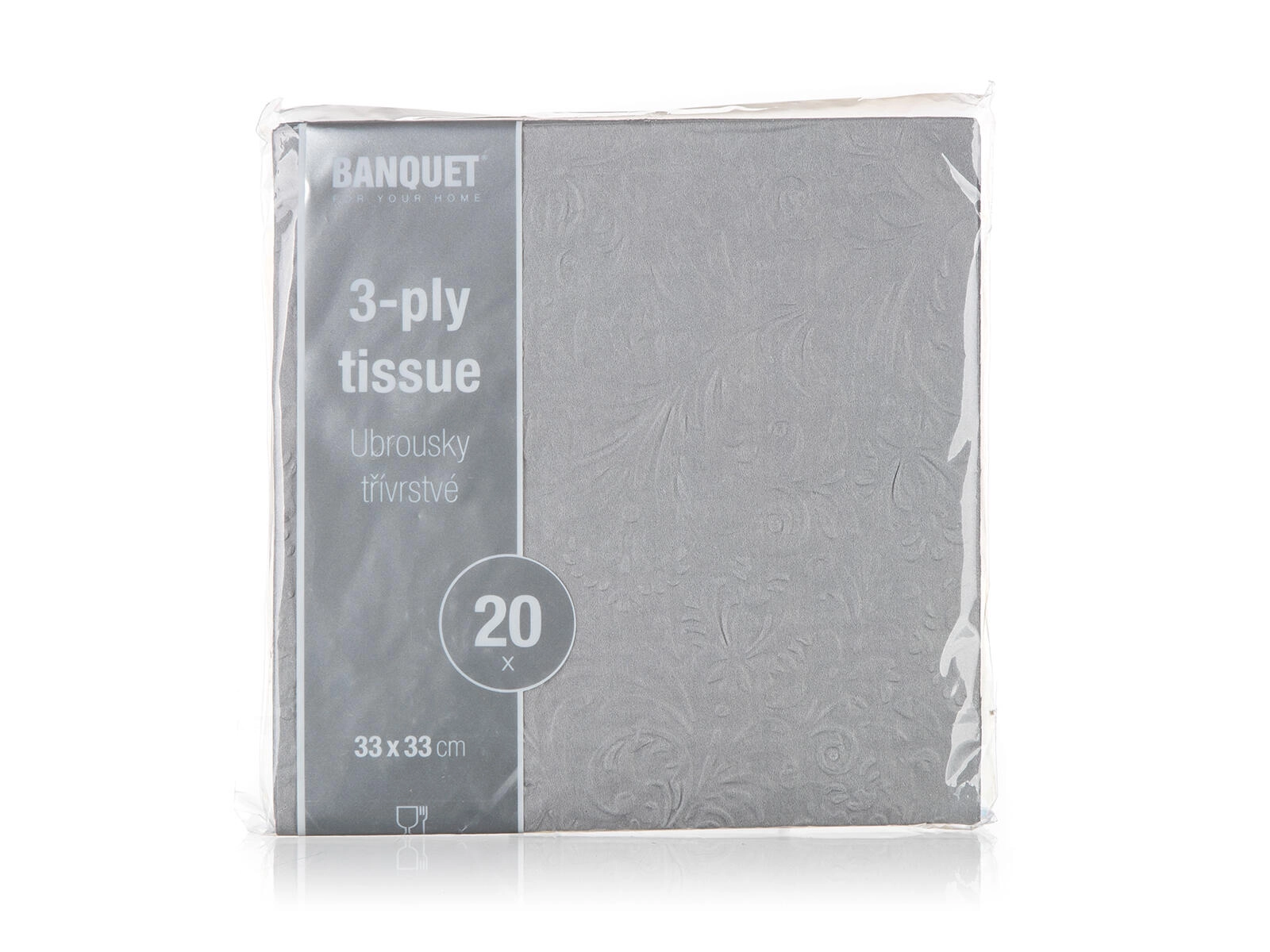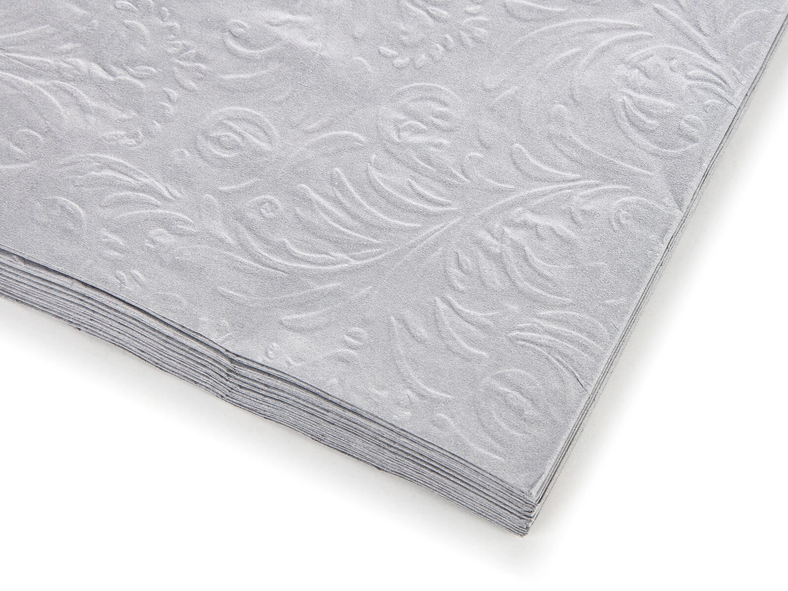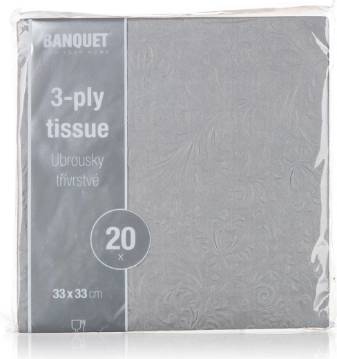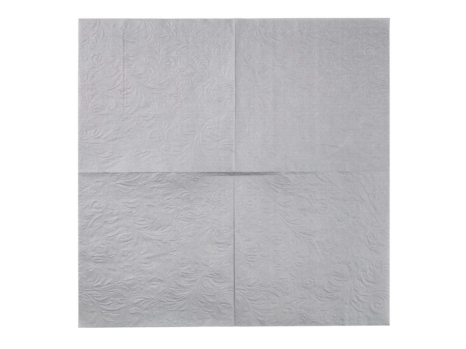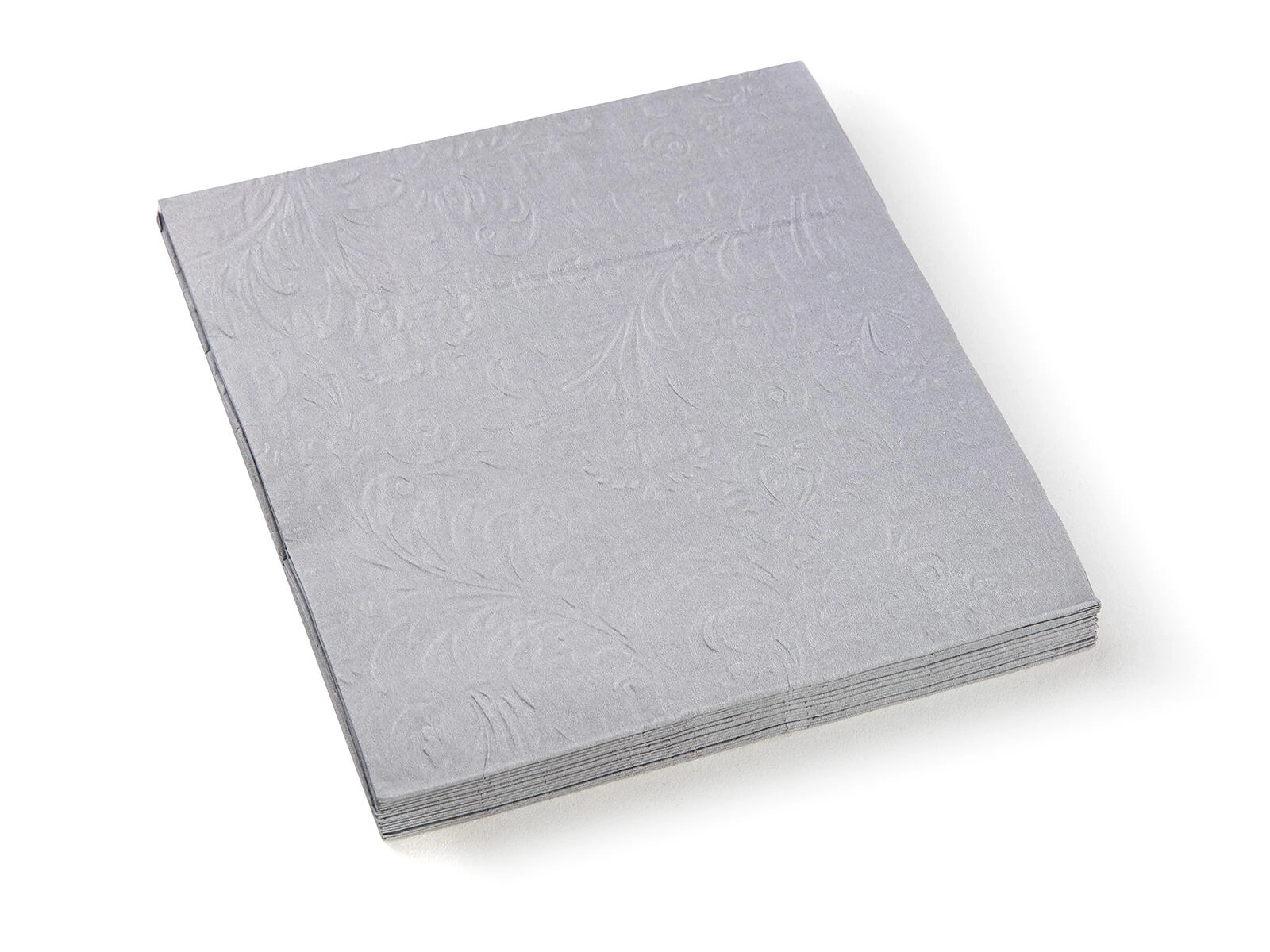 Udoskonal nakrycie stołu szarymi serwetkami z eleganckim tłoczeniem, które nadadzą posiłkom premium wygląd. Dzięki 3 warstwom są przyjemne w dotyku, trwałe i niezawodnie poradzą sobie z drobnymi zabrudzeniami oraz rozlanymi kroplami. Uniwersalny rozmiar 33 × 33 cm sprawdzi się do obiadu, kolacji i przekąsek na przyjęciach.