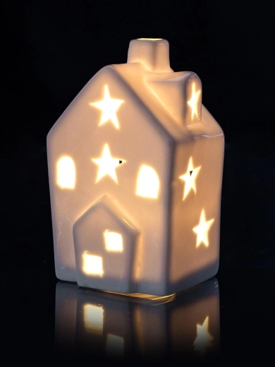 Elegancki porcelanowy domek z wbudowanym oświetleniem LED tworzy przyjemną i przytulną atmosferę w każdym wnętrzu. Migoczące białe światło wiernie naśladuje płomień świecy, a jednocześnie jest bezpieczne i energooszczędne. W zestawie znajduje się żarówka LED i bateria, więc dekorację możesz użyć od razu.