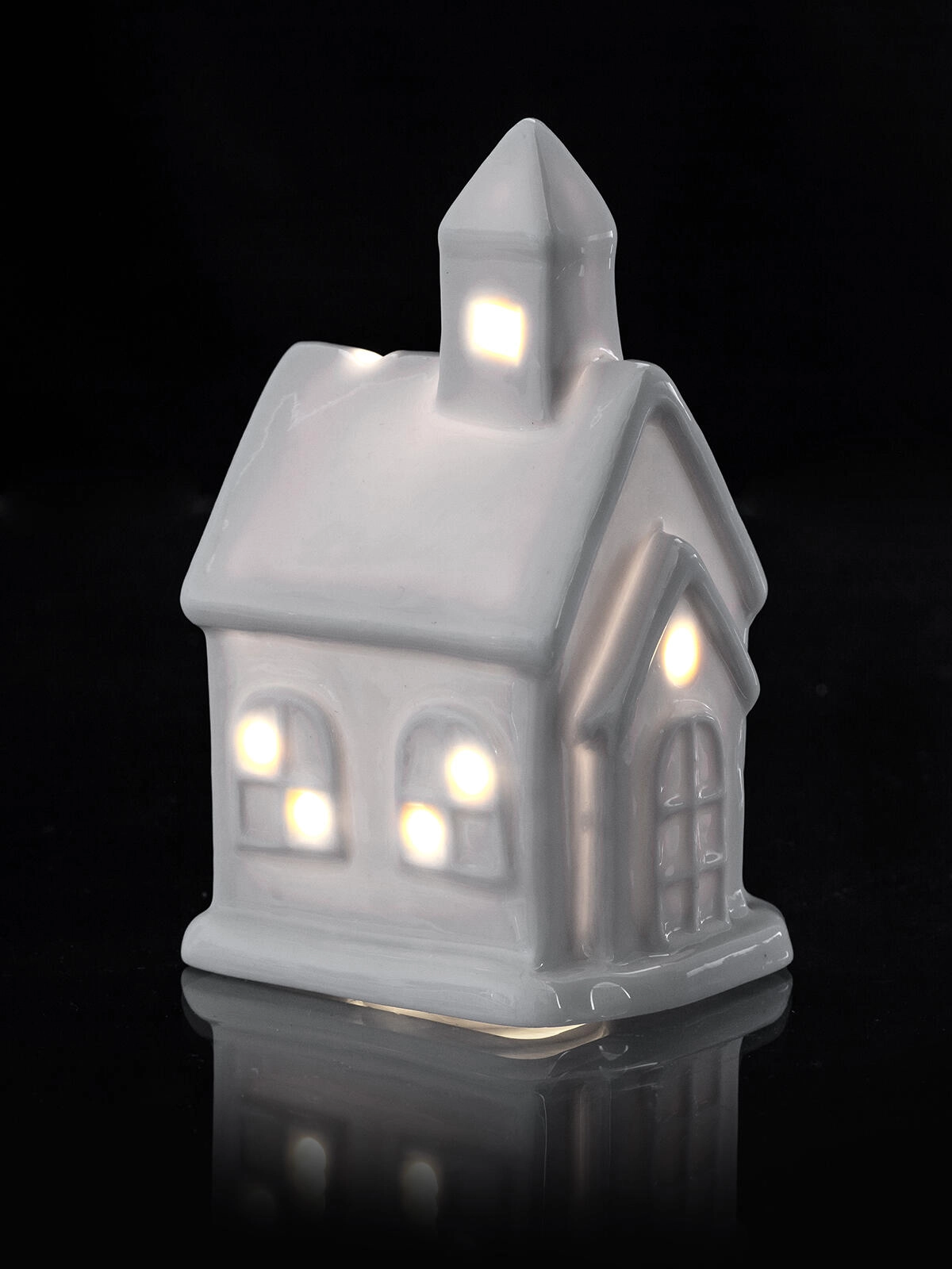 Elegancki porcelanowy domek z oświetleniem LED w białym kolorze tworzy przytulną atmosferę i delikatne migoczące światło jak świeca. Doskonale pasuje do salonu, sypialni lub jako świąteczna dekoracja. W zestawie znajdują się baterie oraz żarówka LED, dzięki czemu dekoracja jest gotowa do użycia od razu.