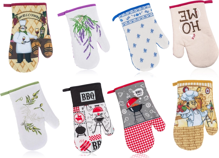 Praktyczna bawełniana rękawica kuchenna o wymiarach 27 × 17 cm, w atrakcyjnym mixie dekorów. Zapewnia niezawodną ochronę przed wysoką temperaturą, wygodnie leży w dłoni i jest idealna do codziennego pieczenia i gotowania.