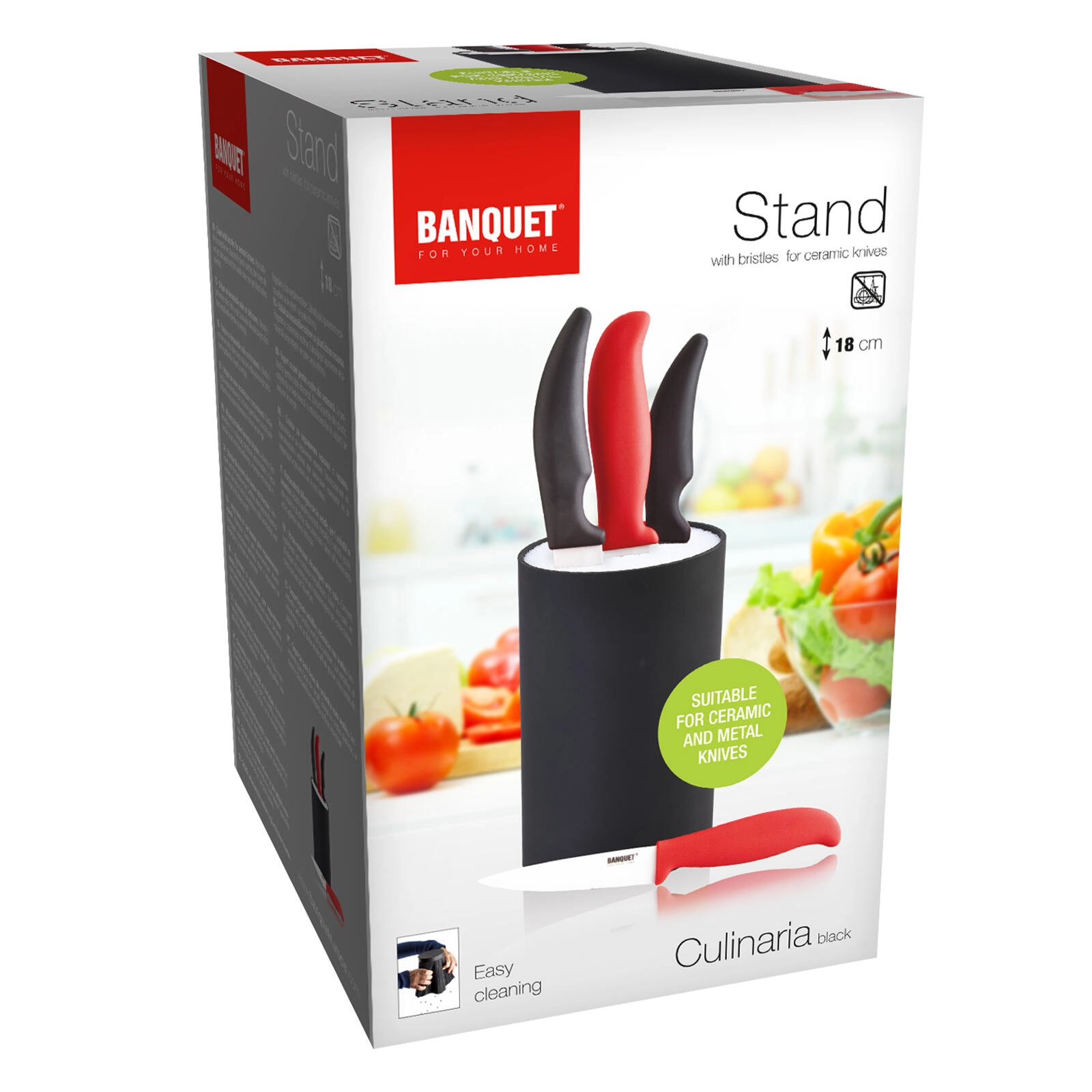 Elegancki stojak na noże CULINARIA Black sprawi, że Twoje noże kuchenne i ceramiczne będą zawsze pod ręką i bezpiecznie przechowywane. Ma kompaktowe wymiary, średnicę 11 cm i wysokość 18 cm, oraz wyjmowaną plastikową wkładkę ze szczecinami dla delikatnego wsuwania ostrzy. Wytrzymałe wykonanie z polipropylenu i uniwersalny czarny kolor pasują do każdej kuchni.