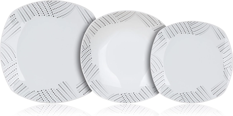 • Nowoczesny design – kwadratowe talerze z zaokrąglonymi krawędziami i subtelny wzór na brzegu.