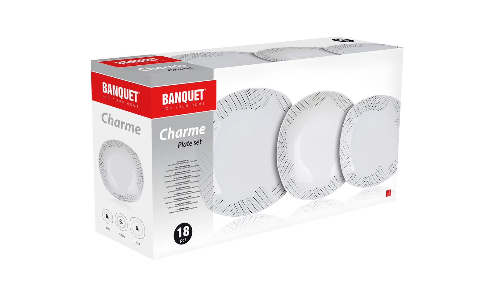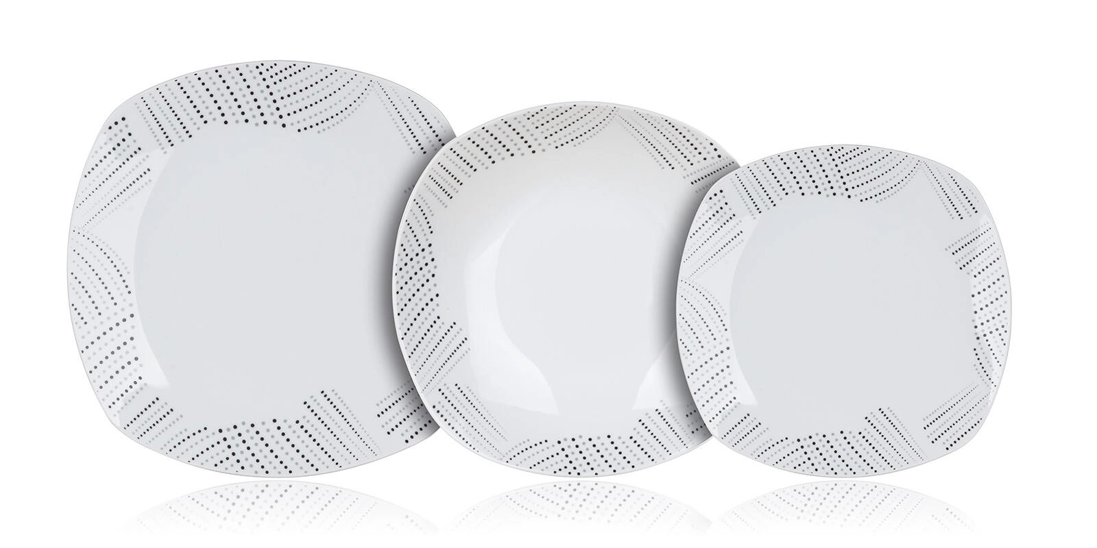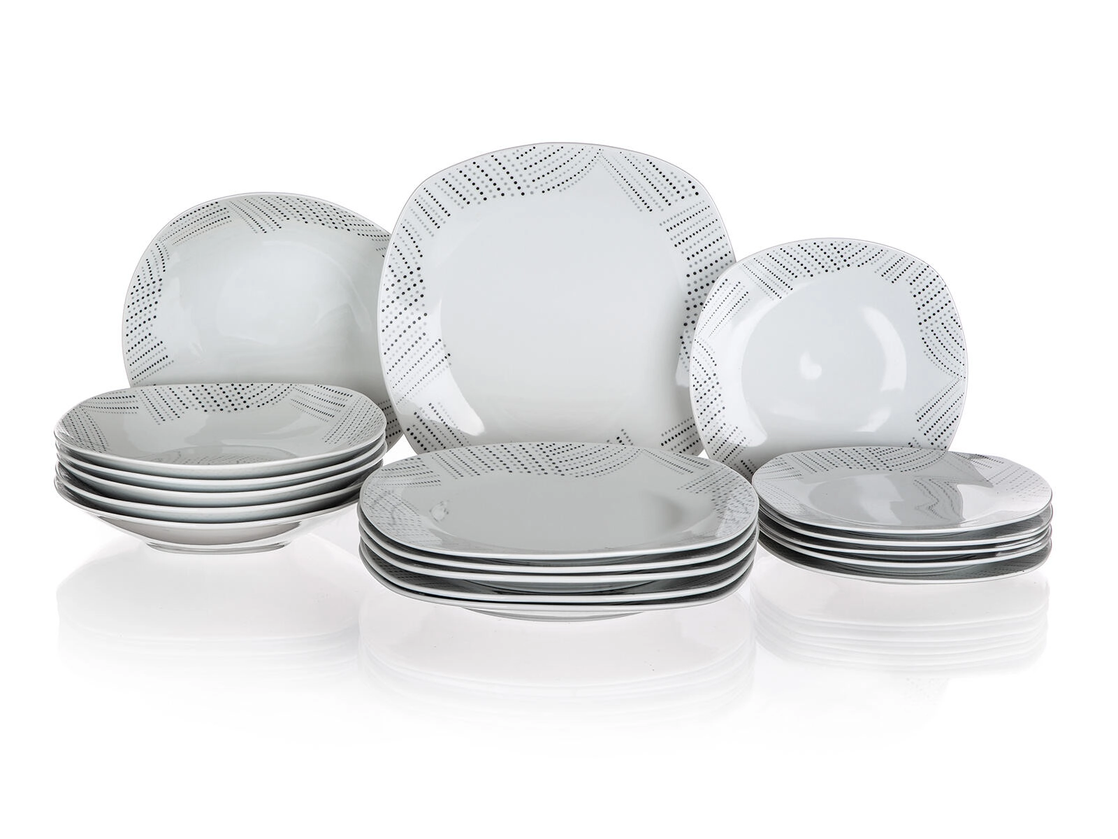Elegancki porcelanowy zestaw obiadowy BANQUET Charme Square dla 6 osób łączy nowoczesny design z kwadratowym kształtem o zaokrąglonych rogach oraz subtelnym kropkowanym wzorem na brzegach. Nadaje się do zmywarki i kuchenki mikrofalowej, idealny na co dzień i na uroczyste okazje.