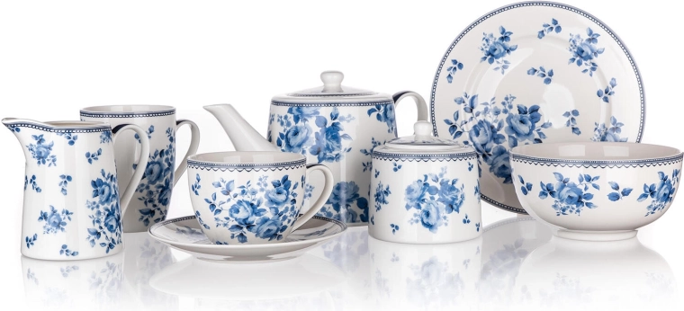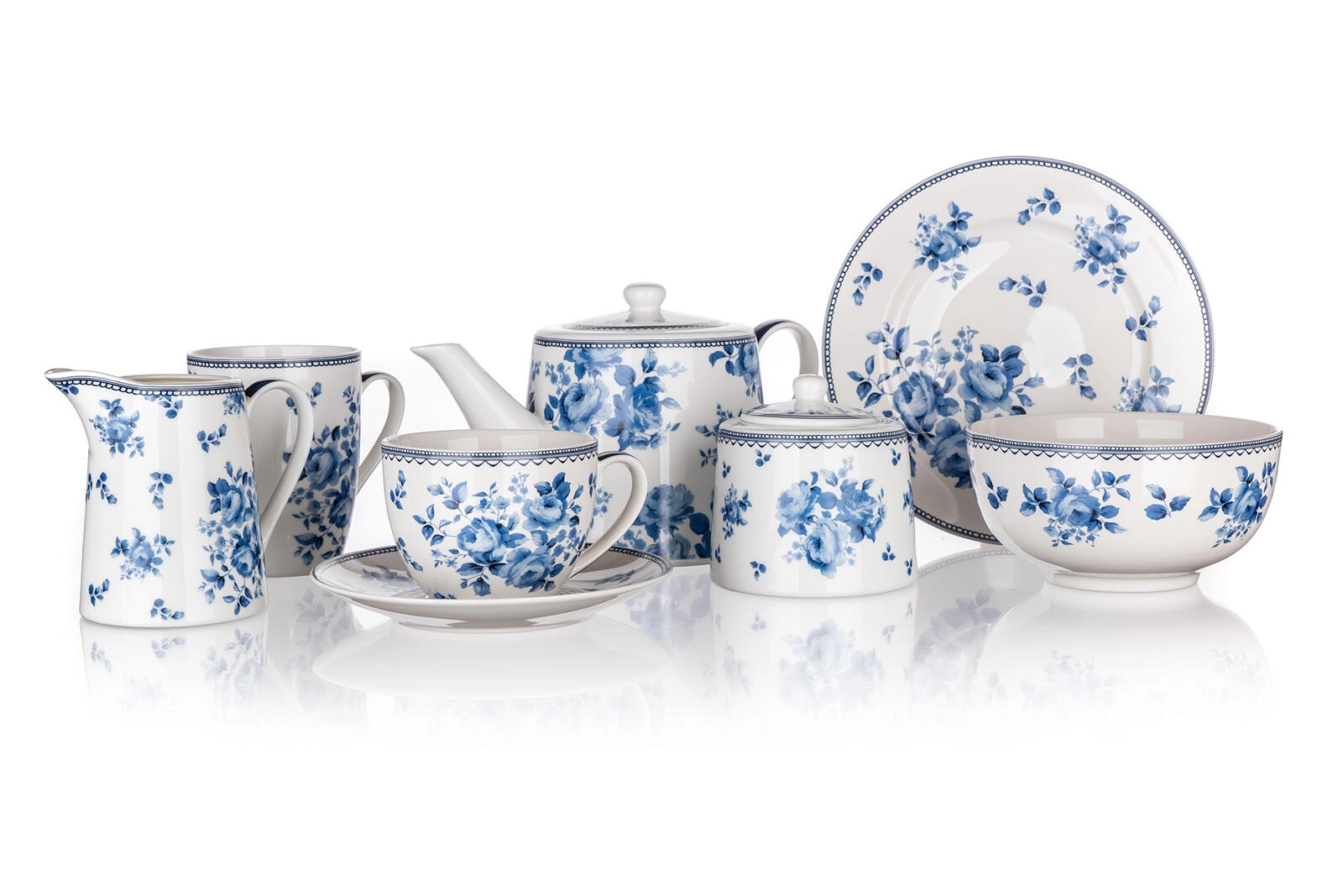 Białe szkliwo z niebieskim, roślinnym dekorem Blue Flower prezentuje się elegancko i łatwo komponuje się z inną zastawą oraz odświętnym nakryciem stołu.