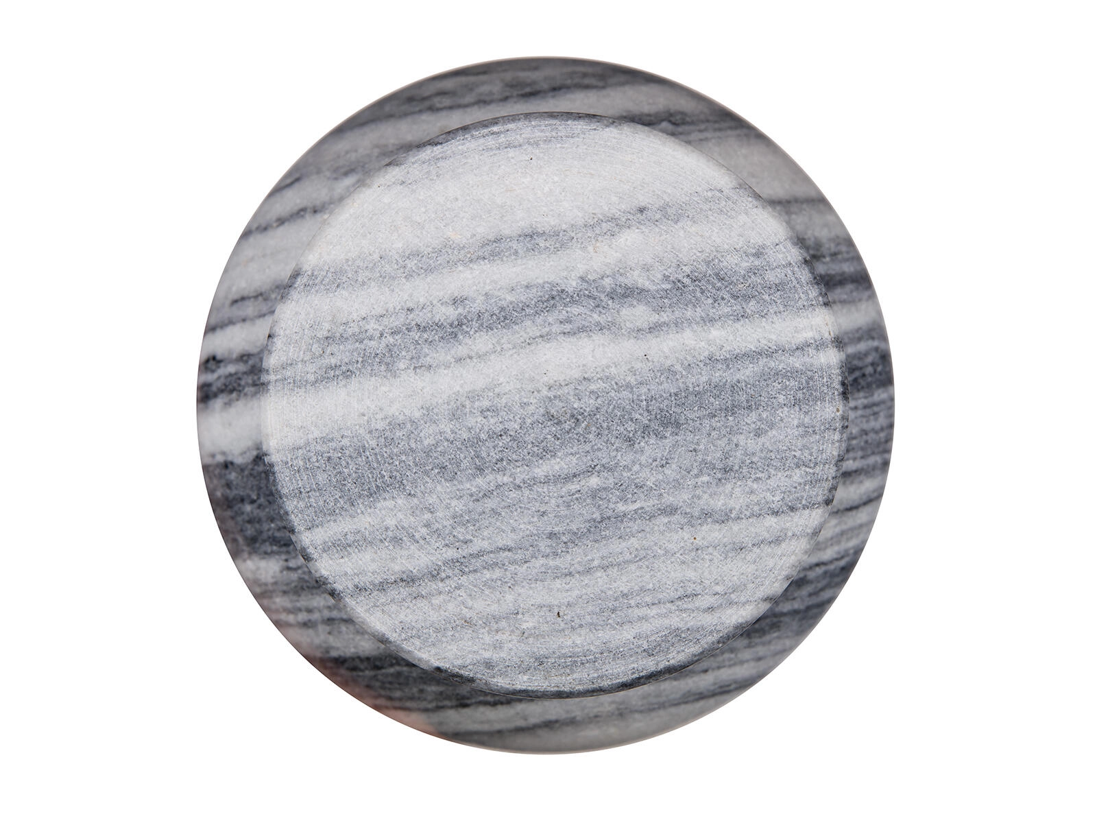 Naturalne żyłkowanie marmuru sprawia, że moździerz jest nie tylko praktycznym narzędziem, lecz także elegancką dekoracją na blacie kuchennym.