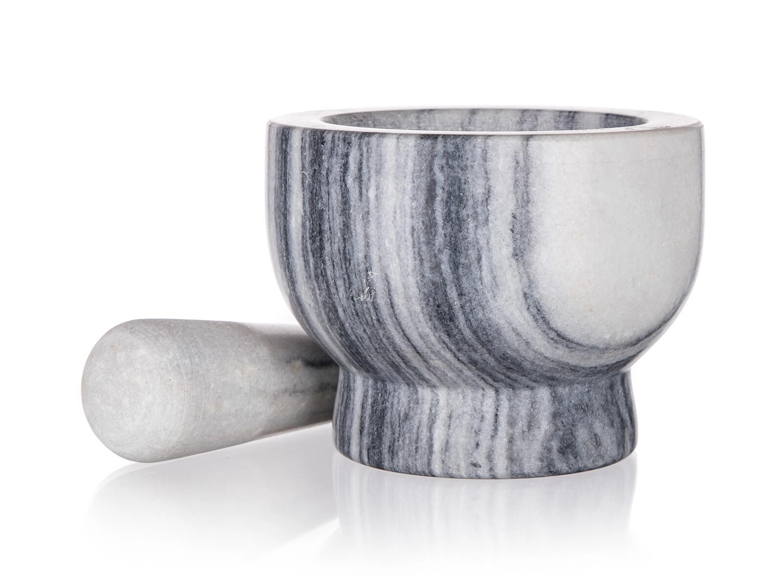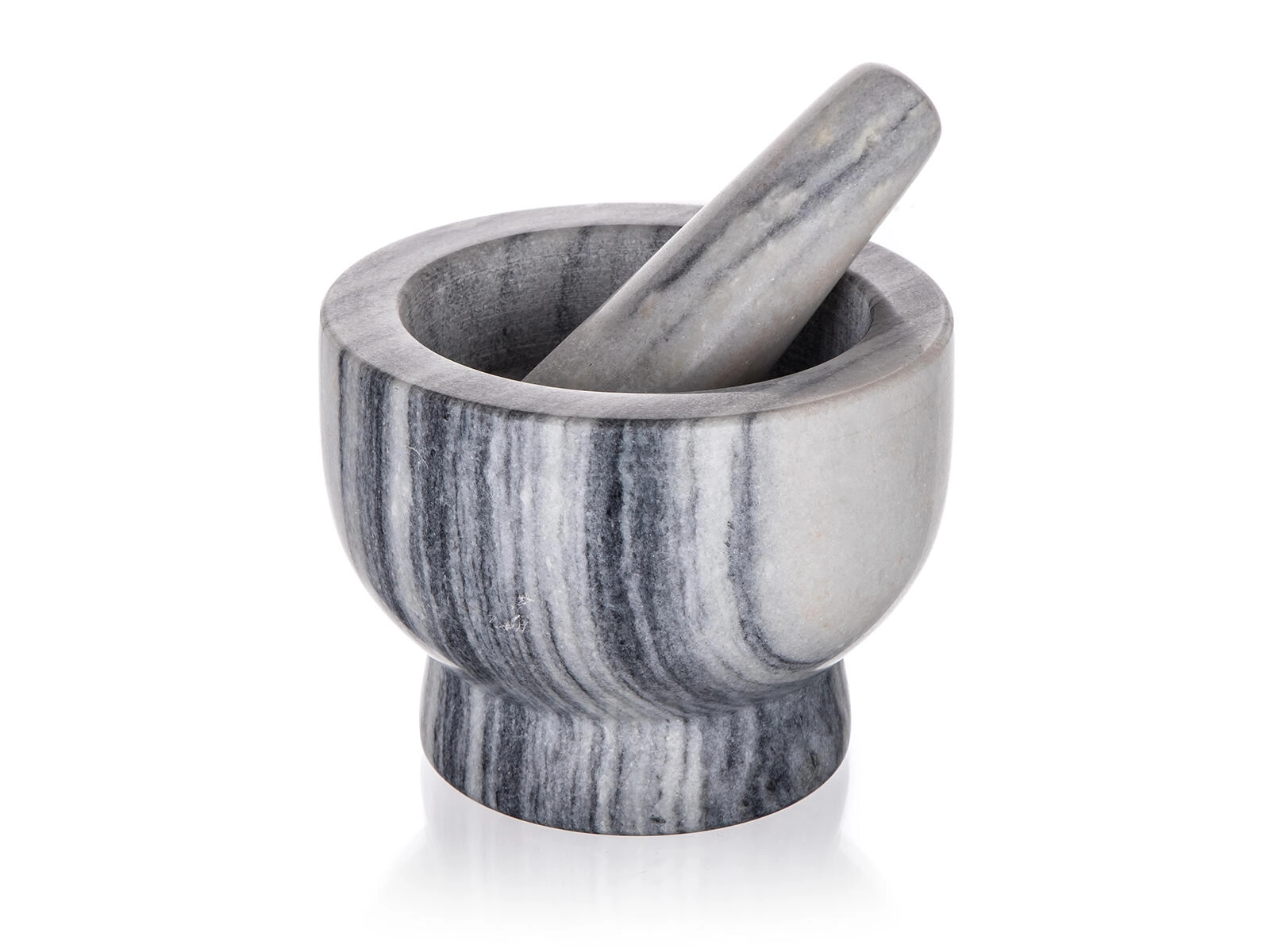Moździerz doskonale sprawdzi się do przygotowania pesto, past i mieszanek przypraw. Dzięki ponadczasowemu wyglądowi marmuru pasuje do każdej kuchni i stanie się zarówno praktycznym pomocnikiem, jak i dekoracyjnym elementem na blacie roboczym.