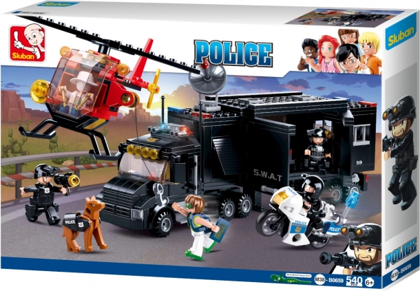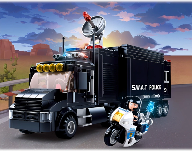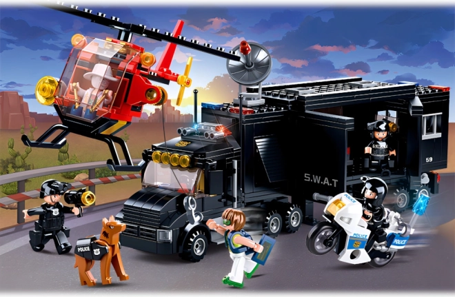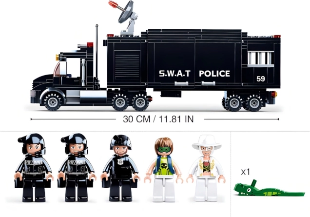 Dominantą zestawu jest czarna ciężarówka SWAT – mobilna baza z realistycznymi detalami, która służy jako centrala wszystkich policyjnych akcji. Idealna do taktycznych przemieszczeń i planowania akcji.