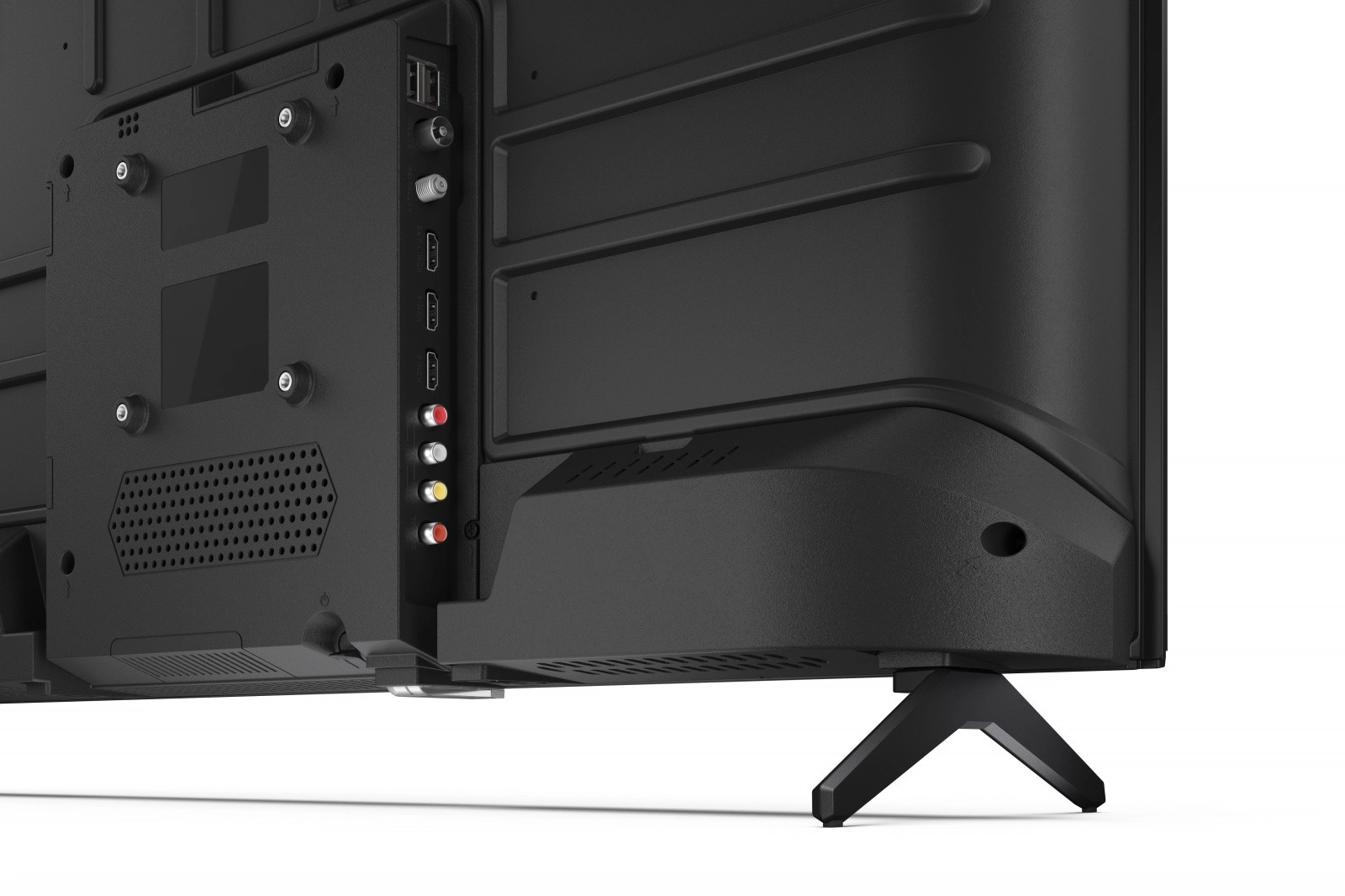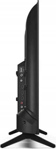 Praktyczny zestaw złączy – HDMI, USB, AV oraz wyjście audio – umożliwia łatwe podłączenie konsoli, dekodera, soundbara lub dysku USB z filmami i muzyką. Stabilne podwójne nóżki gwarantują bezpieczne ustawienie na meblach, a smukła konstrukcja oszczędza miejsce.